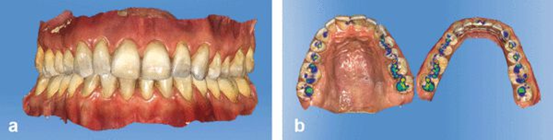 Während die ersten intraoralen Scanner noch umständlich in der Handhabung waren und beispielsweise vor dem Scan spezielle Puder in den Patientenmund eingebracht werden mussten, erreichen Kamera-basierte und Puder-freie Systeme mittlerweile Auflösungen von etwa 40 µm [Sun et al., 2018]. Sogar die ursprünglich empfohlenen Scanpfade können bei neueren Geräten in der Regel vernachlässigt werden [Medina-Sotomayor et al., 2018]. Bei vielen Programmen können zudem Kontaktpunkte direkt nach dem Bissregistrat virtuell angezeigt werden (Abbildung 1).