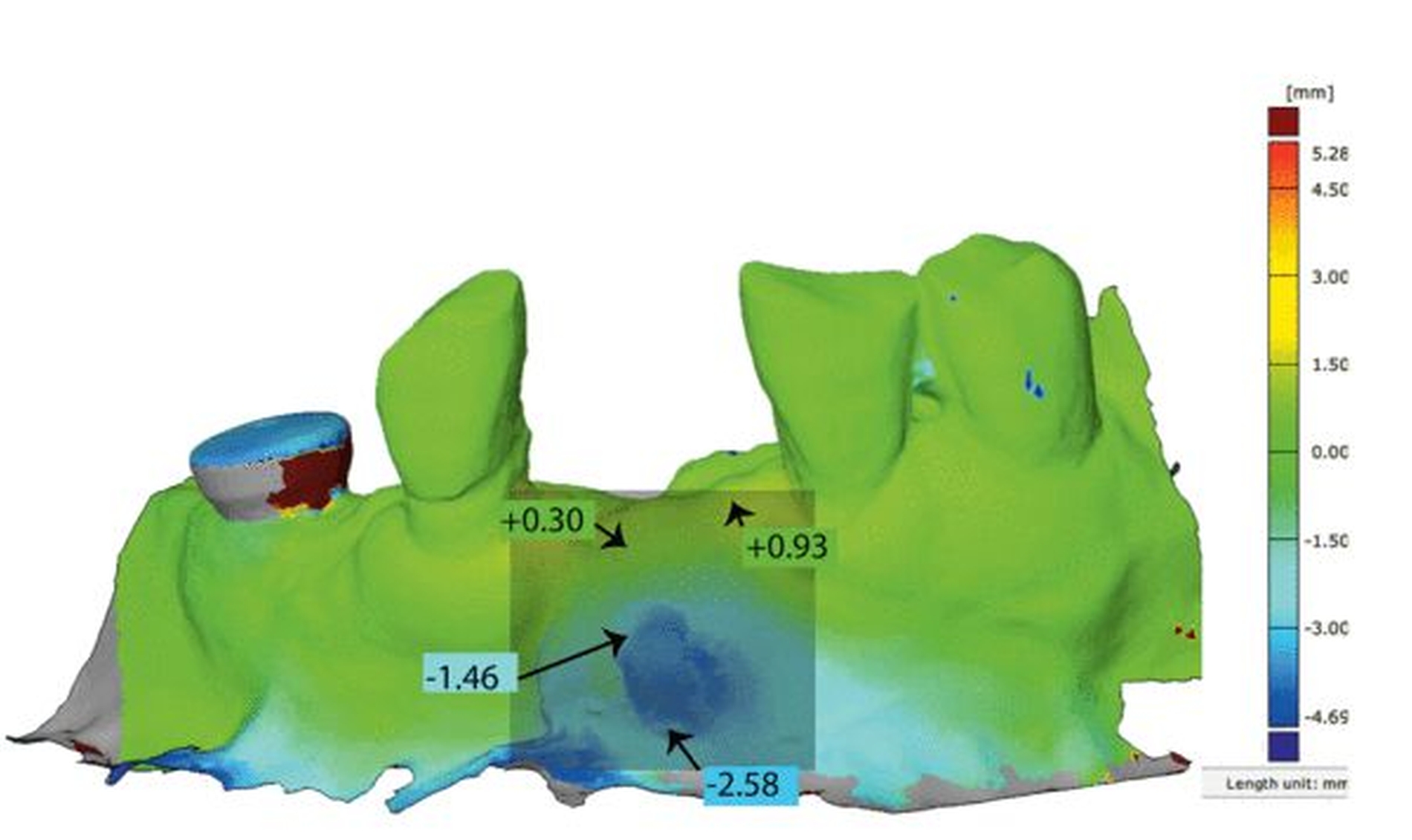 Eine weitere Nutzungsmöglichkeit intraoraler Scans besteht darin, Aufnahmen verschiedener Zeitpunkte zu überlagern, um Veränderungen quantifizieren zu können. Beispielsweise können nach einer Augmentation von Weichgewebe Volumenveränderungen erfasst und visualisiert werden (Abbildung 2).