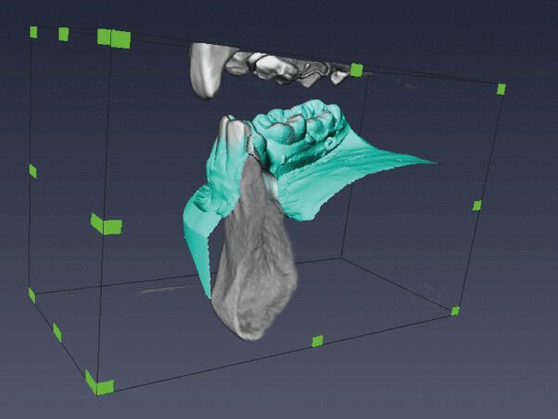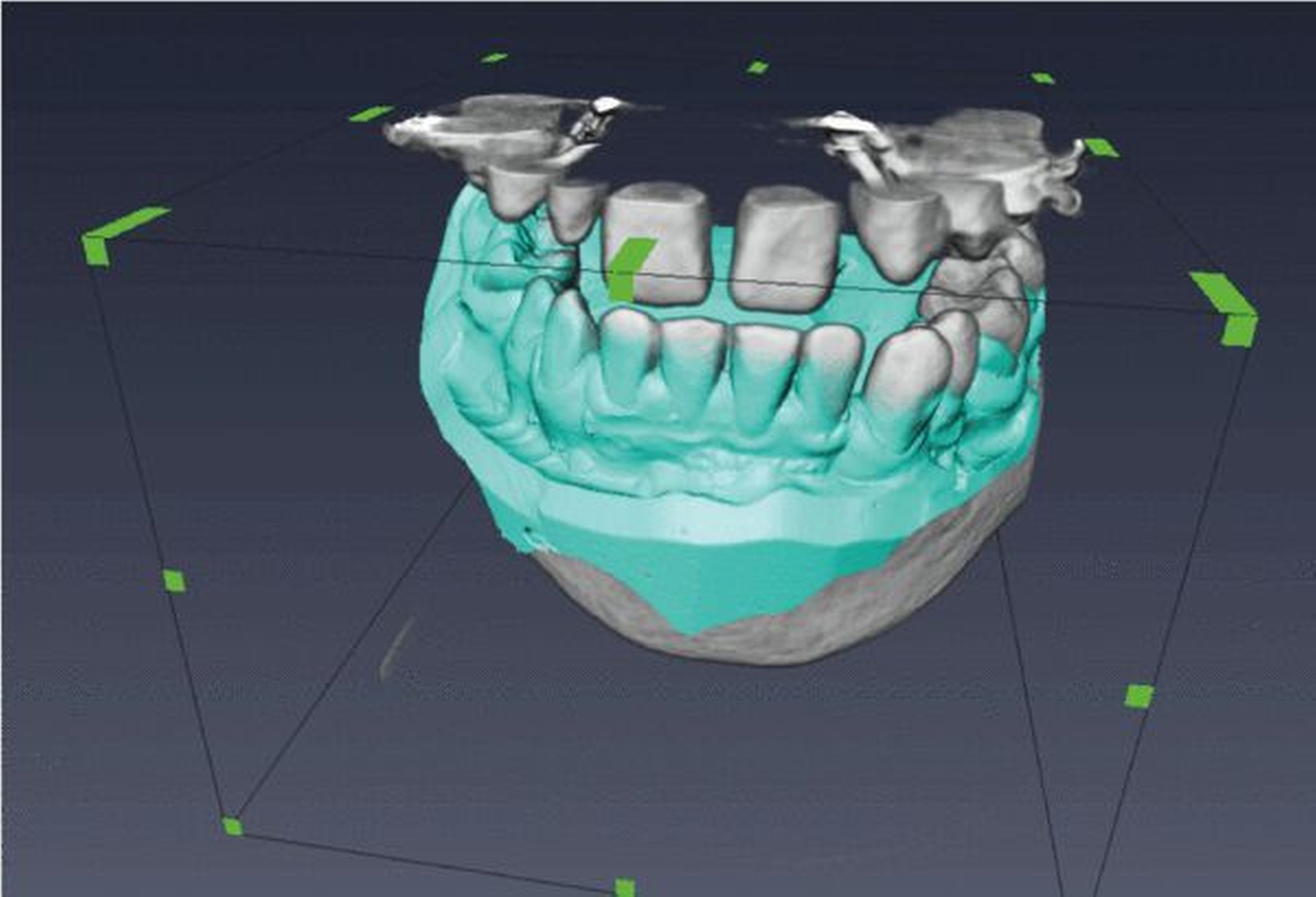 Möchte man eine wie in Abbildung 5 dargestellte Planung per Schablone auf den Patienten übertragen, ist eine Überlagerung (Matching) der DVT-Aufnahme mit einem digitalen Modell des Patienten erforderlich.