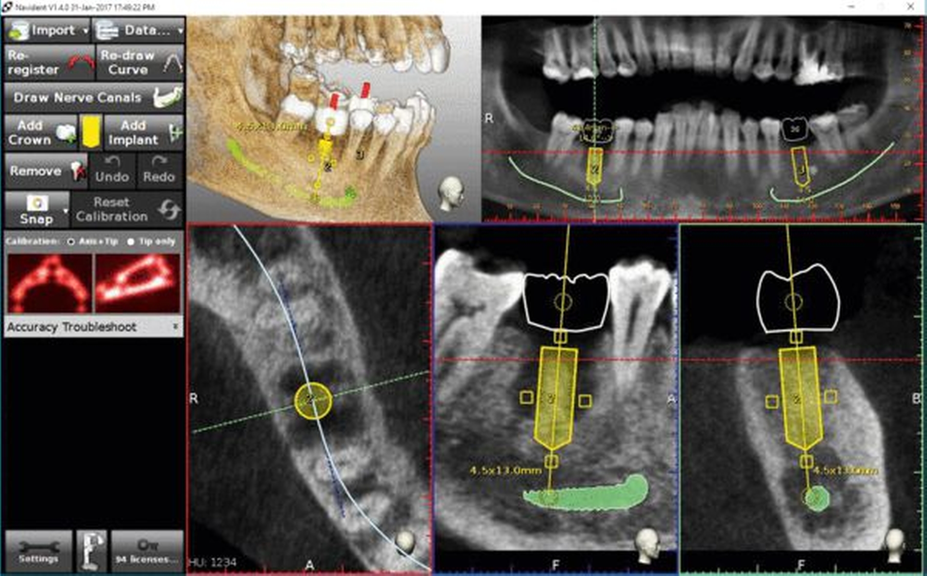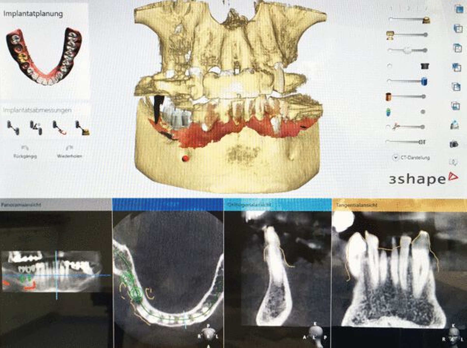Besonders im Unterkiefer besteht zudem die Gefahr einer lingualen Perforation bei Bohrung des Implantatbettes und Insertion des Implantats, da sich die Kortikalis in diesem Bereich typischerweise verjüngt. Aus diesem Grund kann die vorherige Simulation unter Berücksichtigung von Implantatlänge und -durchmesser sowie der anatomischen Gegebenheiten gerade für Einsteiger von Vorteil sein und das Komplikationsrisiko verringern.