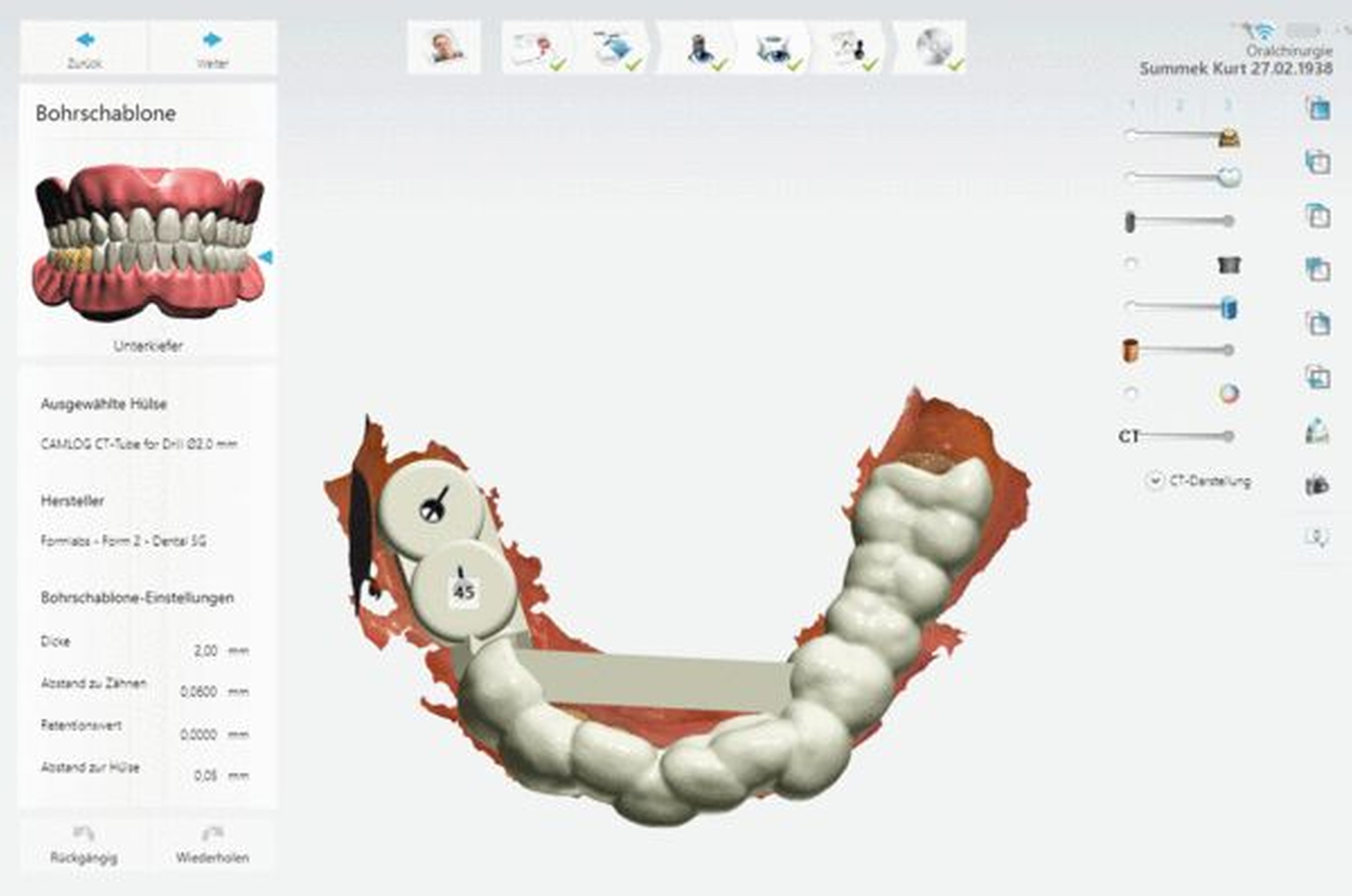 In Abbildung 7 ist dargestellt, wie die Position zweier Implantate digital geplant und im Anschluss eine Bohrschablone („partially guided“-Konzept) erstellt wurde. Nach dem 3-D-Druck der Schablone wurden Führungshülsen in der entsprechenden Position eingebracht.
