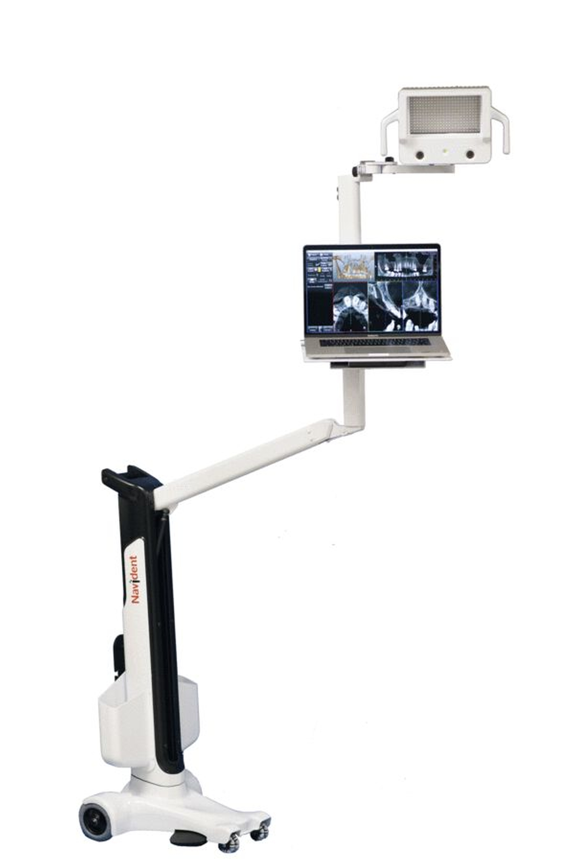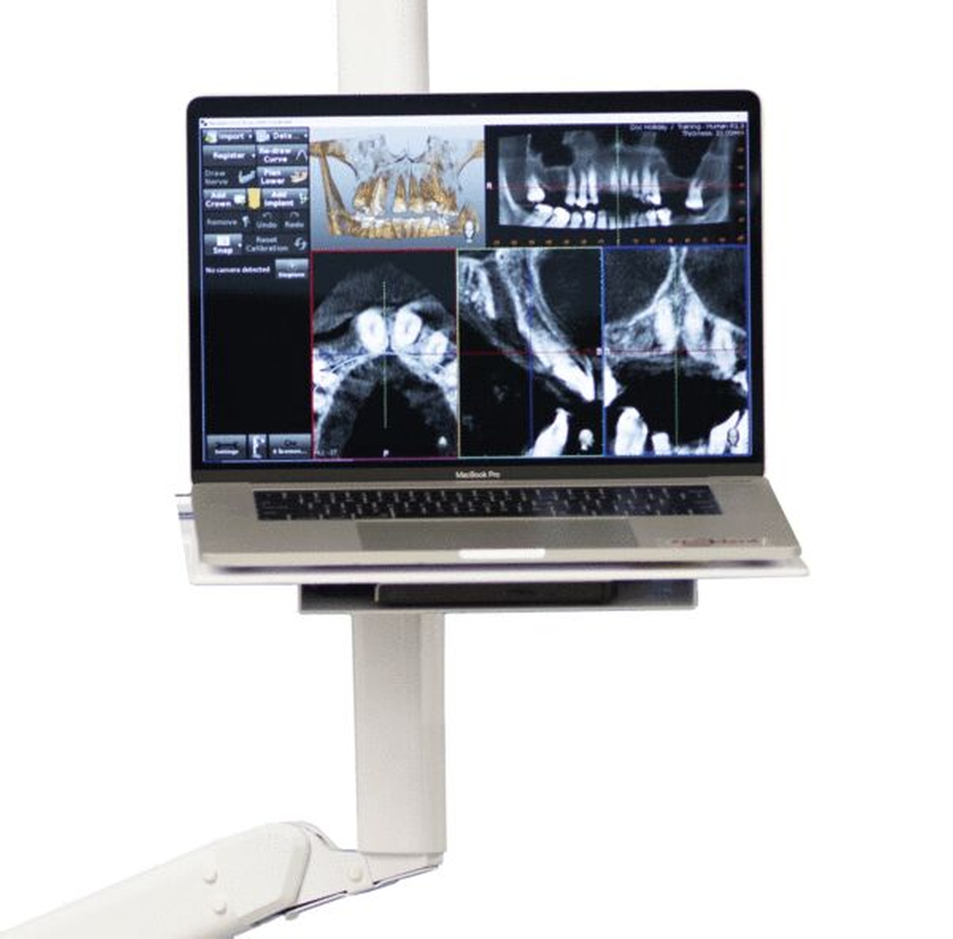Bei der navigierten Implantatinsertion wird das chirurgische Vorgehen ebenfalls mittels DVT (und gegebenenfalls einem gematchten digitalen Modell) geplant. Im Vergleich zum Template-basierten Ansatz wird jedoch keine Schablone gedruckt, sondern, wie in Abbildung 8 dargestellt, ein Computer im Operationsraum aufgestellt. Dieser zeigt kontinuierlich das DVT und die gewählte Implantatposition an. An den chirurgischen Instrumenten wird ein Matching-Tool (2-D-Referenz-Bild) befestigt, das sich im Field of View der 3-D-Kamera befinden sollte und über das die Position der Instrumente im Patientenmund permanent berechnet werden kann. Initial muss mindestens ein Instrument kalibriert werden, indem es an definierte dentale Referenzpunkte bewegt wird. Bewegt man ein chirurgisches Instrument an eine Position im Patientenmund, so werden die entsprechenden Schichten aus dem DVT in der entsprechenden Neigung interpoliert und auf dem PC angezeigt. Somit erhält der Behandler permanent einen Überblick, wie hoch das Knochenangebot in der entsprechenden Achse wäre.