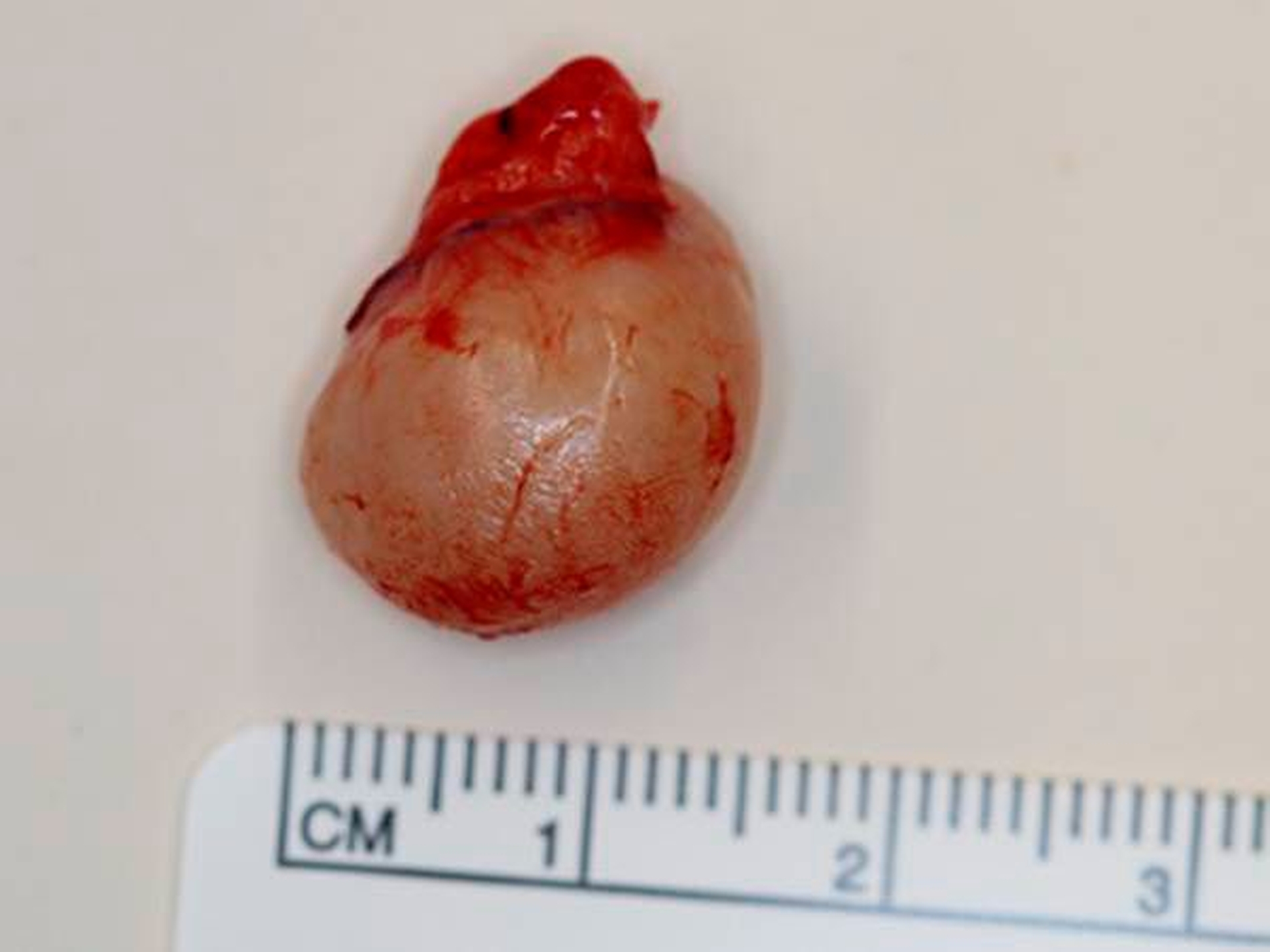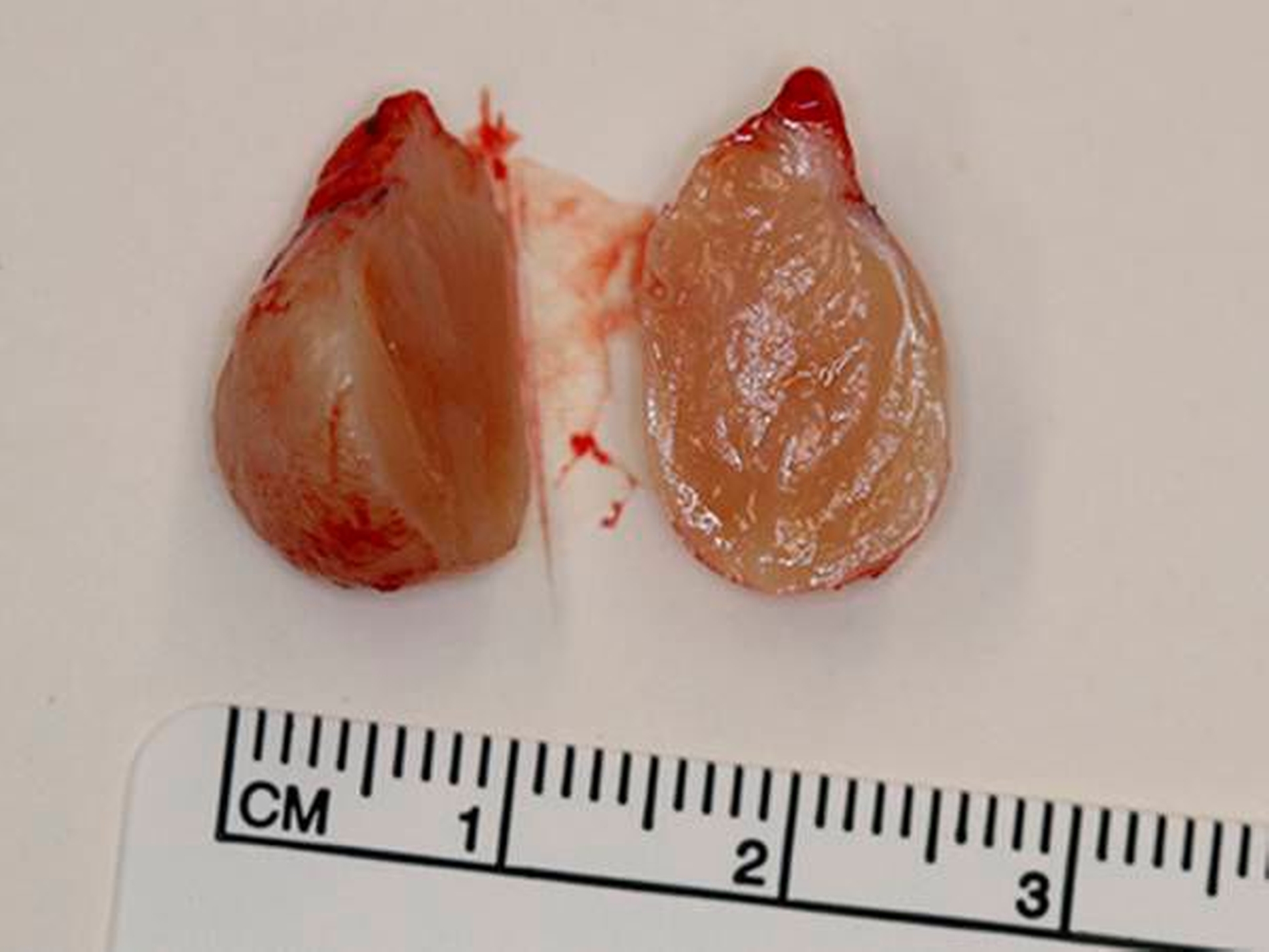 Nach Eröffnung des Befunds zeigte sich im Inneren homogenes Gewebe ohne flüssige Anteile (Abbildung 3).
