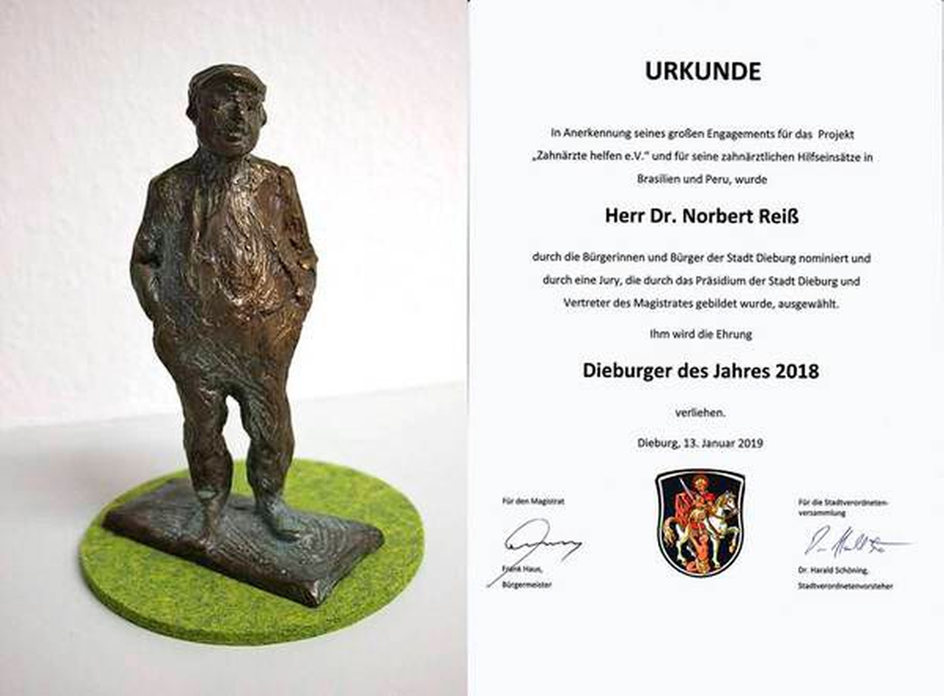 Seit 2009 konnten 561.500 Euro in Peru eingesetzt werden, davon waren 490.000 Euro reine Geldspenden – von Patienten und Zahnärzten. Diese Leistung hat nun auch Reiß‘ Heimatgemeinde gewürdigt. Die Bürger des 15.500-Einwohner-Städtchens nominierten ihn für den „Dieburger des Jahres 2018“, gewählt wurde er von einer Jury aus dem Präsidium der hessischen Kleinstadt und Vertretern des Magistrats. „Ich bin kein Freund von Orden, aber dass ich ,Dieburger des Jahres‘ geworden bin, der erste überhaupt, freut mich sehr“, sagte Reiß.