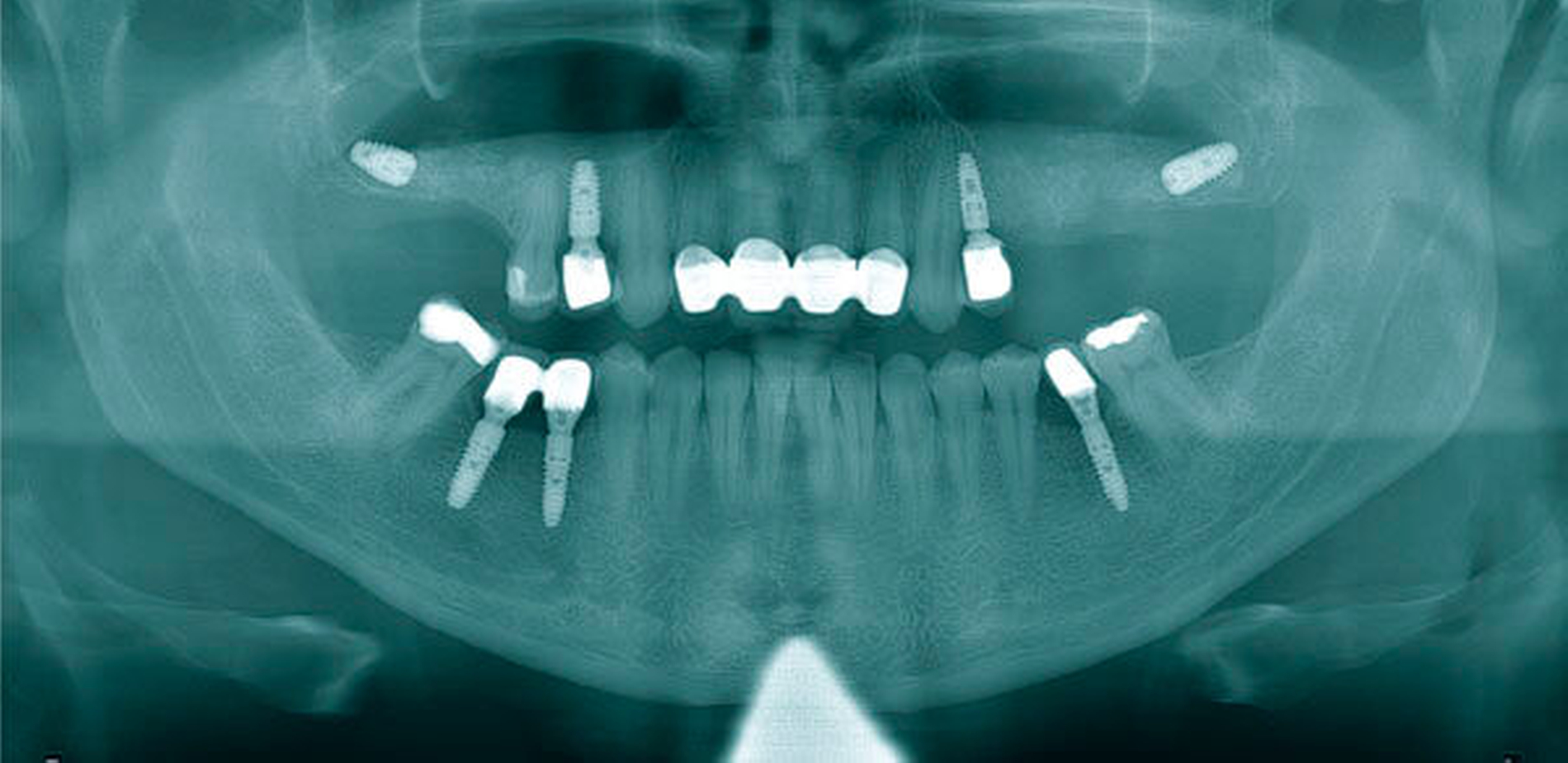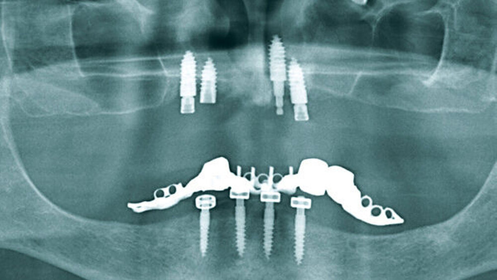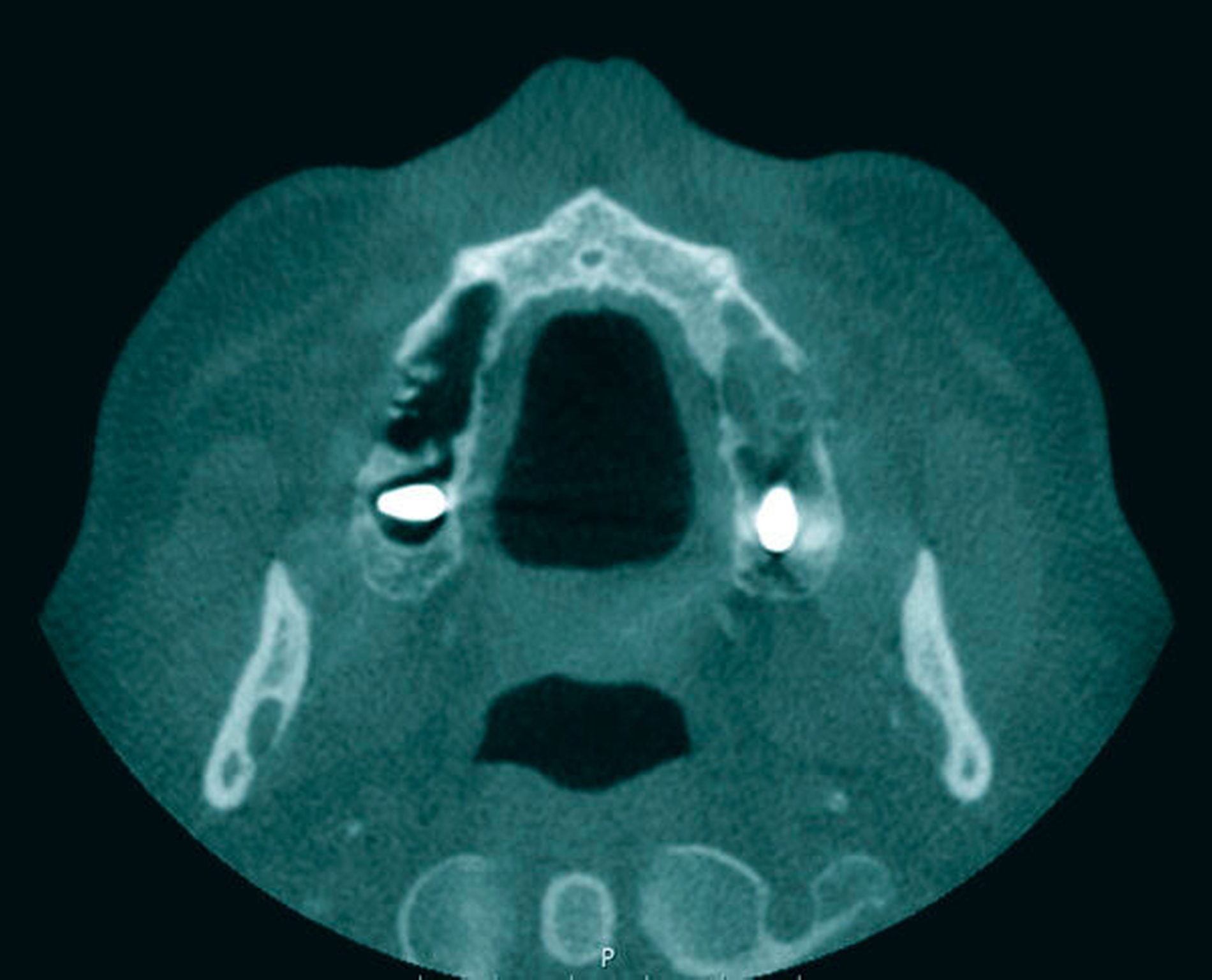 Bei der klinischen Untersuchung zeigten sich beide Kiefer totalprothetisch versorgt. Im Ober- und im Unterkiefer waren zur prothetischen Verankerung jeweils vier Implantate inseriert worden. In der durchgeführten Panoramaschichtaufnahme (PAN) zeigten sich alle Implantate osseointegriert. Zusammen mit den klinischen Befunden ergab sich kein Hinweis auf eine Periimplantitis oder einen weiteren Infektfokus. Die im Bereich des linken Sinus maxillaris nebenbefundlich festgestellte Opazität erweckte den Verdacht auf das Vorliegen eines metallenen Fremdkörpers in Form eines dentalen Implantats (Abbildung 1).
