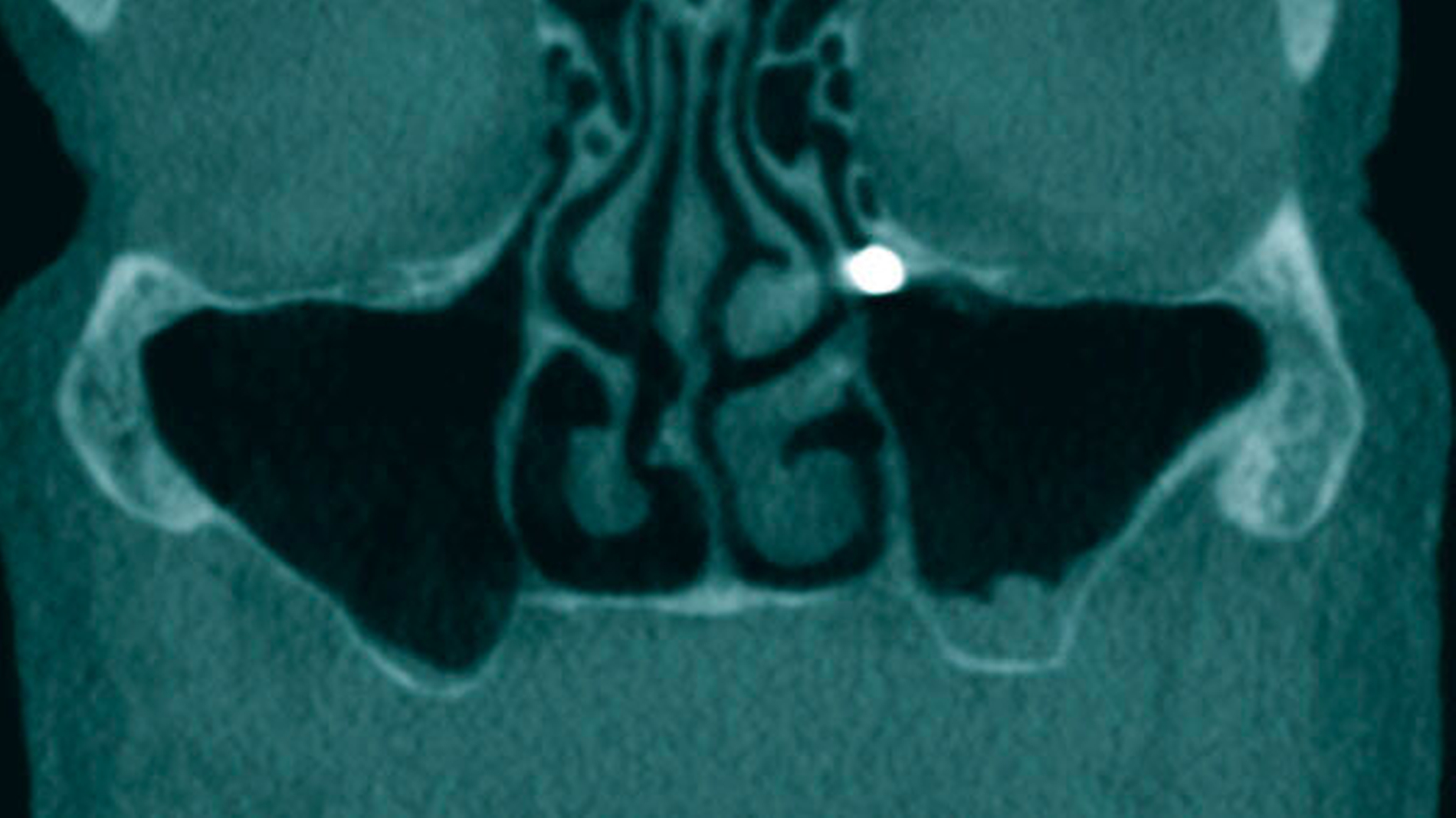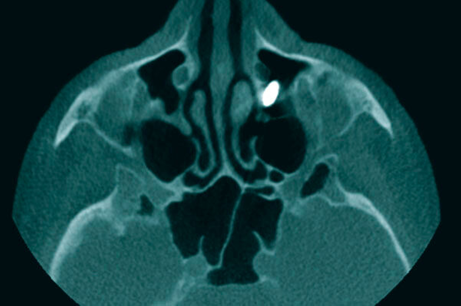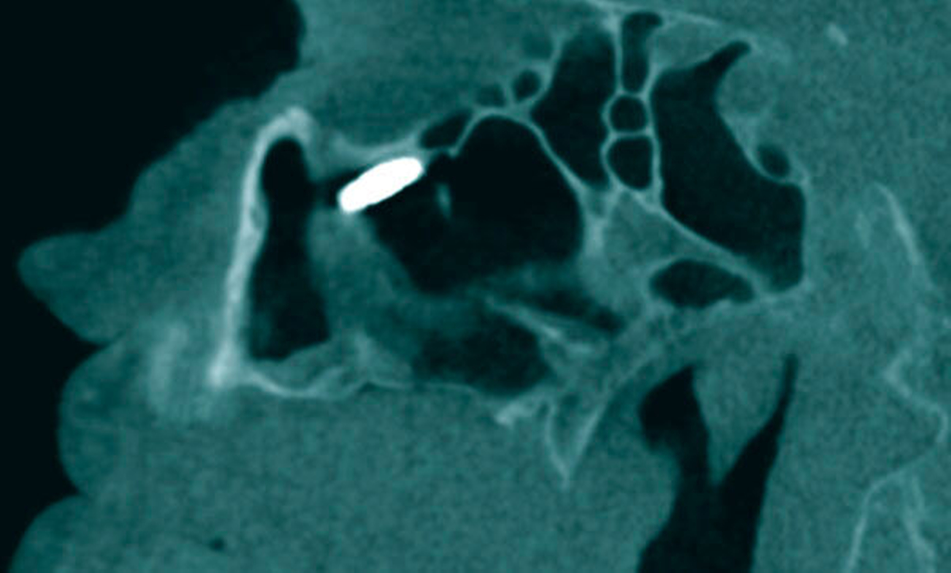 Zur weiteren Diagnostik und zur Beurteilung der Lage des Fremdkörpers wurde eine Digitalen Volumentomografie (DVT) durchgeführt. Diese bestätigte die Verdachtsdiagnose eines dislozierten Implantats im Bereich des Ostium naturale, wobei der Sinus maxillaris selbst Hinweise auf eine basale chronische Sinusitis aufwies (Abbildung 2).