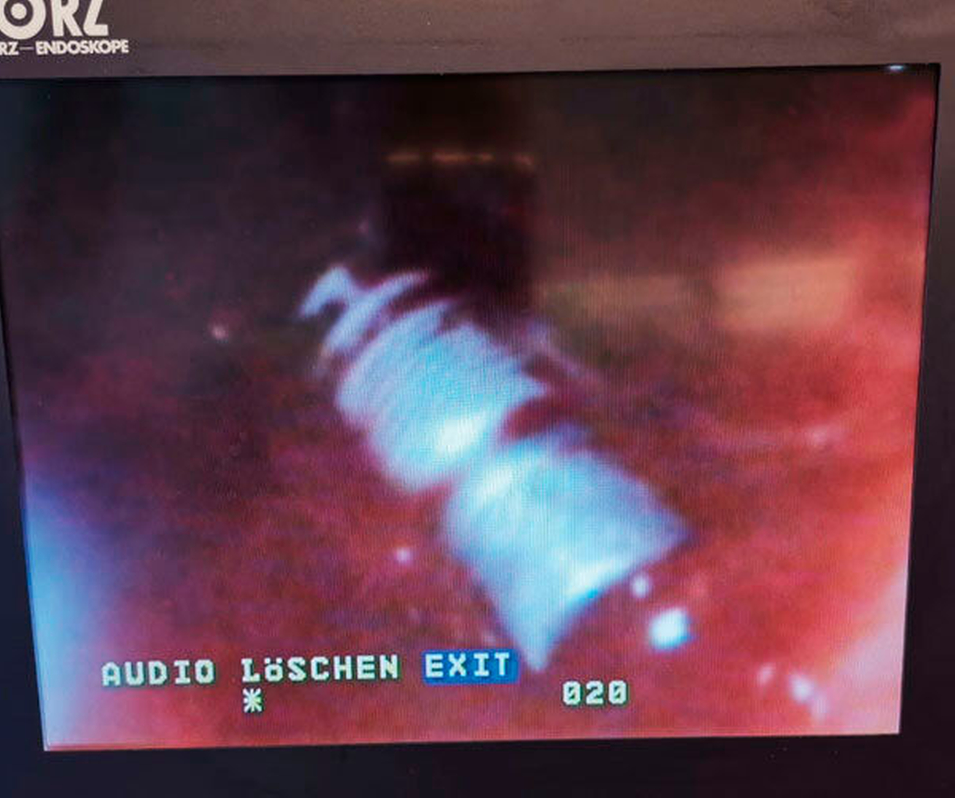 Hier wurde jeweils über einen crestalen Schnitt der Alveolarfortsatz im Oberkiefer beidseits dargestellt. Auf der linken Seite erfolgte die Entfernung des Fremdkörpers über die bereits bestehende MAV. In der rechten Kieferhöhle zeigte sich nach Präparation des mukoperiostalen Lappens ebenfalls eine MAV mit subperiostaler Verwachsung. Auch hier konnte der Fremdkörper komplikationslos geborgen werden. Bilateral wurde die Wunde mehrschichtig verschlossen, auf der linken Seite mit zusätzlicher Einlagerung des Bichat’schen Fettpfropfs.