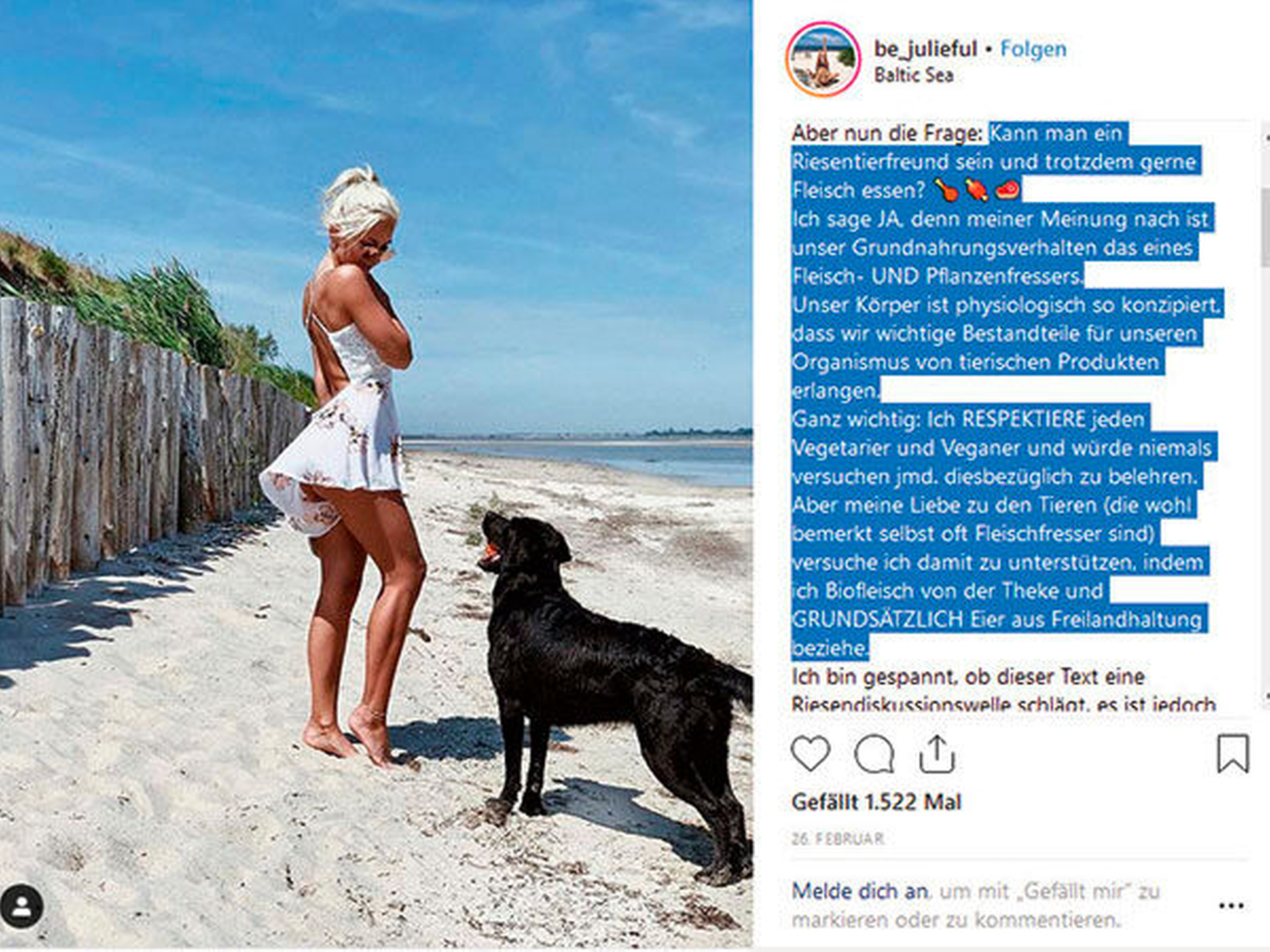 Wenn ich Essen mit Fleisch poste, schreiben mich ab und zu Vegetarier oder Veganer an, wie es sich vereinbaren ließe, tierlieb zu sein und trotzdem Fleisch zu essen. Da antworte ich dann: „Ich sage Ja, denn meiner Meinung nach ist unser Grundnahrungsverhalten das eines Fleisch- und Pflanzenfressers. Unser Körper ist physiologisch so konzipiert, dass wir wichtige Bestandteile für unseren Organismus von tierischen Produkten erlangen. Ganz wichtig: Ich respektiere jeden Vegetarier oder Veganer und würde niemals versuchen, jemanden diesbezüglich zu belehren. Aber meine Liebe zu den Tieren – die ja selbst oft Fleischfresser sind – versuche ich damit zu unterstützen, indem ich Biofleisch von der Theke und grundsätzlich Eier aus Freilandhaltung beziehe“ (Siehe Screenshot rechte Seite). Zum Glück gab es noch nie richtig bösartige Kommentare.