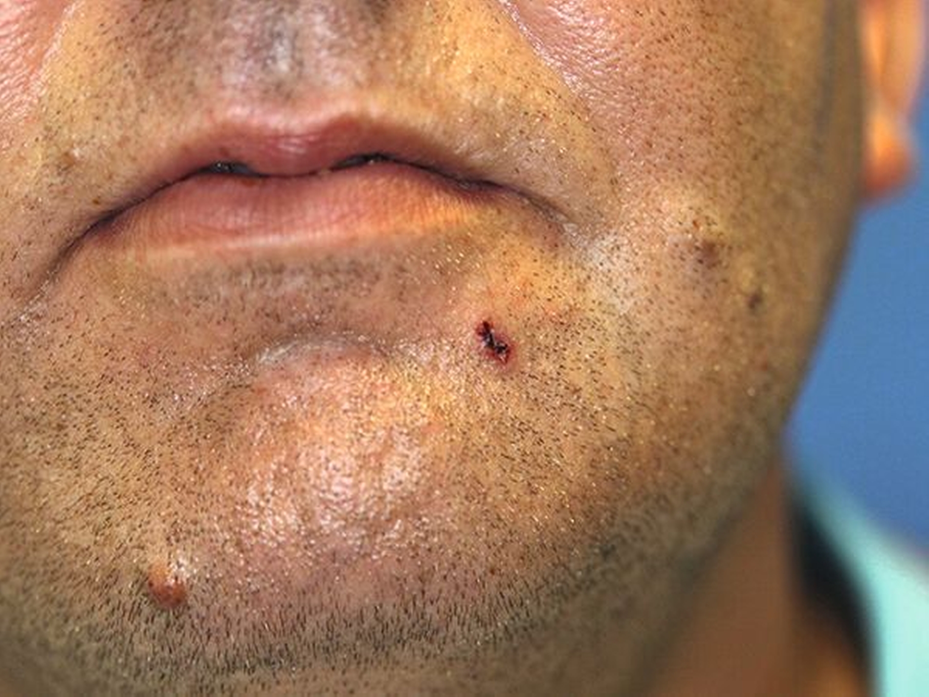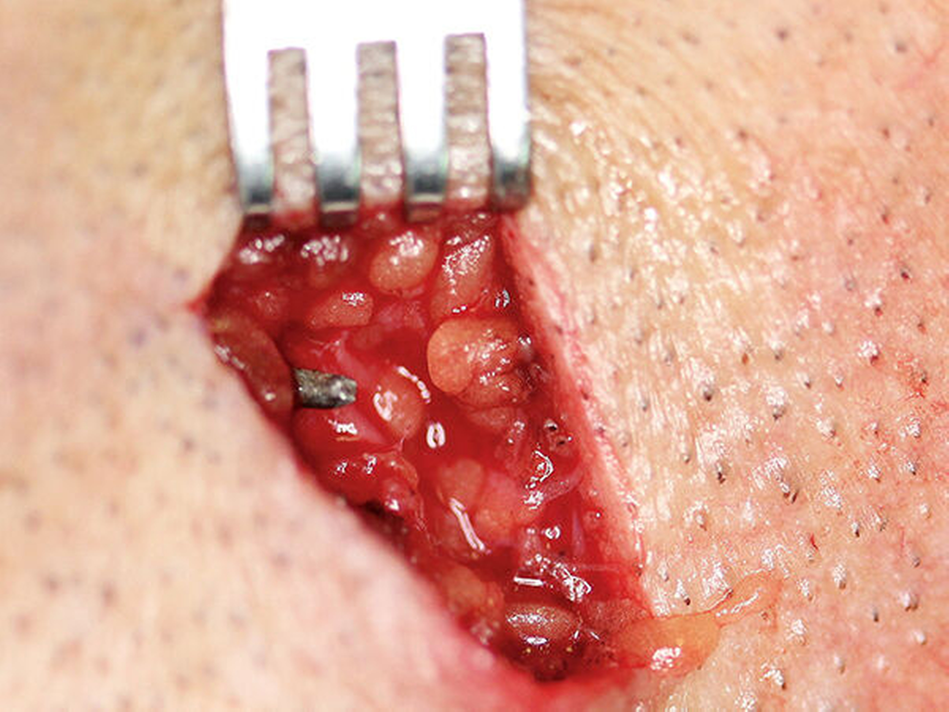 Ein ansonsten anamnestisch gesunder 40-jähriger Mann stellte sich notfallmäßig mit einer eher unscheinbaren, punktförmigen Wunde im Bereich des Kinns links in unserer Ambulanz vor (Abbildung 1). Nach Aussage des Patienten war diese Verletzung beim Mähen des Rasens passiert, als ihm ein Gegenstand gegen das Kinn geschleudert worden sei.