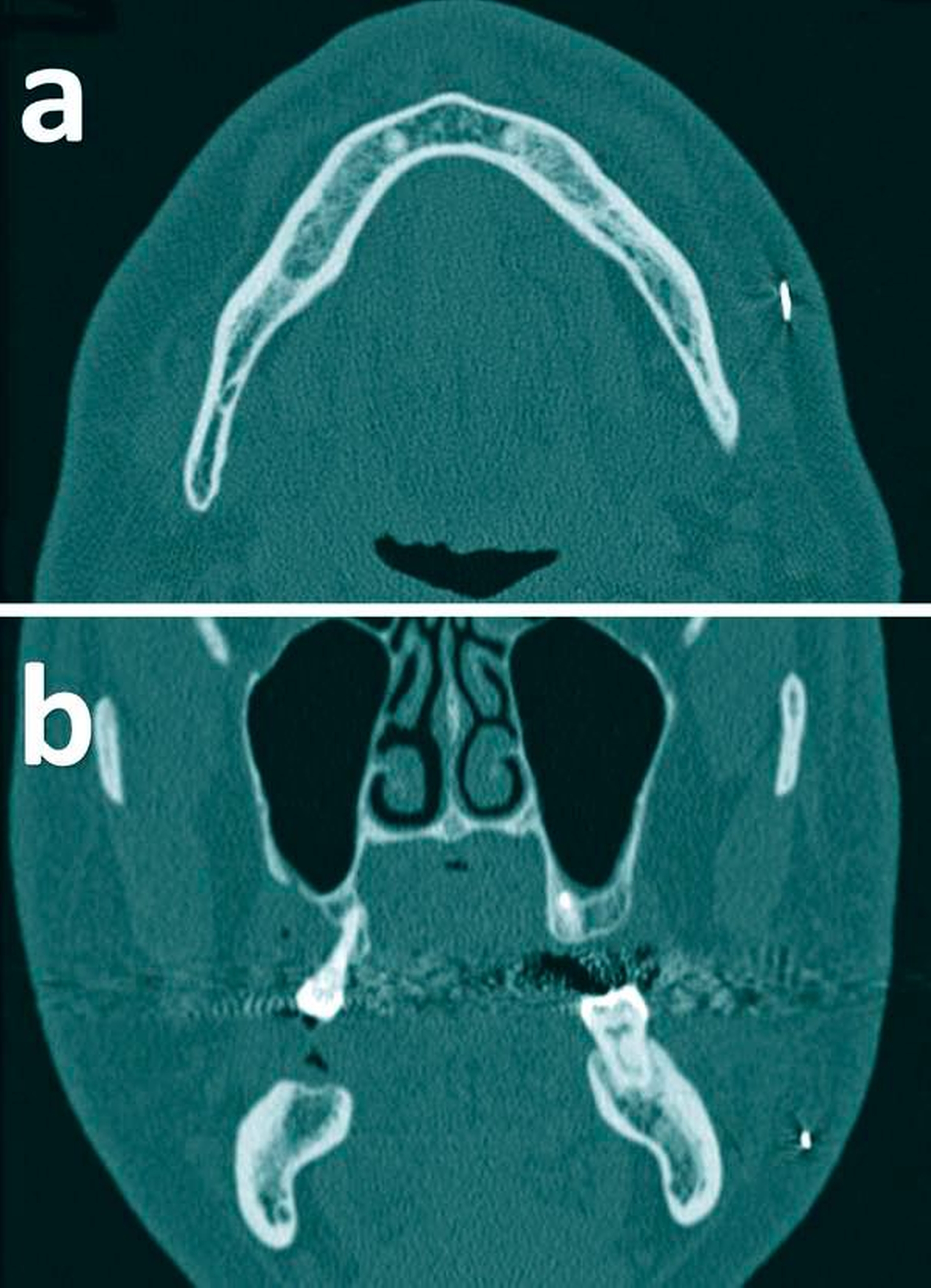 Zum Frakturausschluss und zur Darstellung der exakten Position des Fremdkörpers bevorzugten wir schließlich als weitere bildgebende Diagnostik die Computertomografie (CT). Der Fremdkörper hätte in unserem Fall auch sonografisch diagnostiziert werden können, jedoch wäre hierbei das Auffinden einer Fraktur – insbesondere einer Infraktur – fraglich gewesen. Darüber hinaus kann nicht ferromagnetisches Fremdkörpermaterial auch mit der Magnetresonanztomografie (MRT) diagnostiziert werden [Cameron and Phillips, 2006; Vikram et al., 2012; Melo et al., 2017]. Wir haben uns hier nicht nur wegen des erheblich größeren Aufwands, sondern auch aufgrund des unbekannten Fremdkörpermaterials strikt gegen letztgenannte Bildgebung entschieden. Bei einer MRT hätte es bei dem Patienten möglicherweise aufgrund der ferromagnetischen Fremdkörpereigenschaften zu unvorhergesehenen Komplikationen kommen können.