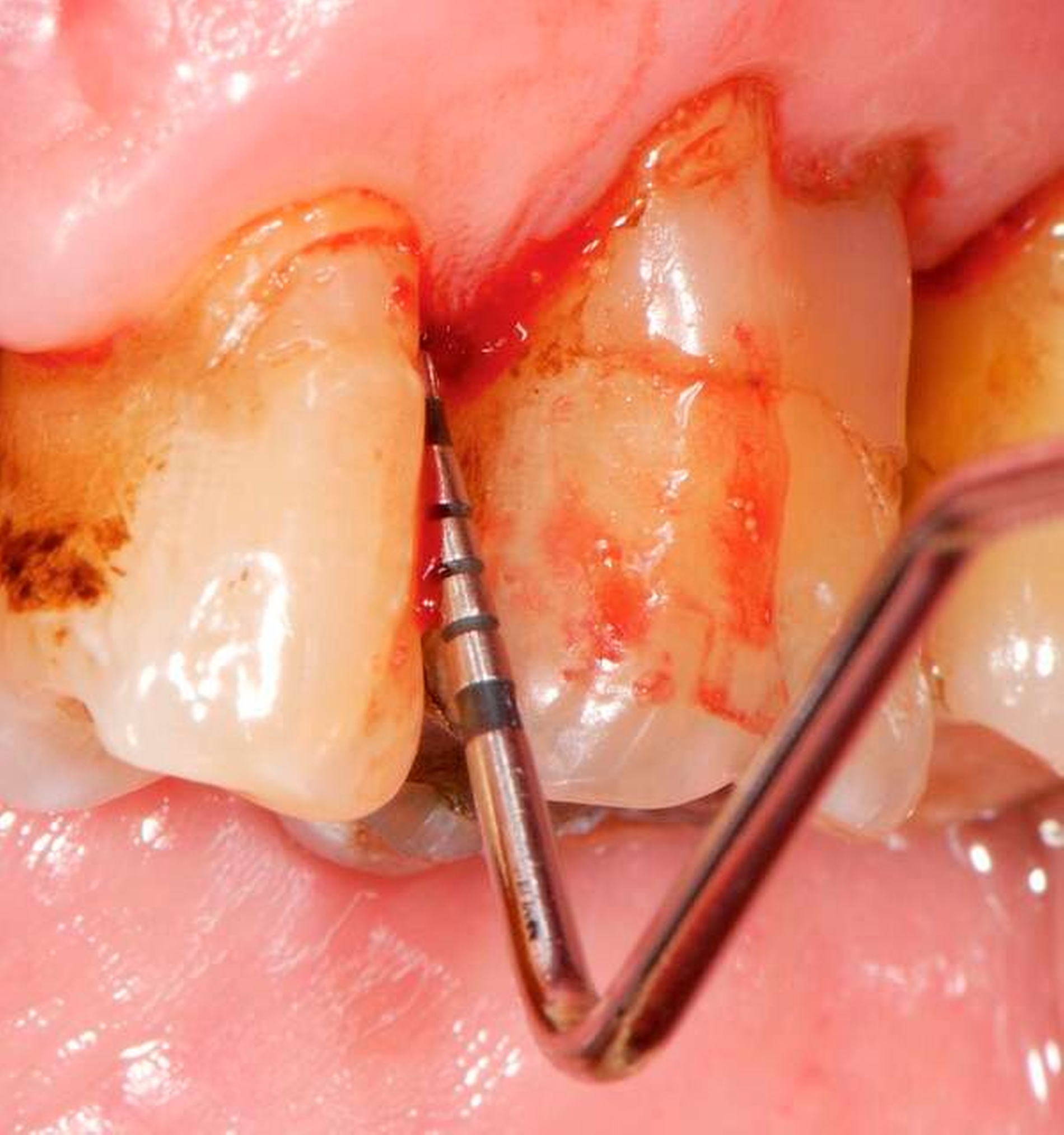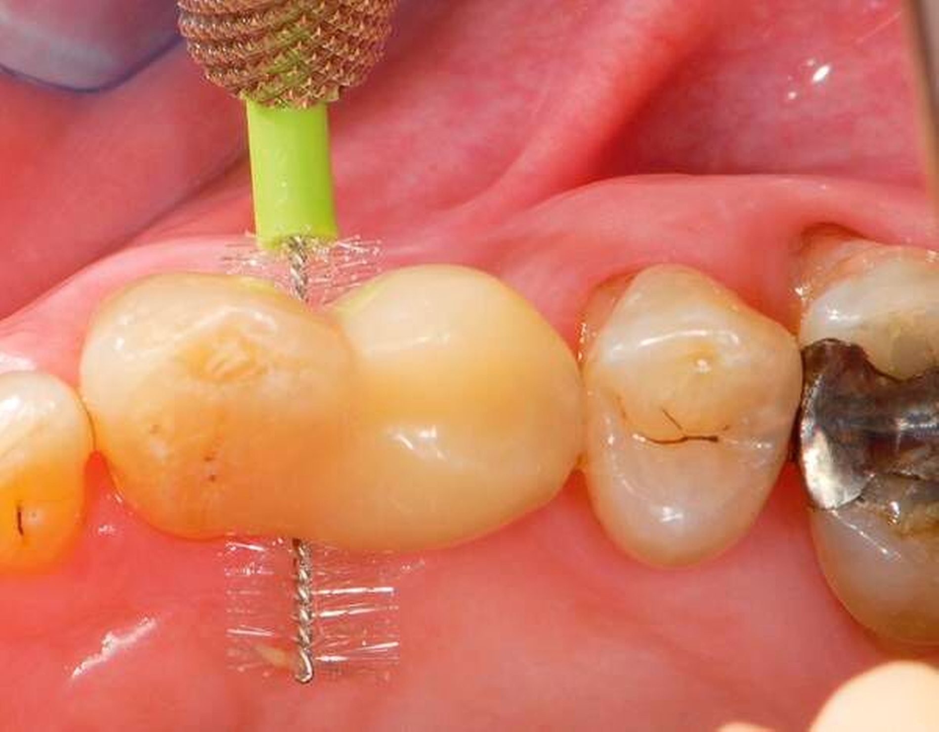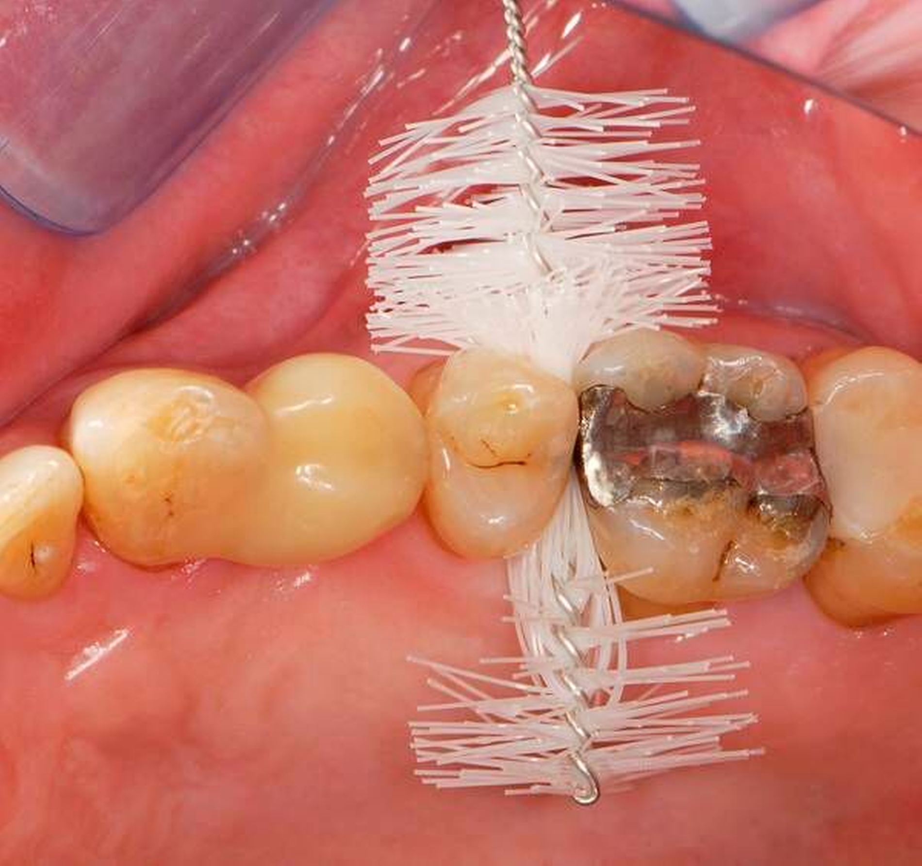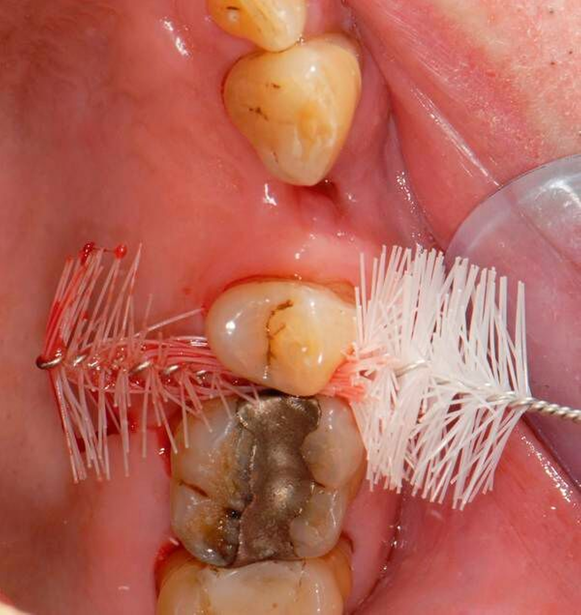 Wenn beispielsweise ein Patient mit tiefen Zahnfleischtaschen Interdentalraumbürsten anwendet, die ohne nennenswerten Widerstand die Zahnzwischenräume passieren, kann man nicht erwarten, dass ihm dies zu einem großen Nutzen für die Zahngesundheit verhilft. Dies betrifft auch Implantatträger [Staehle et al., 2016]. In Abbildung 7 ist ein Patient gezeigt, der trotz Parodontalbehandlung und regelmäßiger Reinigung mit einer – zu dünnen – Interdentalraumbürste hohe Sondierungstiefen und Bluten nach Sondieren aufwies. Erst nach Umstellung auf eine größere Interdentalraumbürste mit längeren Seitenborsten und einem genügend hohen Passagewiderstand durch den Interdentalraum wurde der Taschenfundus mit den Borsten besser erreicht und es kam zu einem deutlichen Entzündungsrückgang.