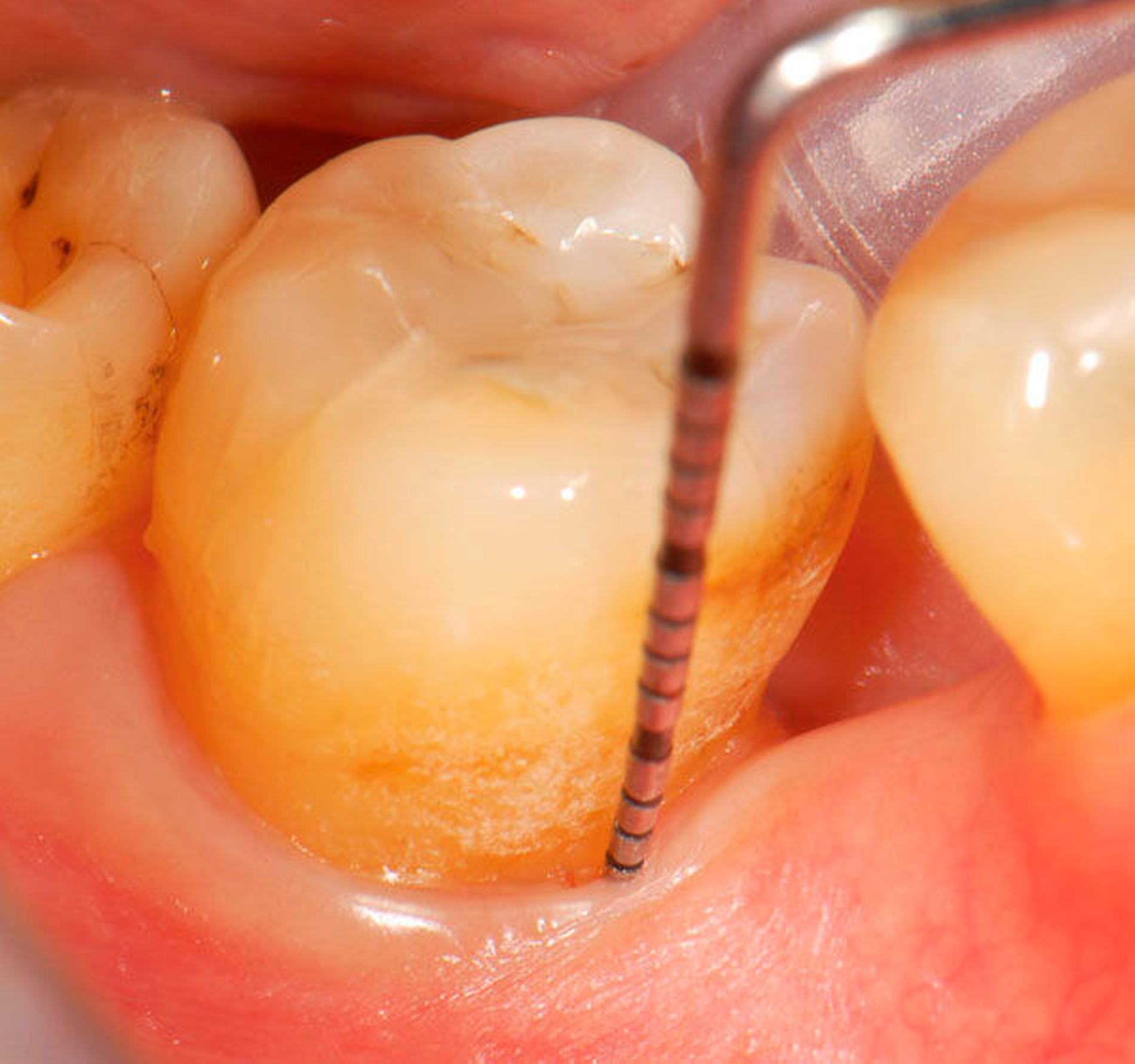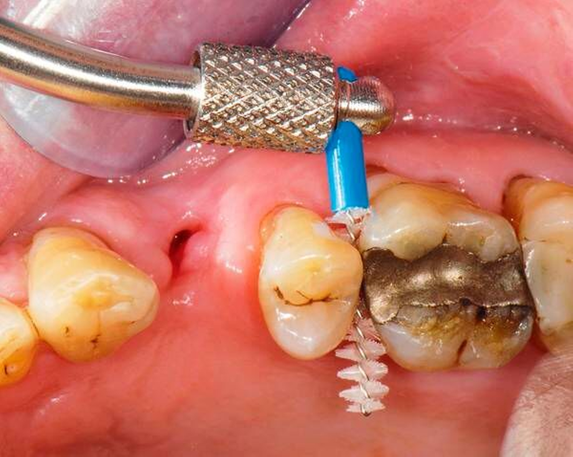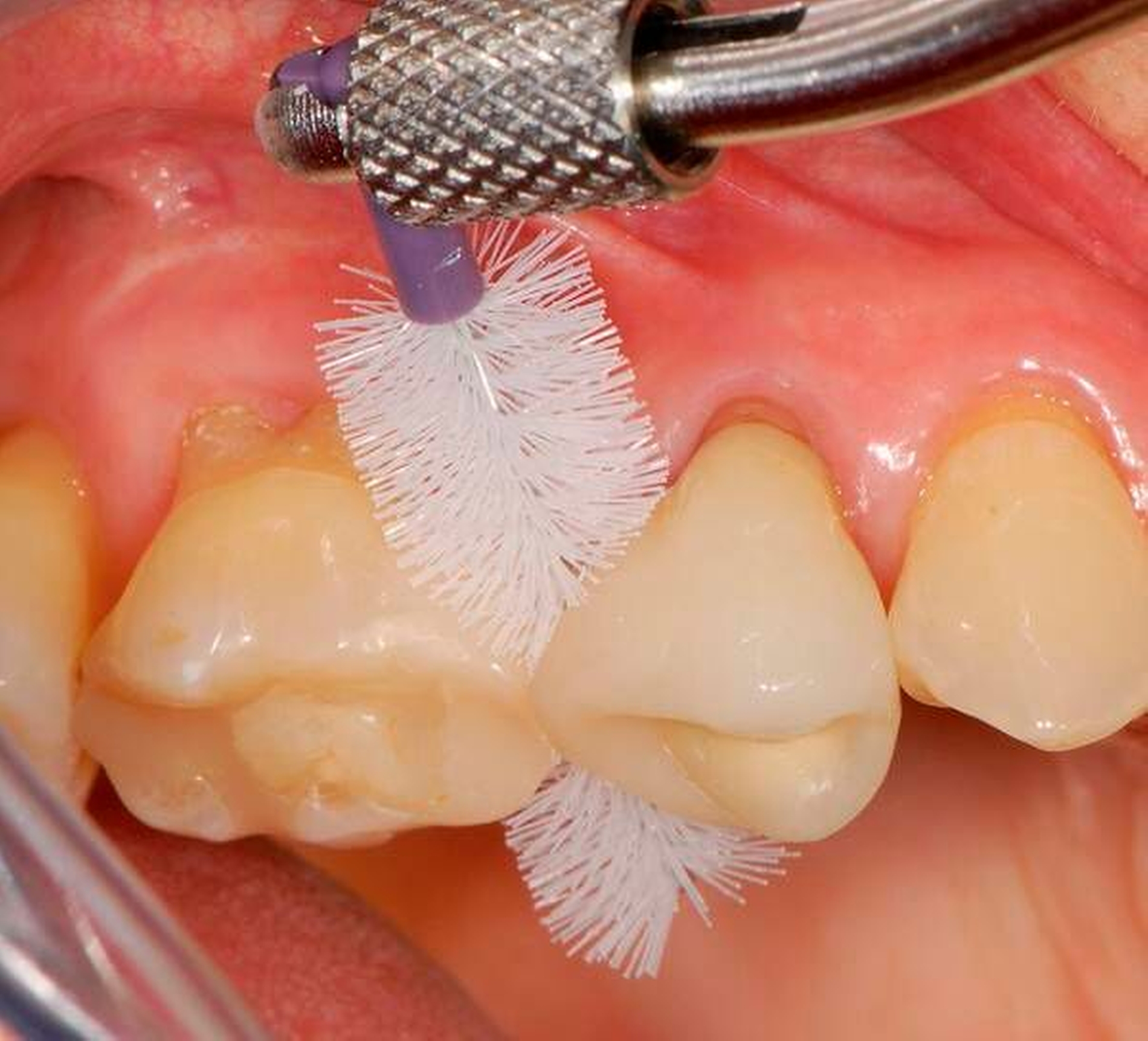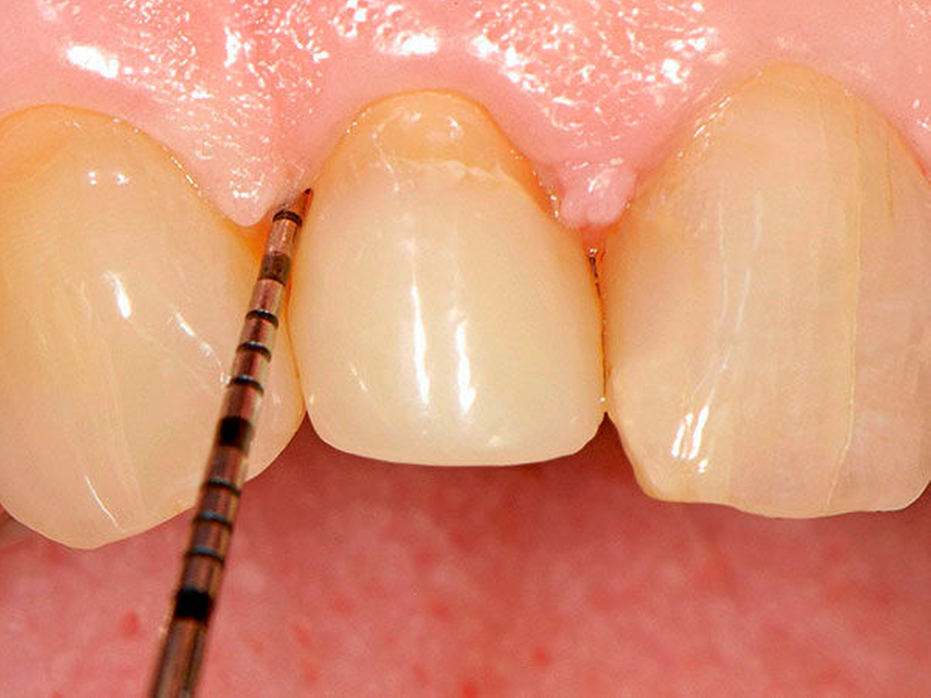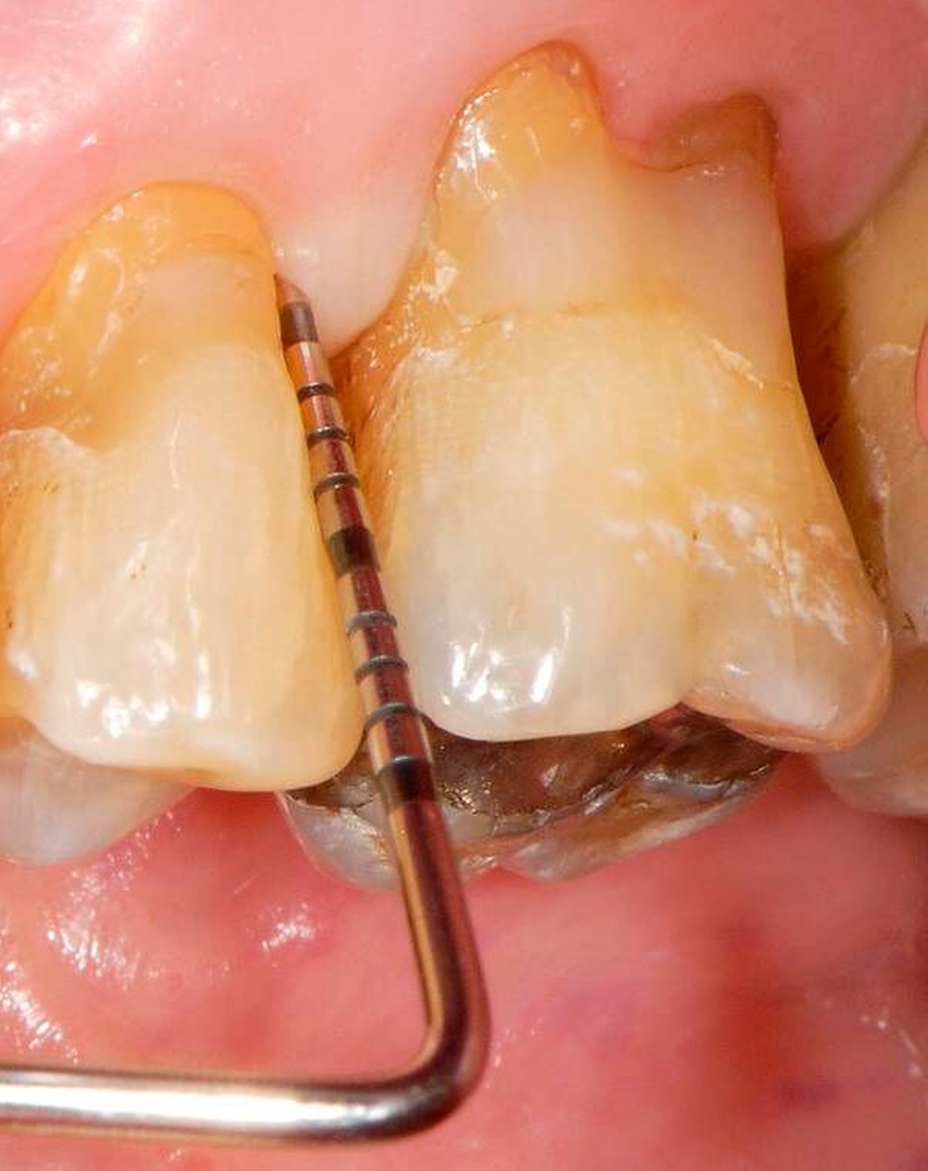 Wenn beispielsweise ein Patient mit tiefen Zahnfleischtaschen Interdentalraumbürsten anwendet, die ohne nennenswerten Widerstand die Zahnzwischenräume passieren, kann man nicht erwarten, dass ihm dies zu einem großen Nutzen für die Zahngesundheit verhilft. Dies betrifft auch Implantatträger [Staehle et al., 2016]. In Abbildung 7 ist ein Patient gezeigt, der trotz Parodontalbehandlung und regelmäßiger Reinigung mit einer – zu dünnen – Interdentalraumbürste hohe Sondierungstiefen und Bluten nach Sondieren aufwies. Erst nach Umstellung auf eine größere Interdentalraumbürste mit längeren Seitenborsten und einem genügend hohen Passagewiderstand durch den Interdentalraum wurde der Taschenfundus mit den Borsten besser erreicht und es kam zu einem deutlichen Entzündungsrückgang.