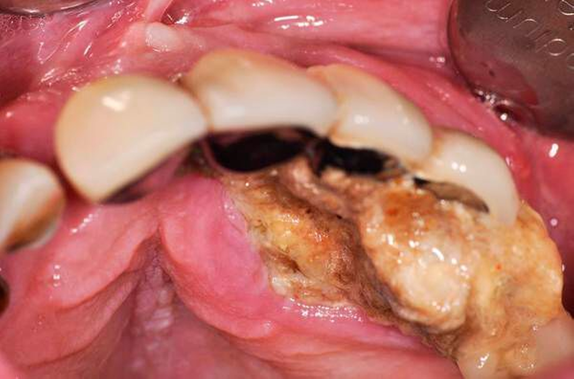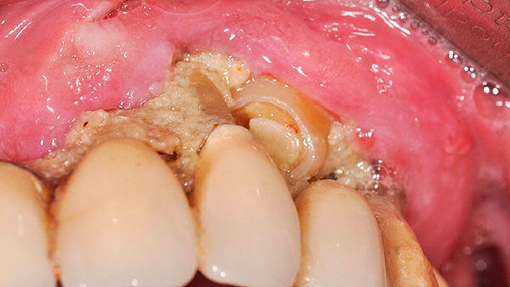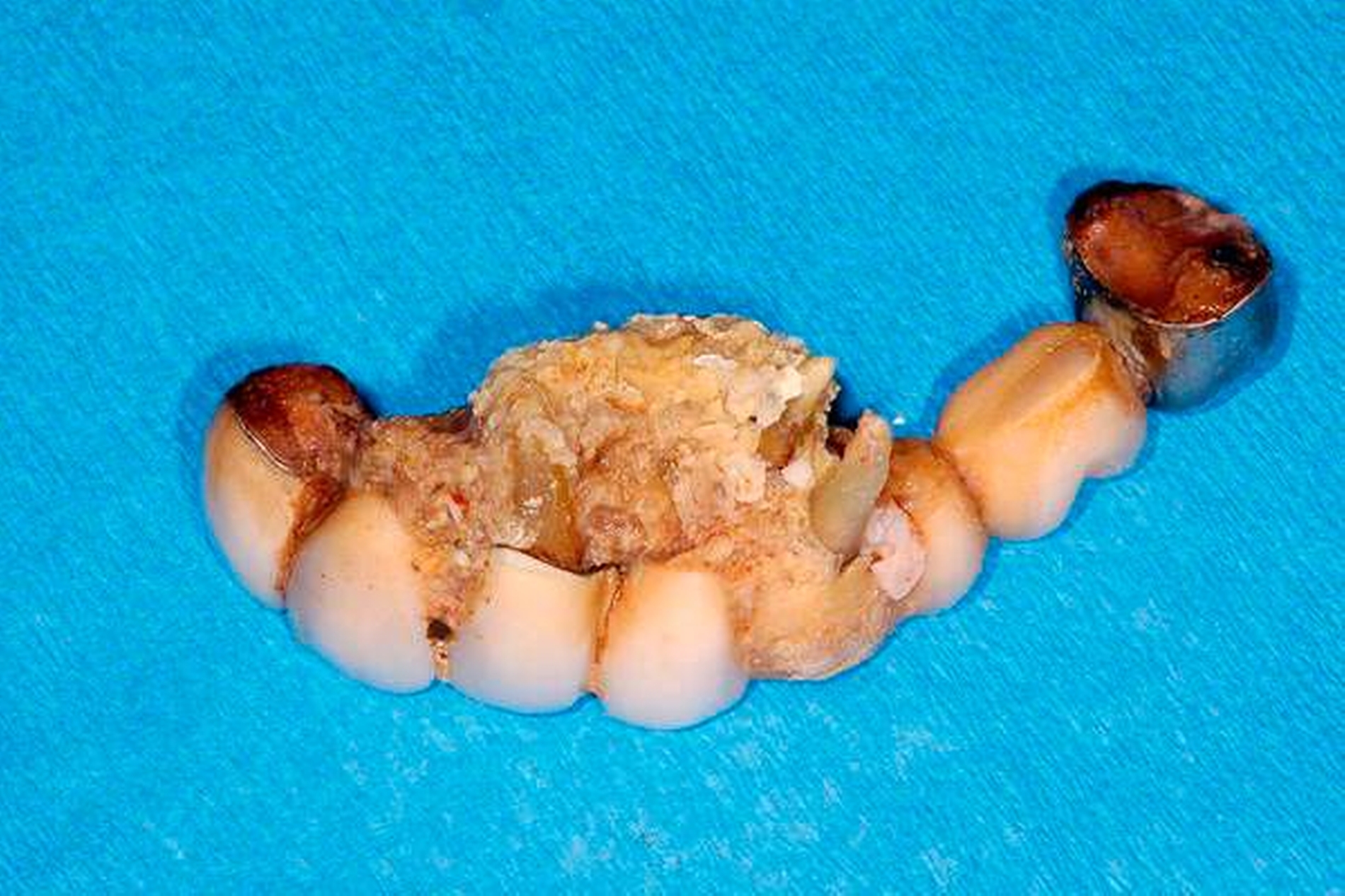 Zahnstein kann – insbesondere unterhalb eingebrachter Zahnersatzmaterialien – ungewöhnliche Ausmaße annehmen.