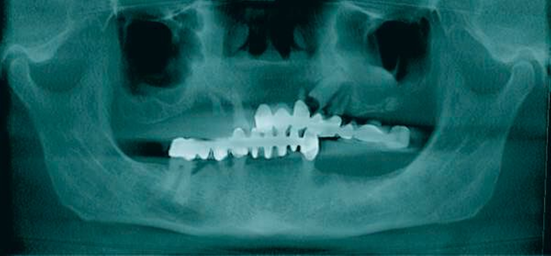 In der durchgeführten radiologischen Diagnostik zeigten sich ausgeprägte Parodontopathien mit Verdacht auf eine BRONJ bei gut begrenzter radiologischer Aufhellung mit Kieferhöhlenbeteilung (Abbildungen 3 bis 5). Unter der Verdachtsdiagnose einer BRONJ wurde somit die Indikation zur Zahnsanierung mit Exzision der pathologischen Veränderung im Oberkiefer gestellt. Nach Entfernung der gelockerten Brücke zusammen mit den die Brücke tragenden Zähnen zeigten sich große Mengen harten, anhaftenden Gewebes (Abbildung 6); der unter dem Befund liegende Knochen stellte sich klinisch als vital und ohne Anzeichen einer Nekrose dar.