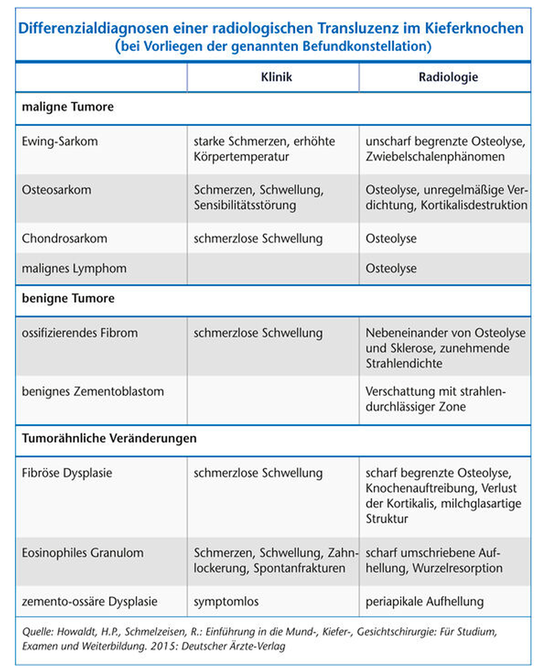 Morphologisch zeigt sich der befallene Knochen deutlich verändert und gräulich bis gelblich verfärbt. In der radiologischen Bildgebung kann sich die BRONJ insbesondere zu Beginn noch unauffällig darstellen. In späteren Stadien kann es zur Aufhebung der kortikospongiösen Struktur mit Spongiosasklerose und periostaler Auflagerung kommen. Das typische Auftreten nebeneinander liegender röntgenologischer Aufhellung und Verschattung ebenso wie die Sequestrierung der ossären Strukturen oder das Vorkommen pathologischer Frakturen erhärten den Verdacht auf eine Kiefernekrose. Therapeutisch steht die chirurgische Sanierung mit dichtem Wundverschluss oder – im Fall ausgedehnter Defekte – die Kontinuitätsresektion mit anschließender Rekonstruktion im Vordergrund. Konservativ kann ein Therapieversuch mittels systemischer Antibiotikagabe erfolgen [Kämmerer, 2013; Gujer, 2013]. Die Gruppe in die Differenzialdiagnostik einzubeziehender, sich klinisch-radiologisch ähnlich präsentierender Befunde umfasst Erkrankungen aus dem Bereich der malignen wie der benignen Knochentumore und tumorähnliche Veränderungen (Tabelle 1).