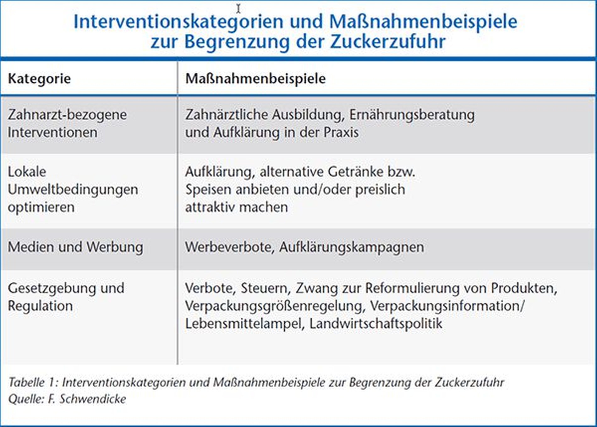 Gesetzgeberische und regulatorische Maßnahmen werden zunehmend diskutiert und auch eingesetzt: Verbote, der Zwang zur Produktreformulierung, eine Packungsgrößenbegrenzung oder Besteuerung fallen in diese Kategorie. Gerade eine „Zuckersteuer“ (unter anderem eine Steuer auf zuckergesüßte Getränke) scheint geeignet, bei den Hochrisikogruppen, also den jungen Menschen aus bildungsfernen und einkommensschwachen Schichten, eine Verhaltensänderung zu bewirken. Die generierten Steuereinnahmen sollten idealerweise eingesetzt werden, um gesündere Lebensmittel günstiger zu machen oder gesundes Verhalten zu unterstützen. Eine wirksame Begrenzung des Zuckerkonsums ist dringend geboten, um die meisten „Volkskrankheiten“ (Diabetes, Übergewicht, Karies, Parodontitis) nachhaltig zu bekämpfen.