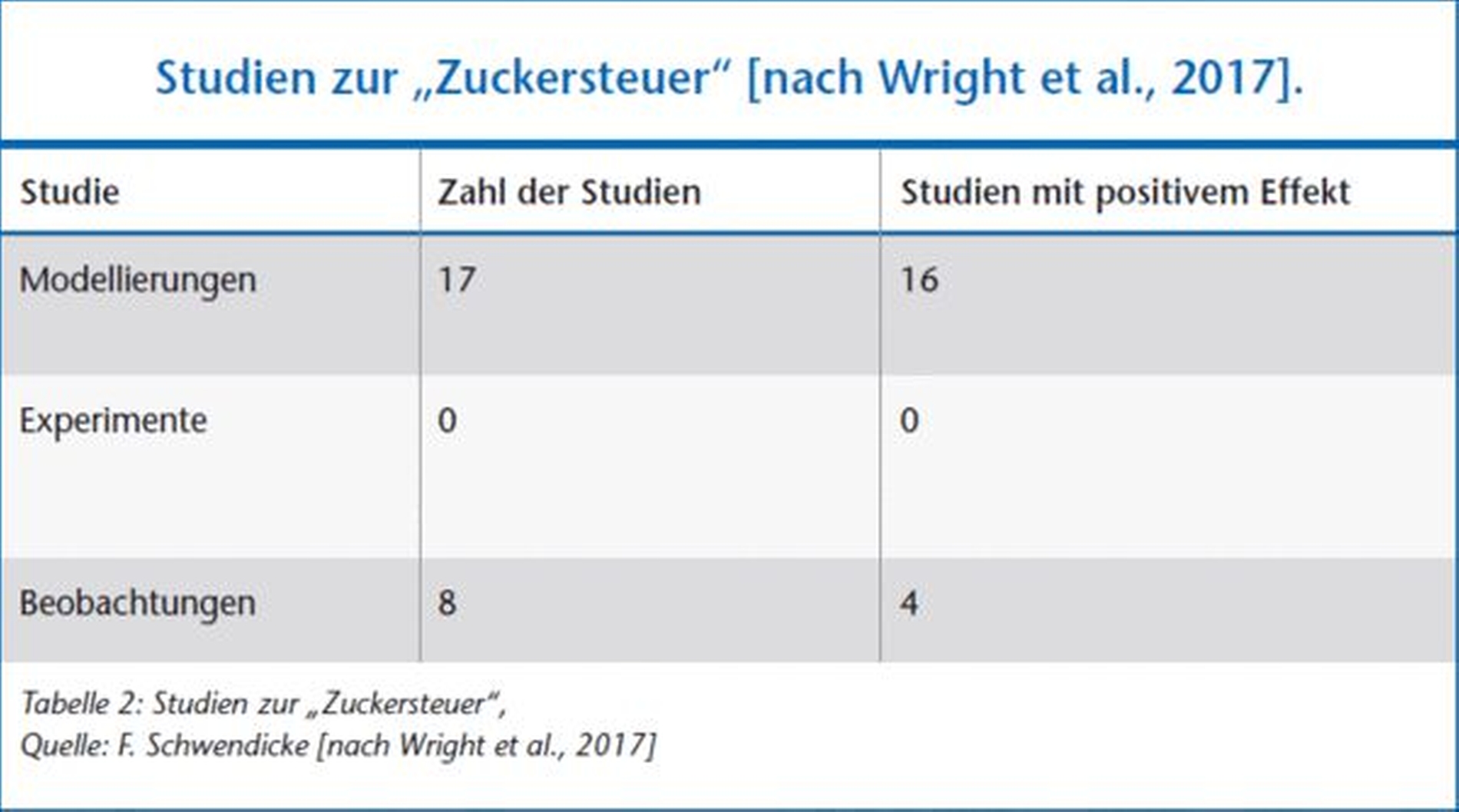 Die Wirksamkeit einer Zuckersteuer wurde durch eine Reihe von Studien untersucht (Tabelle 2). Gerade die sogenannten Modellierungen zeigten positive Effekte. Diese Studien messen jedoch keine wirklichen Effekte, sondern arbeiten unter bestimmten Annahmen. Dabei gehen Modellierungen beispielsweise nach folgendem Schema vor: Die Elastizität für SSBs ist x%, eine Preissteigerung von x% reduziert den SSB-Konsum demnach um xl/Tag und führt damit zu einer Reduktion der Zuckerzufuhr um ?g/Tag; gleichzeitig findet eine Kreuzelastizität zu Fruchtsäften mit x% statt, wodurch die Zuckerzufuhr um xg/Tag gesteigert wird; die Nettoreduktion der Zuckerzufuhr wird zu x Tausend weniger Fällen von Übergewicht in Deutschland führen.