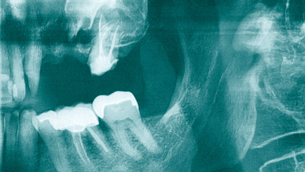 Ein männlicher 72-jähriger Patient wurde mit Beschwerden im Oberkiefer links vom behandelnden Hauszahnarzt mit dem Verdacht auf überpresstes Provisorienmaterial in die linke Kieferhöhle überwiesen.