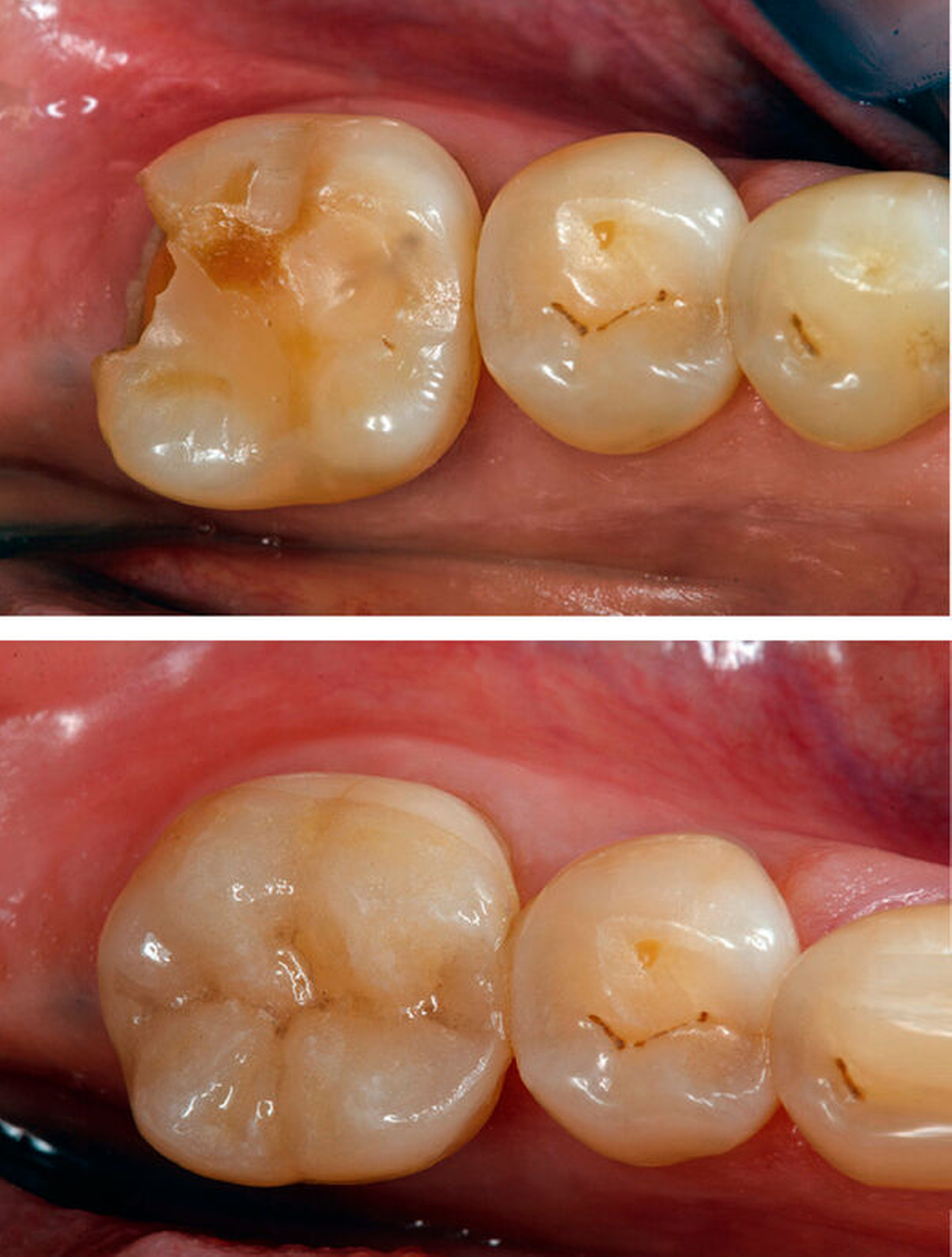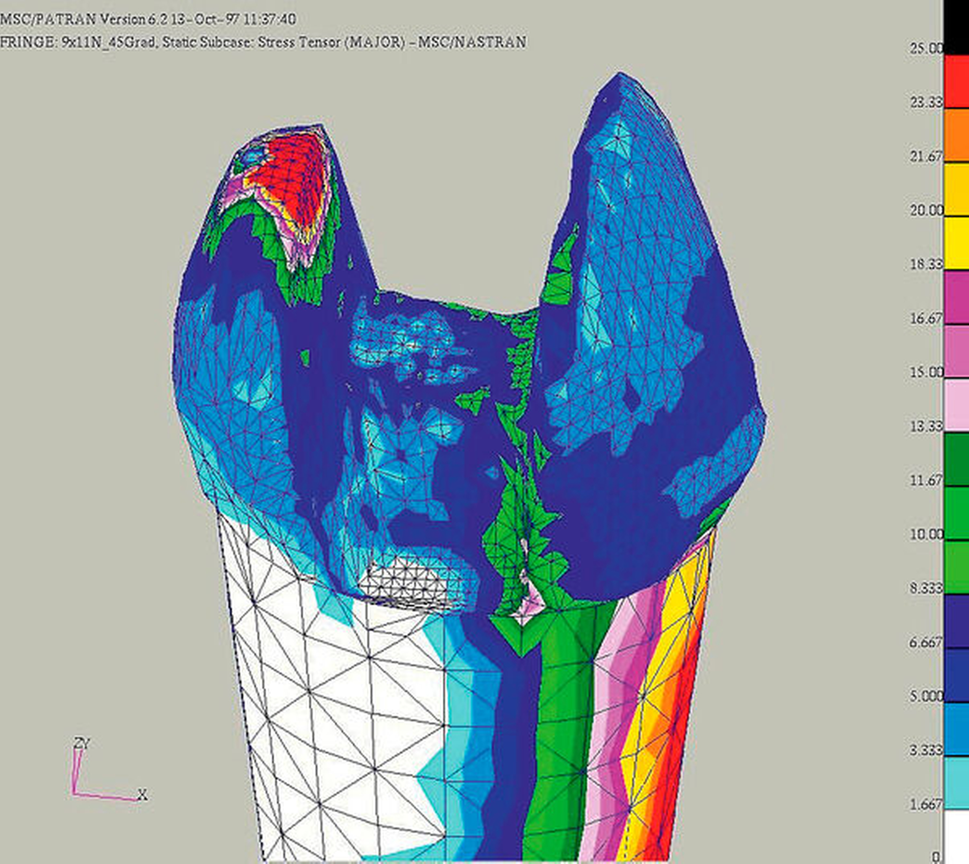 Ein weiterer Aspekt der Forschung galt in der „keramischen Frühzeit“ dem Vorurteil des ausgeprägten präparativen Substanzverzehrs und des Randspalts von Keramikrestaurationen. 2001 ermittelte das Team der Professoren Matthias Folwaczny, Albert Mehl und Karl-Heinz Kunzelmann mit einer Finite-Elemente-Analyse, dass dünnwandige Höcker – ohne Überkuppelung mit adhäsiv befestigten, stabilisierenden Onlays und Teilkronen versorgt – zirkuläre, substanzverzehrende Vollkronen aus Metall substituieren können (Abbildung 2). Ferner belegten die Autoren, dass sich durch den adhäsiven Verbund zum Restzahn die eingeleitete Kaukraft nicht nur auf den belasteten Höcker konzentriert, sondern von der Keramikrestauration aufgenommen und an die gesamte Zahnhartsubstanz weitergeleitet wird. Durch den Verbund werden geschwächte Höckerwände signifikant stabilisiert. Die Autoren bewiesen, dass die adhäsive Befestigung eine kraftschlüssige, retentive Verbindung sicherstellt und bei großen Kavitäten die Polymerisationsspannung sowie das Risiko von Schmelzrissen reduziert.