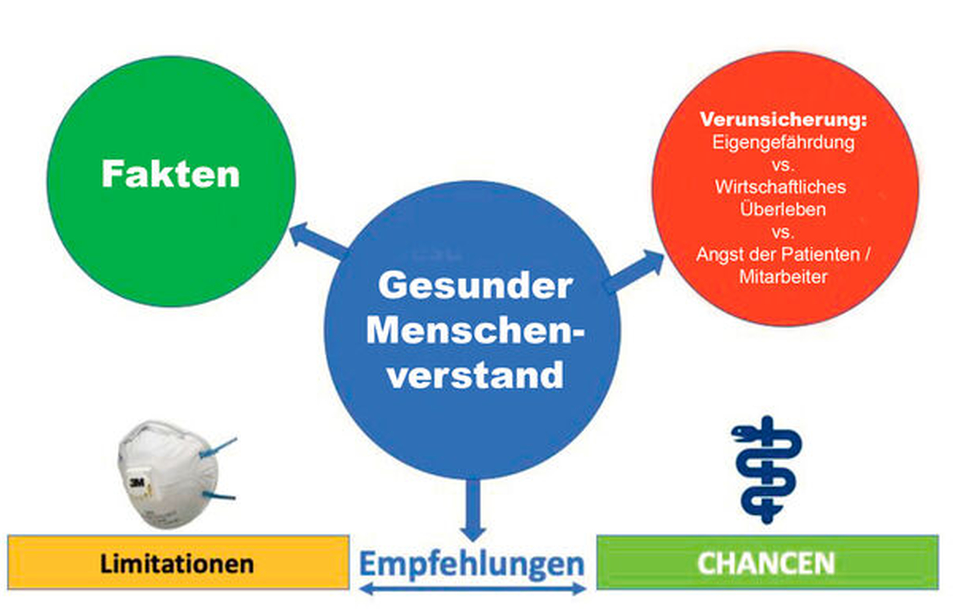 Der beschriebene „gesunde Menschenverstand“ ist zum Beispiel auch eine wichtige Grundlage des Thesenpapiers der Leopoldina, das von führenden Wissenschaftlern unseres Landes verfasst wurde12 . Der „gesunde Menschenverstand“ stützt sich natürlich auf die verfügbaren Fakten (Abbildung), wird aber ebenso auch massiv von Verunsicherung (Eigengefährdung versus finanzieller Schaden versus Mitarbeiterschut) beeinflusst. Aus dieser Gemengelage Empfehlungen zu erarbeiten, birgt zum einen Limitationen wie Knappheit bei Schutzausrüstung und zum anderen Chancen, zuvorderst die oben beschriebene medizinische Relevanz unseres Tuns zu unterstreichen. Gerade aber bei den Fakten muss man sich – Stand heute – durch die limitierte Verfügbarkeit ebenfalls über Grenzen im Klaren sein. Ebenso dürfen bereits vor der Covid-19-Pandemie bekannte Fakten nicht außer Acht gelassen werden13-16 .