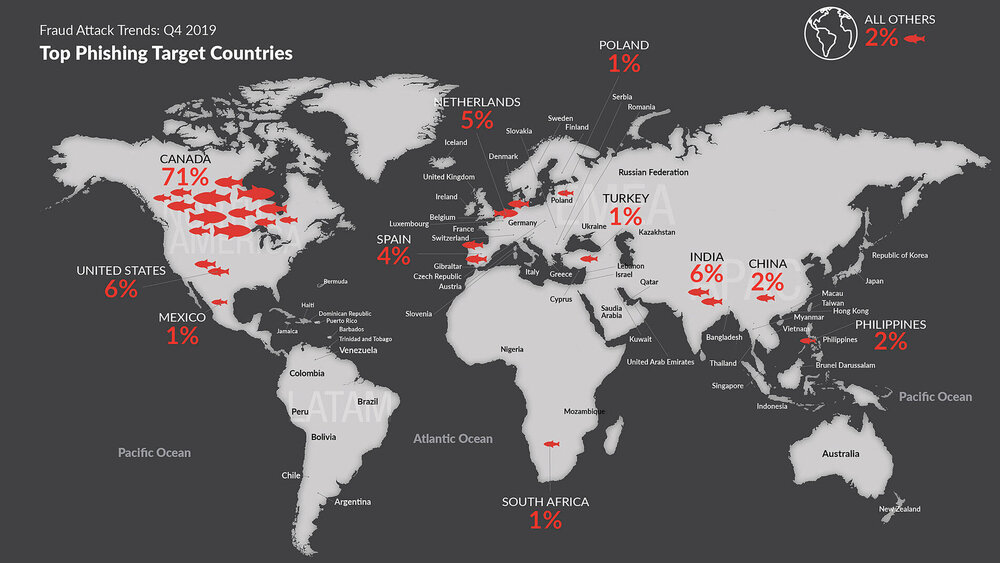 Kanada bleibt mit sieben von zehn Phishing-Fällen Top-Angriffsziel, gefolgt von den USA, Indien, den Niederlanden und Spanien. Deutschland taucht in dieser Liste zwar nicht auf, steht aber auf Platz zwei der häufigsten Hosting-Länder hinter den USA. Das bedeutet, die Hacker nutzen oft Websites, die sie in Deutschland registriert haben. Nichtsdestotrotz haben sich auch hierzulande die Phishing-Angriffe nahezu verdoppelt: Sie machten im vierten Quartal 2019 mehr als fünf Prozent aller Betrugsfälle aus.