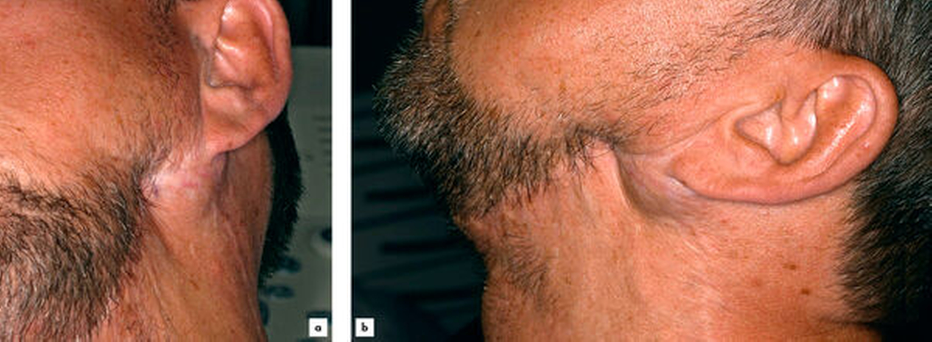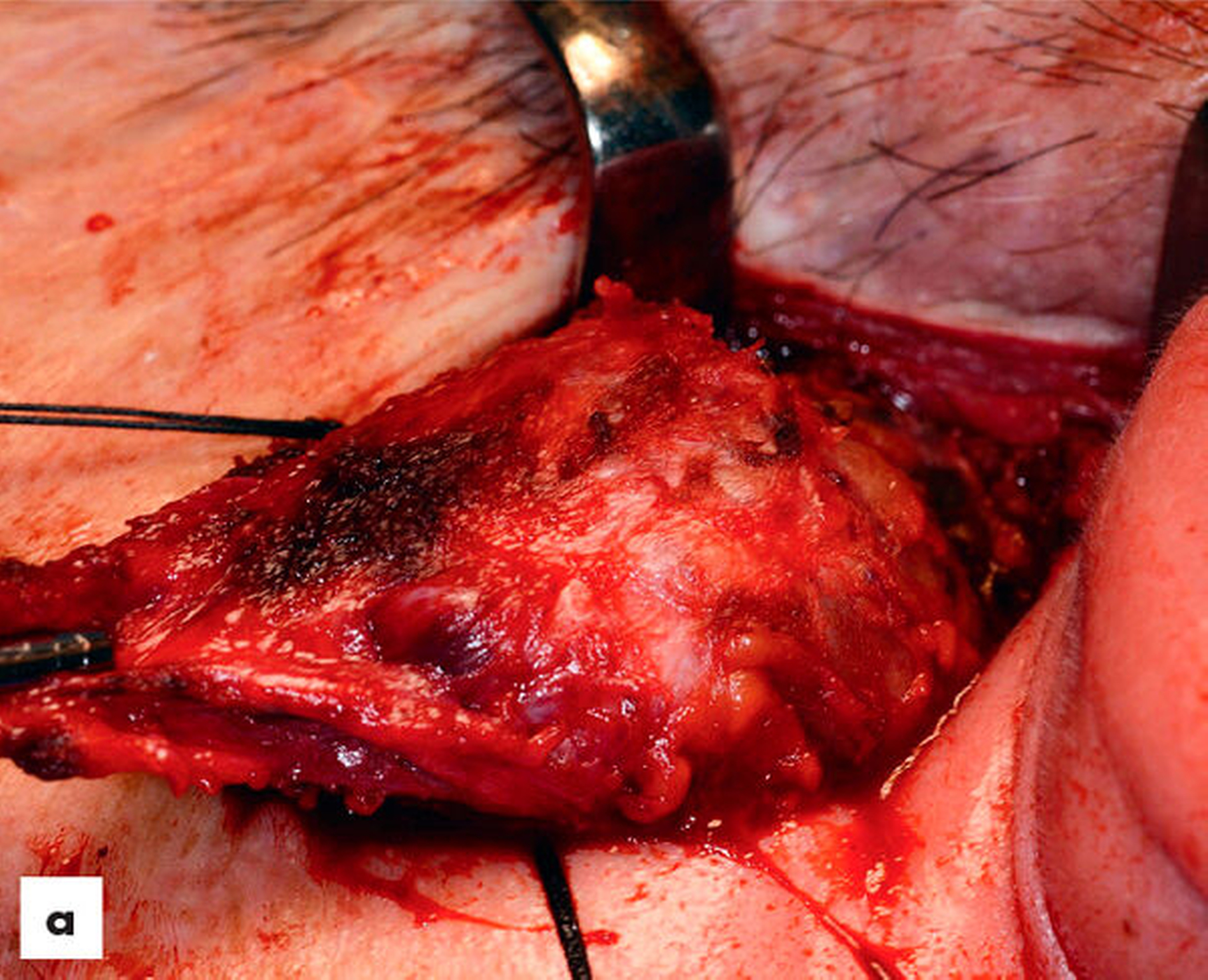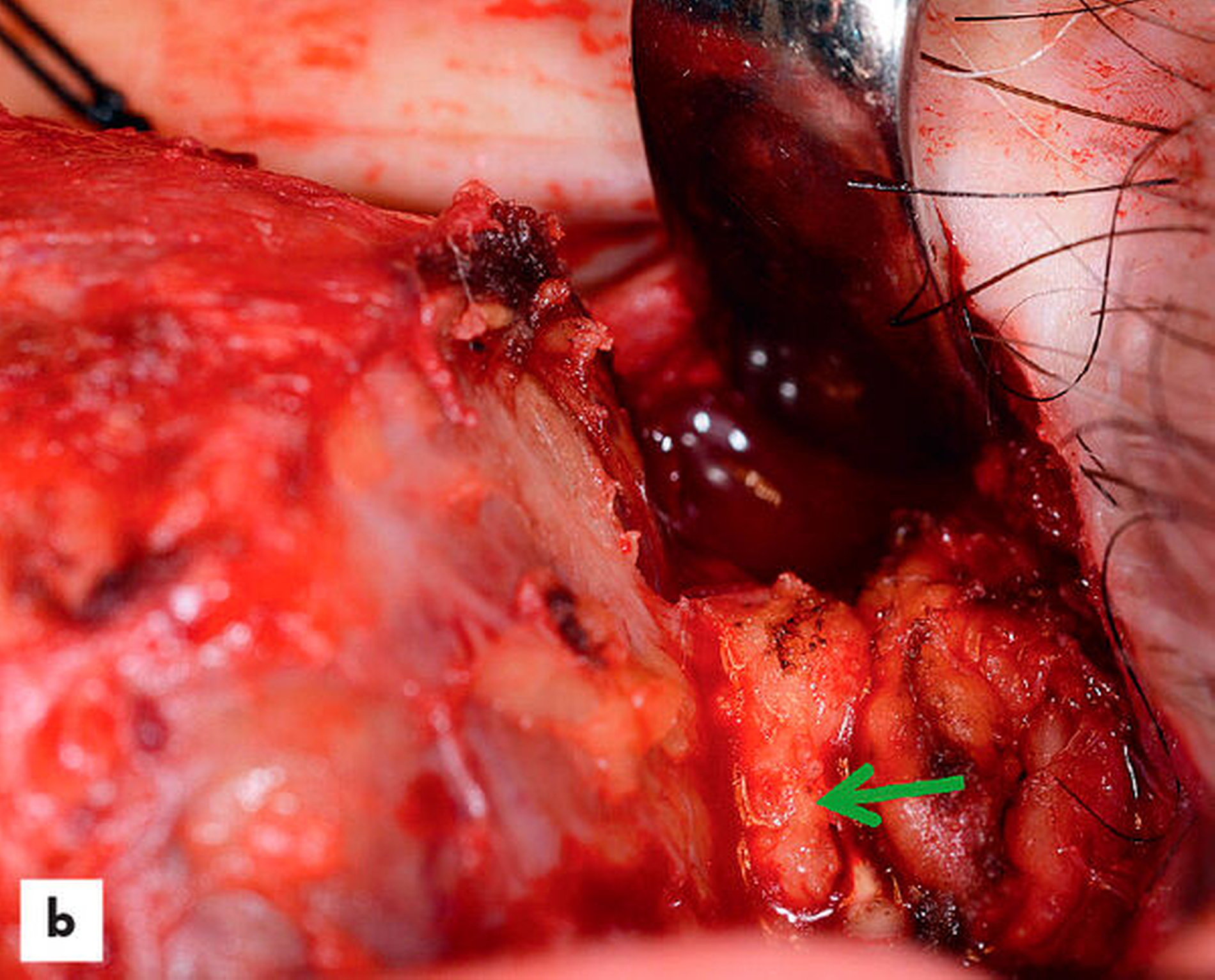 Hierbei wurde über den alten Zugang die bindegewebig umschiedene, gut abgrenzbare Läsion entfernt. Der Nervus facialis war dem Tumor narbig am Oberpol angehaftet und wurde vom Tumor abpräpariert (Abbildung 3b).