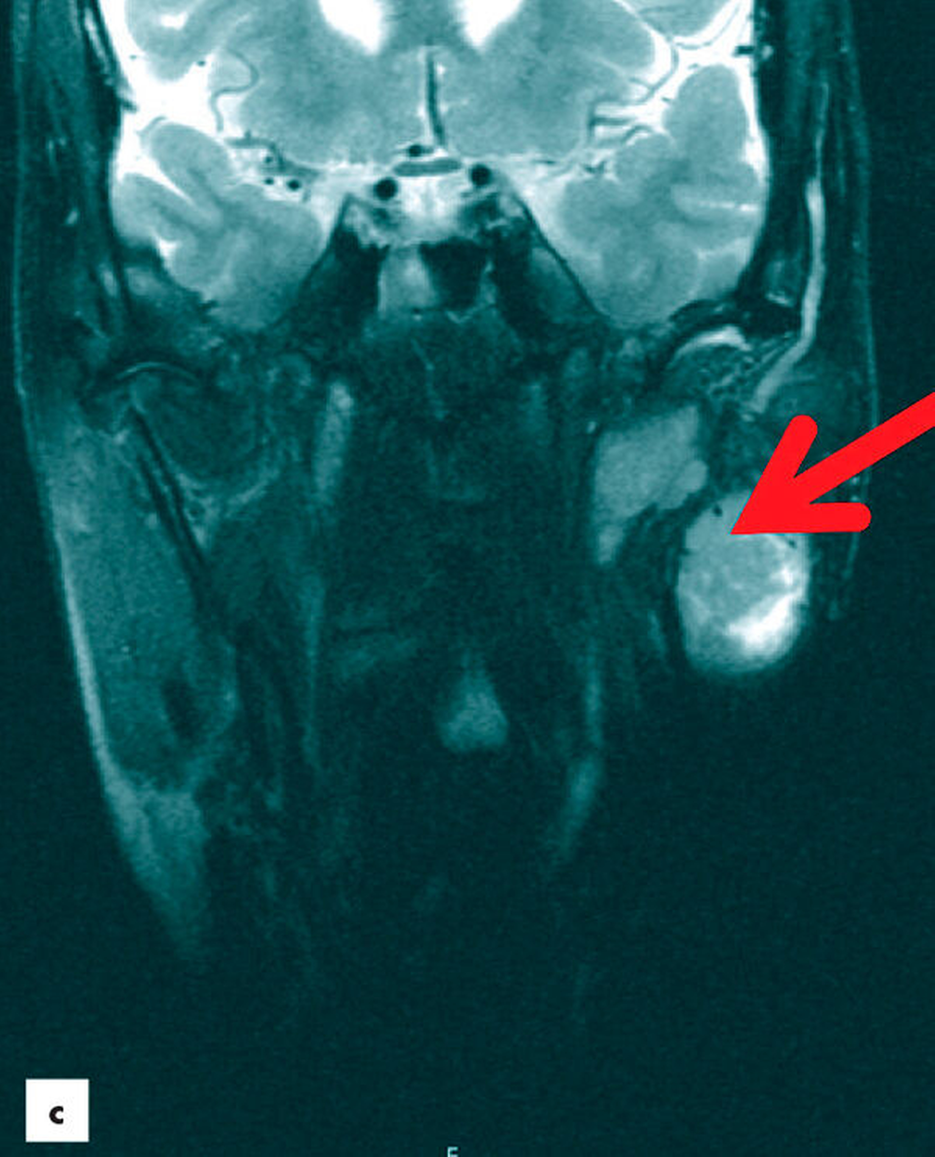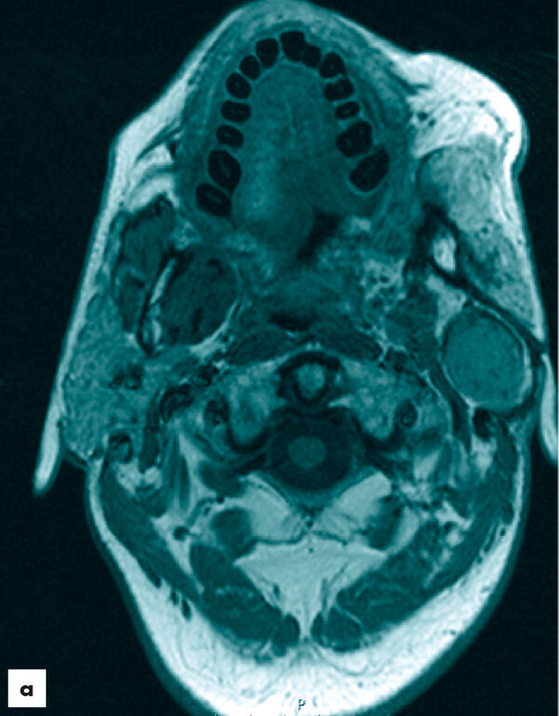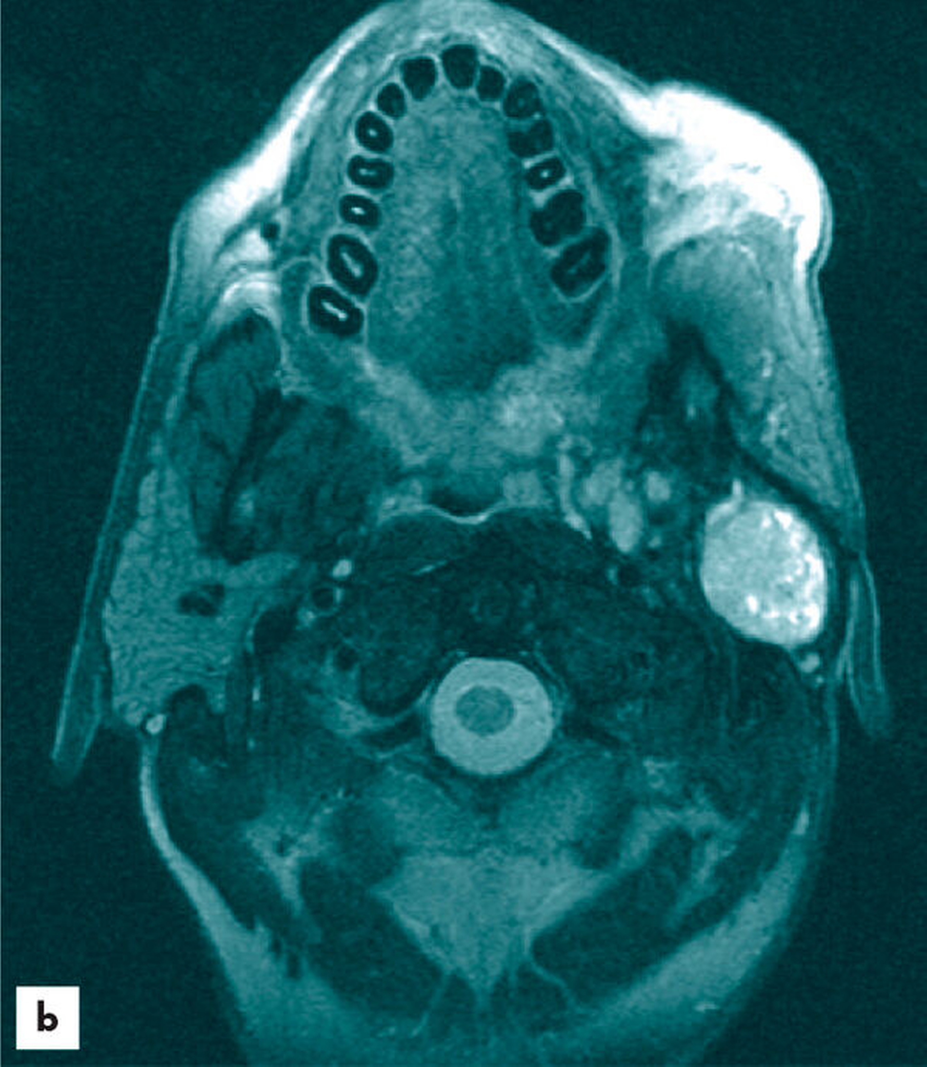 Sonografisch zeigte sich eine gut begrenzte, homogene, hyposonore Raumforderung ohne Nachweis auf eine Hypervaskularisation. Sonomorphologisch bestand damit der Verdacht auf einen gutartigen Speicheldrüsentumor. Zur weiteren Abklärung wurde eine Magnetresonanztomografie durchgeführt. Hierin stellte sich ein circa 4 cm x 3 cm großer, gut abgrenzbarer Tumor unterhalb des linken Ohres dar. Der Tumor zeigte eine Kontrastmittelaufnahme mit homogener Verteilung (Abbildung 2). Auffällige Lymphknoten kamen nicht zur Darstellung. Medial der Unterkieferrekonstruktion zeigte sich ein Parotisrest, der in Verbindung zu der Raumforderung stand. Bildmorphologisch entsprach der Befund einem monomorphen Adenom.