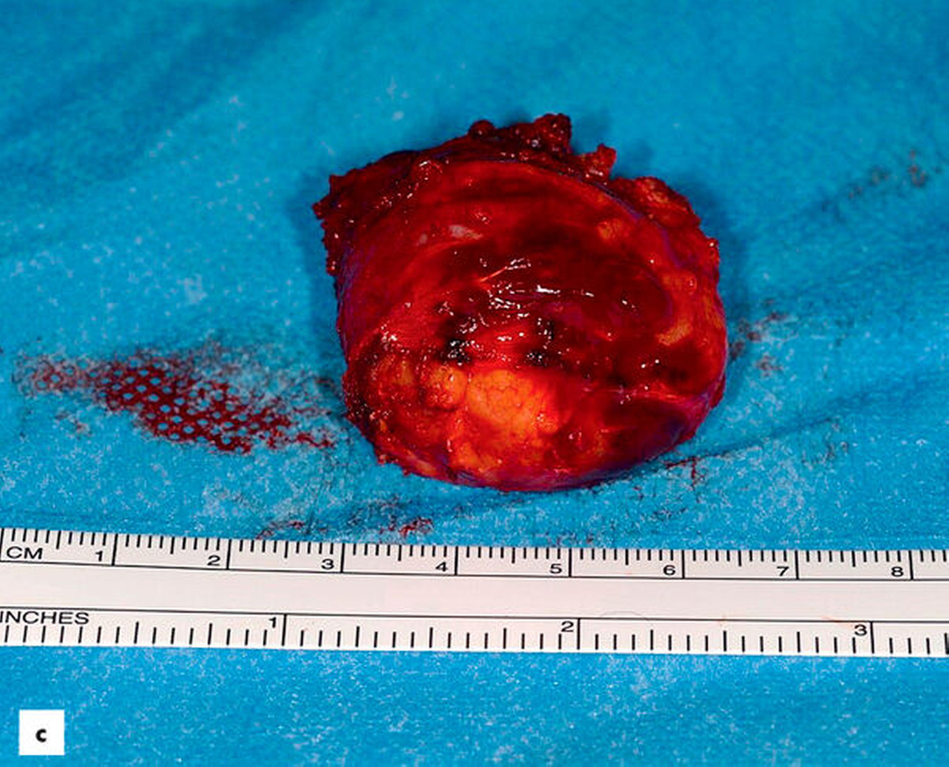 Der Tumor konnte so vollständig entfernt werden (Abbildung 3c). Die histopathologische Beurteilung zeigte monomorphe, basaloid gepackte Zellen mit umgebender Kapsel. Dies entsprach dem Befund eines Basalzelladenoms der Speicheldrüse.
