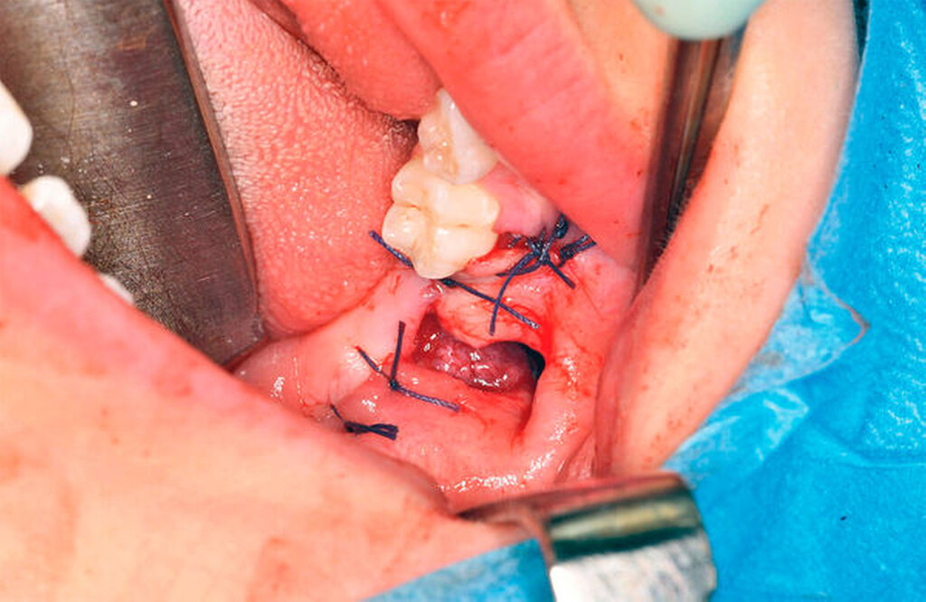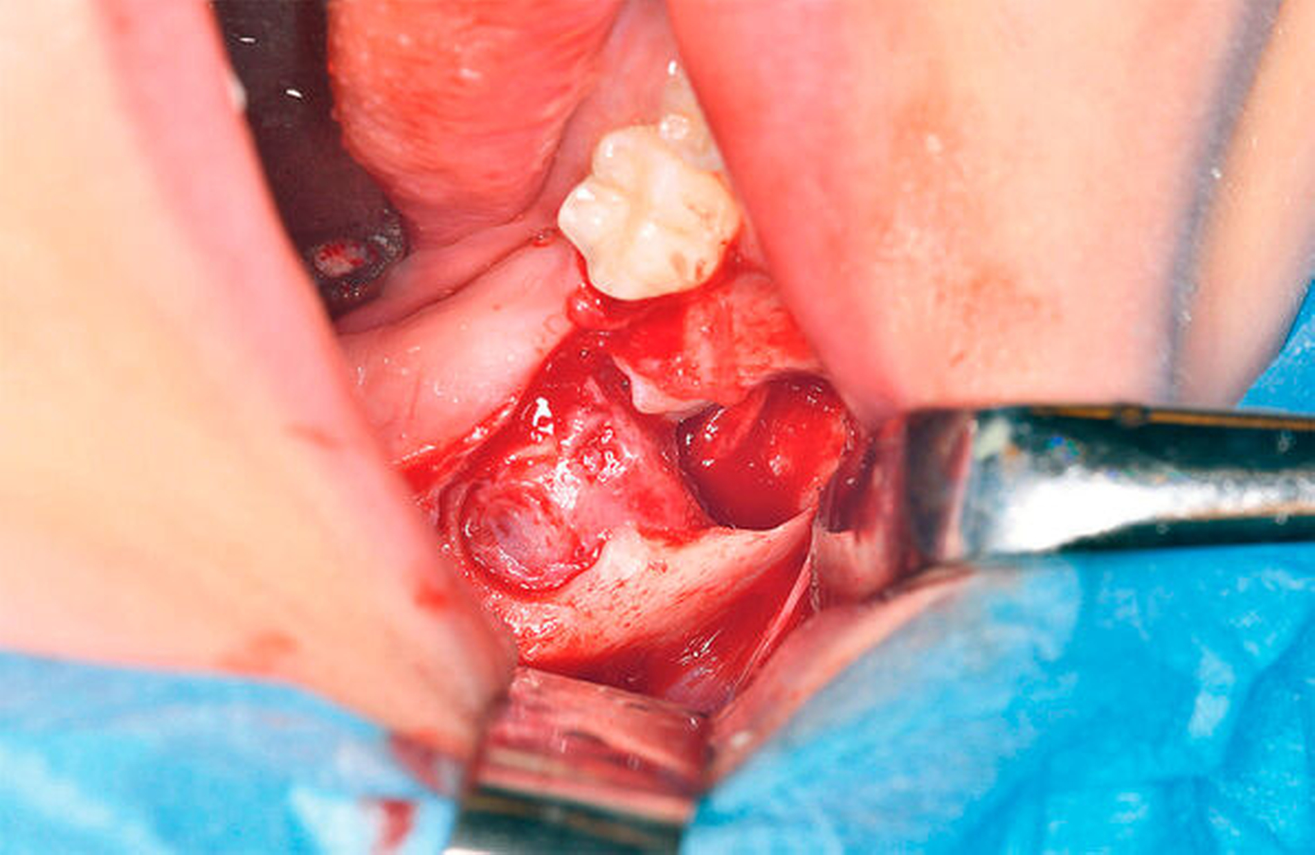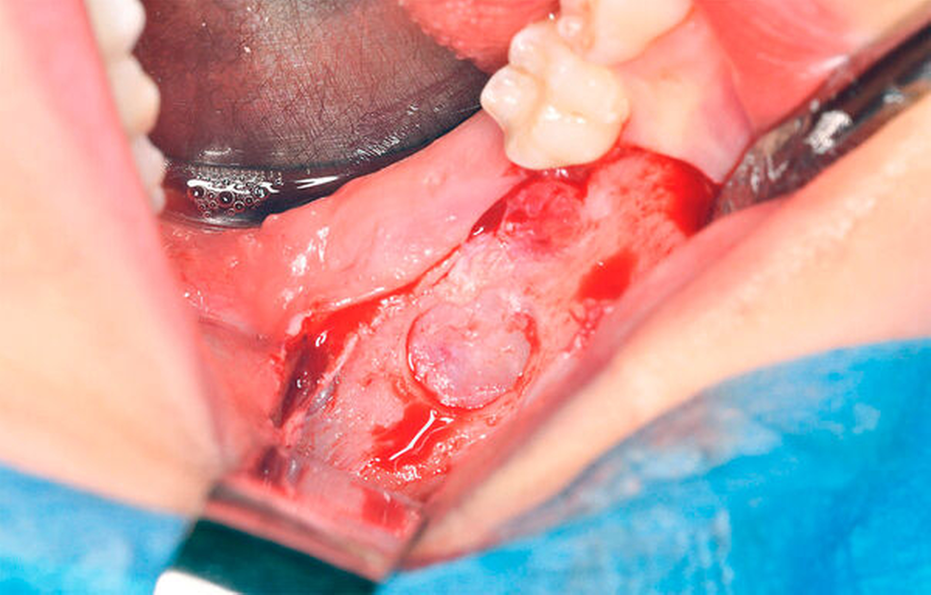 In Intubationsnarkose wurde vom aufsteigenden Ast kommend unter marginaler Schnittführung ein Mukoperiostlappen mit vestibulärer Entlastung am Zahn 45 präpariert. Unter vorsichtiger stumpfer Präparation erfolgte nun die Darstellung der Zyste (Abbildung 4) mit anschließender Eröffnung über einen osteoklastischen Zugang von vestibulär (Abbildung 5). Unter dem Schutz der Zähne 46 und 47 konnte der Zystenbalg mobilisiert und entfernt werden. Abschließend erfolgten der mehrschichtige Wundverschluss mit Fensterung nach vestibulär (Abbildung 6), eine intraoperative Alginatabformung zur Herstellung eines Obturators sowie die Einlage einer Tamponade.