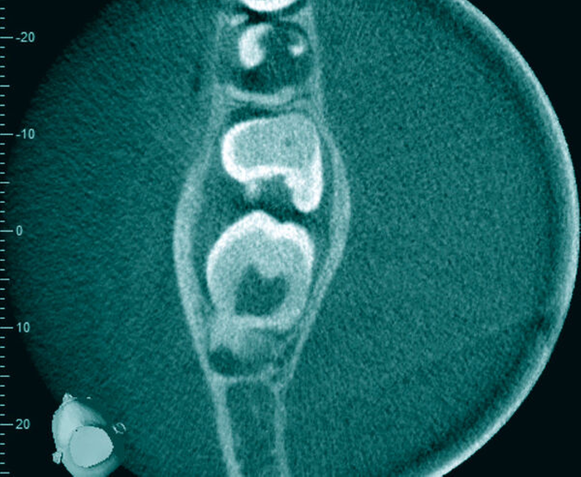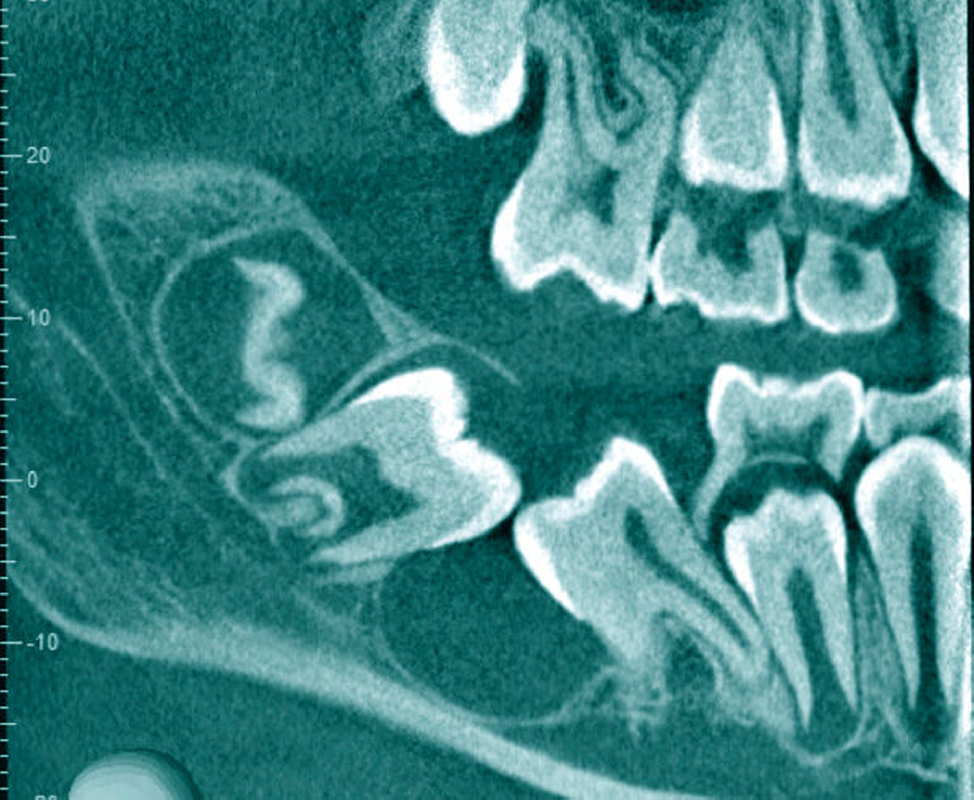 Klinisch präsentierte sich ein gesundes Kind ohne Vorerkrankungen oder auffällige Familienanamnese. Die Inspektion der Mundhöhle zeigte einen leicht verdickten Alveolarkamm im dorsalen 4. Quadranten. Bei Palpation gab der Patient keine Schmerzen an. Ein Fistelgang war nicht zu sondieren. Sensible oder motorische Ausfälle wurden nicht beobachtet. Zur erweiterten Diagnostik erfolgte eine Bildgebung mittels Digitaler Volumentomografie (Abbildungen 2 und 3). Hier bestätigte sich die zystische Raumforderung mit einer Ausdehnung von circa 2,5 cm x 2 cm. Die Kortikalis erschien intakt, wenn auch besonders im lingualen Bereich von geringer Stärke. Die Zähne 46 und 47 zeigten beide keine Zeichen von Resorptionen und der Canalis mandibularis konnte über seinen gesamten Verlauf nachverfolgt werden.