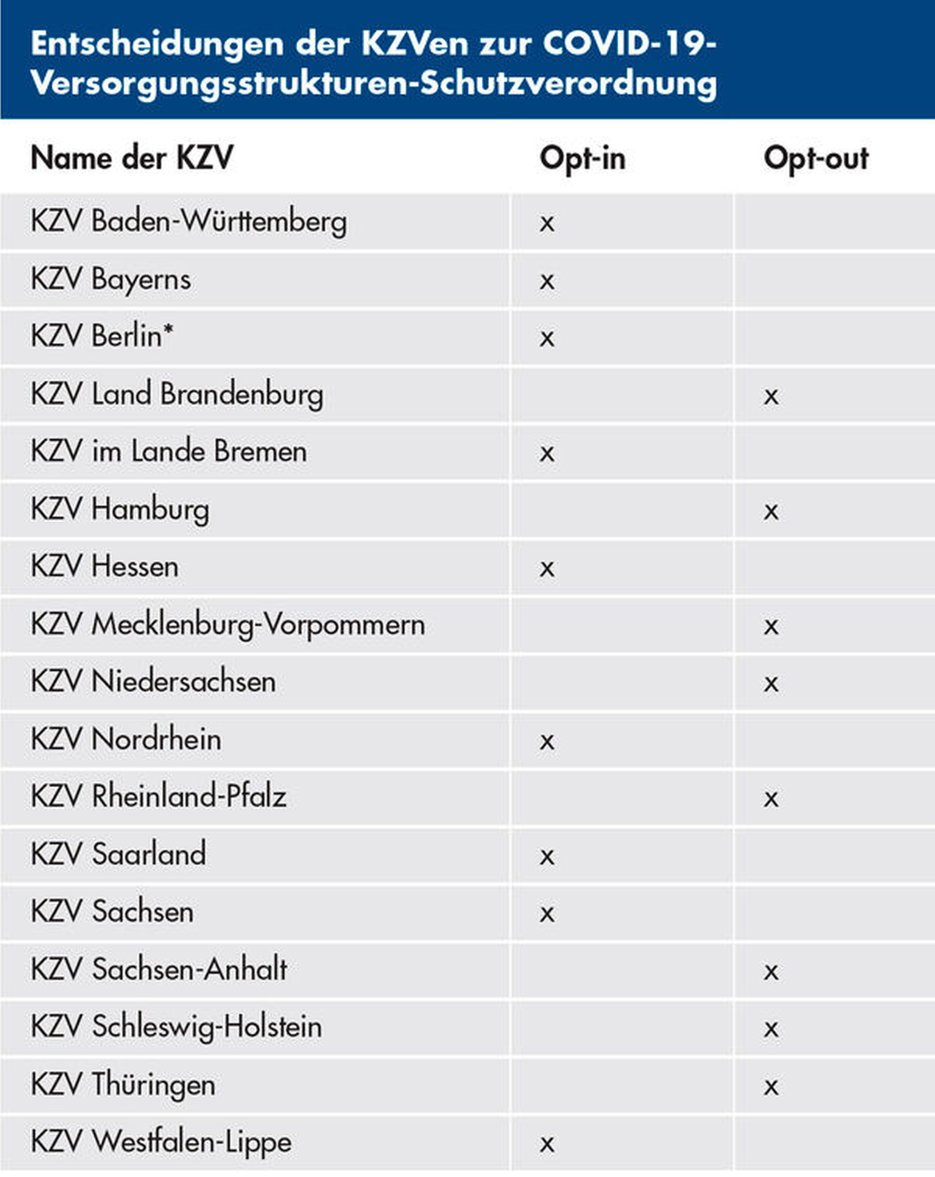 Im Ergebnis haben sich neun KZVen für die Opt-in-Lösung entschieden, acht für die Opt-out-Lösung.