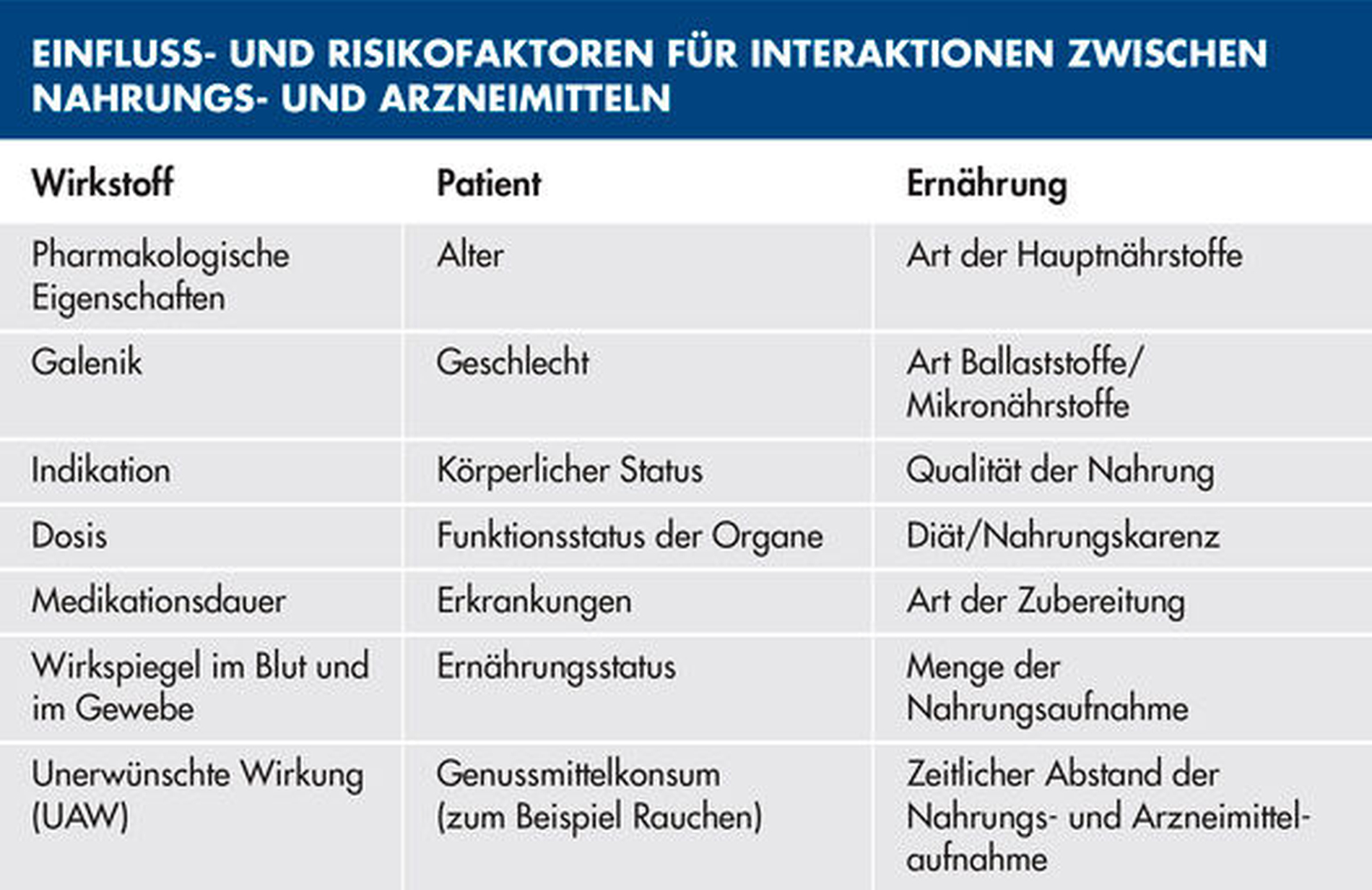 Wechselwirkungen zwischen Arzneimitteln und der Nahrung sind erheblich komplexer als die bekannten Interaktionen zwischen verschiedenen Medikamenten [Smollich und Podlogar, 2016]. Damit ist es sehr schwierig, klinisch relevante Einflüsse vorauszusagen [Gaschott und Stein, 2003]. Die Einflussfaktoren beziehen sich bei den Wechselwirkungen zwischen Nahrungs- und Arzneimitteln sowohl auf den Wirkstoff als auch auf den Patienten und die Ernährung (Tabelle 1). Die Bandbreite der möglichen Interaktionen mit Nahrungsmitteln reicht von leichten Resorptionsverzögerungen über Wirkungsverlust bis zum Auftreten von schweren Nebenwirkungen.