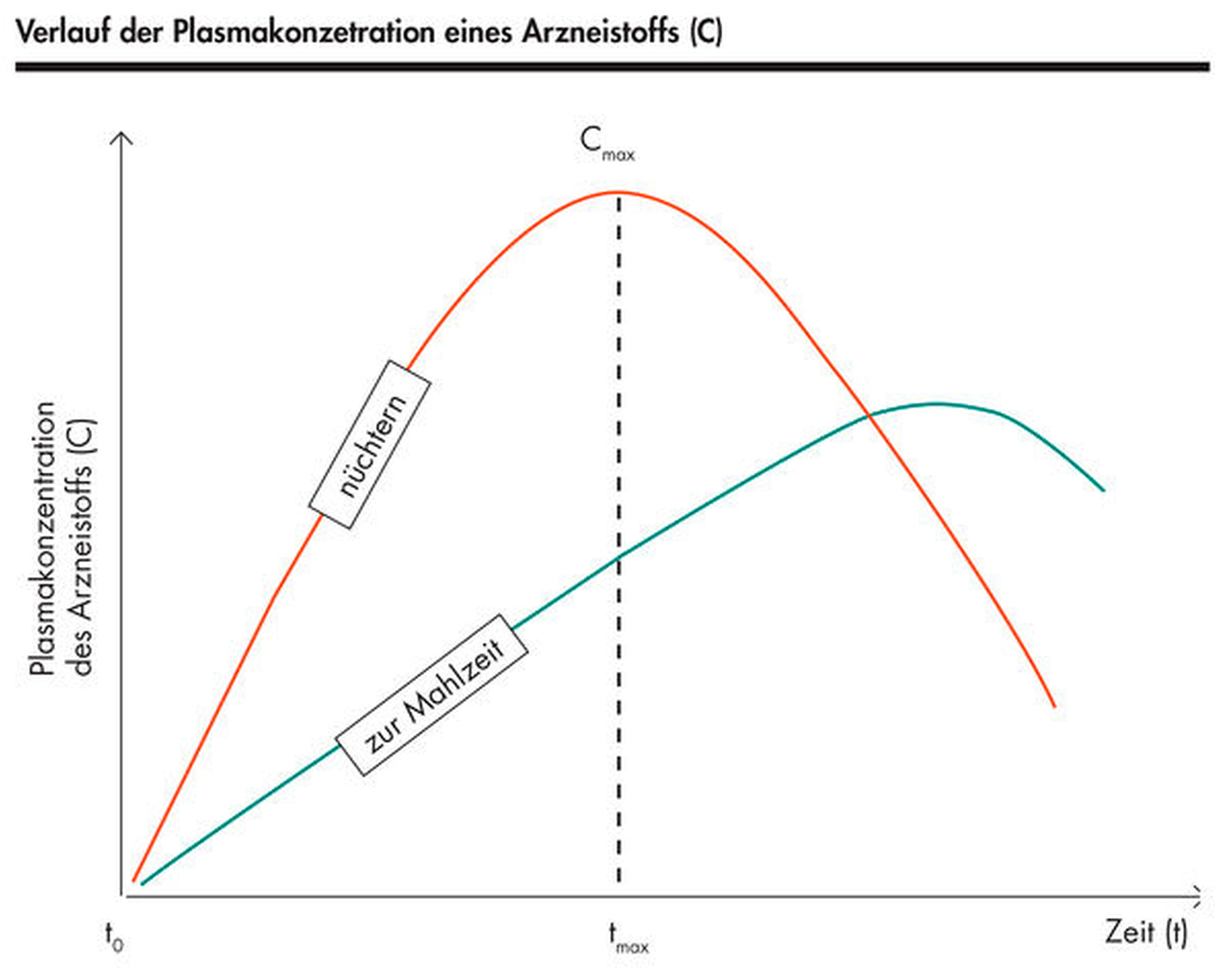 Den größten Einfluss auf die Resorption hat die verzögerte Magenentleerung aufgrund der verringerten Magenmotilität bei Nahrungsaufnahme [Frömming, 1981]. Im Vergleich zur Nüchterneinnahme kann es durch den „negativen Food-Effekt“ bei der Einnahme eines Arzneimittels zu einer Mahlzeit aufgrund der dann verlangsamten Magenentleerung auch zu einer Verlangsamung der Wirkstoffanflutung und zu einer Abflachung der Plasmaspiegelkurve kommen [Smollich und Podlogar, 2016] (Abbildung 1). Diese Effekte treten bei fettreicher, heißer sowie grober Nahrung besonders stark auf [Frömming, 1981; Gaschott und Stein, 2003].