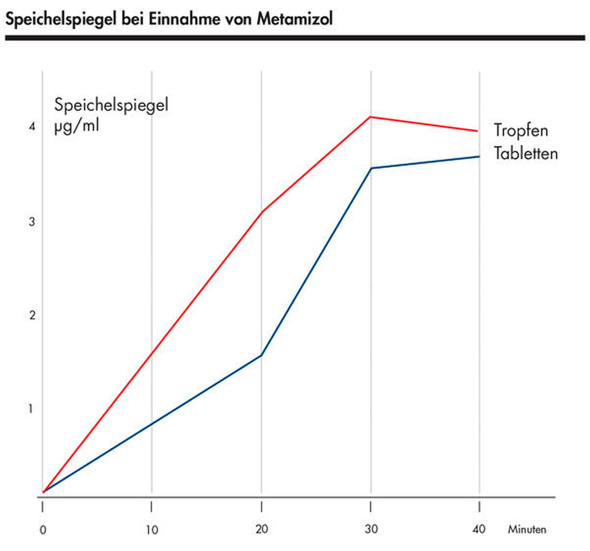Zwar führt die Einnahme von sauren Analgetika (zum Beispiel Ibuprofen, Acetylsalicylsäure) auf nüchternen Magen ebenfalls zu einer schnelleren Absorption und einem beschleunigten Wirkungseintritt, allerdings besteht bei diesen Wirkstoffen dann ein erhöhtes Risiko für gastrointestinale Schleimhautreizungen und sogar Blutungen [Verspohl, 2002; Wisker, 2010]. Bei vollem Magen empfehlen sich Tropfen, Säfte oder Brausetabletten, denn sie gelangen am Mageninhalt vorbei zum Pylorus und in den resorptionsaktiven Dünndarm [Verspohl, 2002; Freitag-Ziegler, 2015]. Die zumeist bessere Resorption von Tropfen gegenüber Tabletten zeigt sich deutlich bei Metamizol. In einer klinischen Studie war der Speichelspiegel nach oraler Gabe von 1 g Metamizol (als Tropfen beziehungsweise Tabletten) 20 Minuten nach der Einnahme bei den Tropfen doppelt so hoch wie bei den Tabletten [Rohdewald, 1983] (Abbildung 2).