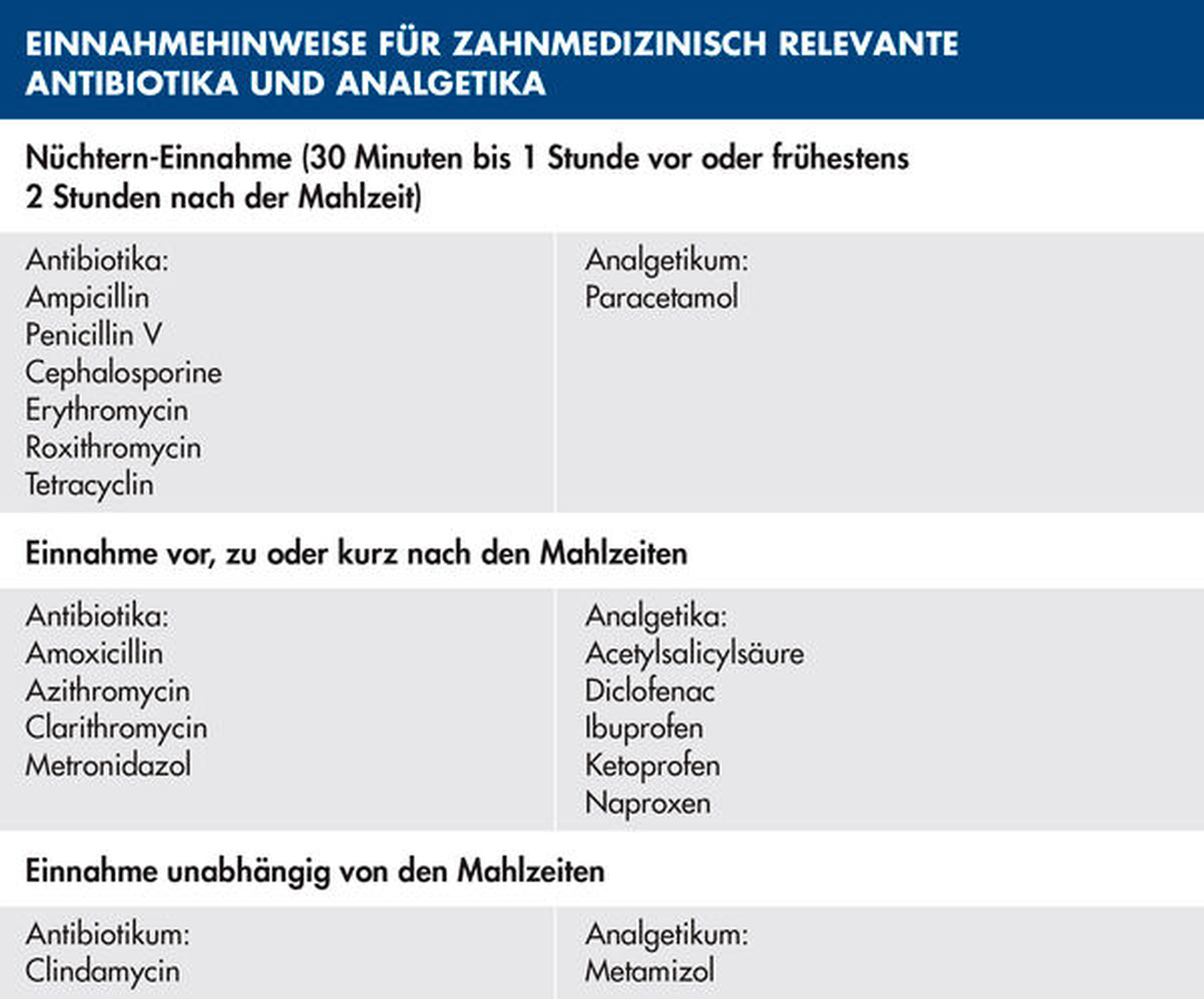 Für die meisten Antibiotika kann die Einnahme etwa eine Stunde vor dem Essen mit ausreichend Flüssigkeit empfohlen werden. So ergeben sich für die säurelabilen Arzneistoffe kürzere Kontaktzeiten mit dem Magensaft sowie geringere Verweilzeiten im Darm, so dass Durchfälle als Zeichen einer Beeinträchtigung der Darmflora seltener auftreten. Außerdem entstehen hohe Blutspiegelspitzen, bei denen auch weniger sensible Erreger geschädigt werden, die eine höhere minimale Hemmkonzentration aufweisen [Verspohl, 2002]. Die Hersteller empfehlen trotzdem bei Amoxicillin die Einnahme zur Mahlzeit. Bei dieser Überlegung hat die Vermeidung von Nebenwirkungen (Übelkeit, Erbrechen) Vorrang vor der möglichen Verringerung der Bioverfügbarkeit [Verspohl, 2002]. Eine Übersicht der Einnahmehinweise der für die Zahnmedizin relevanten Pharmaka ist in Tabelle 2 dargestellt.