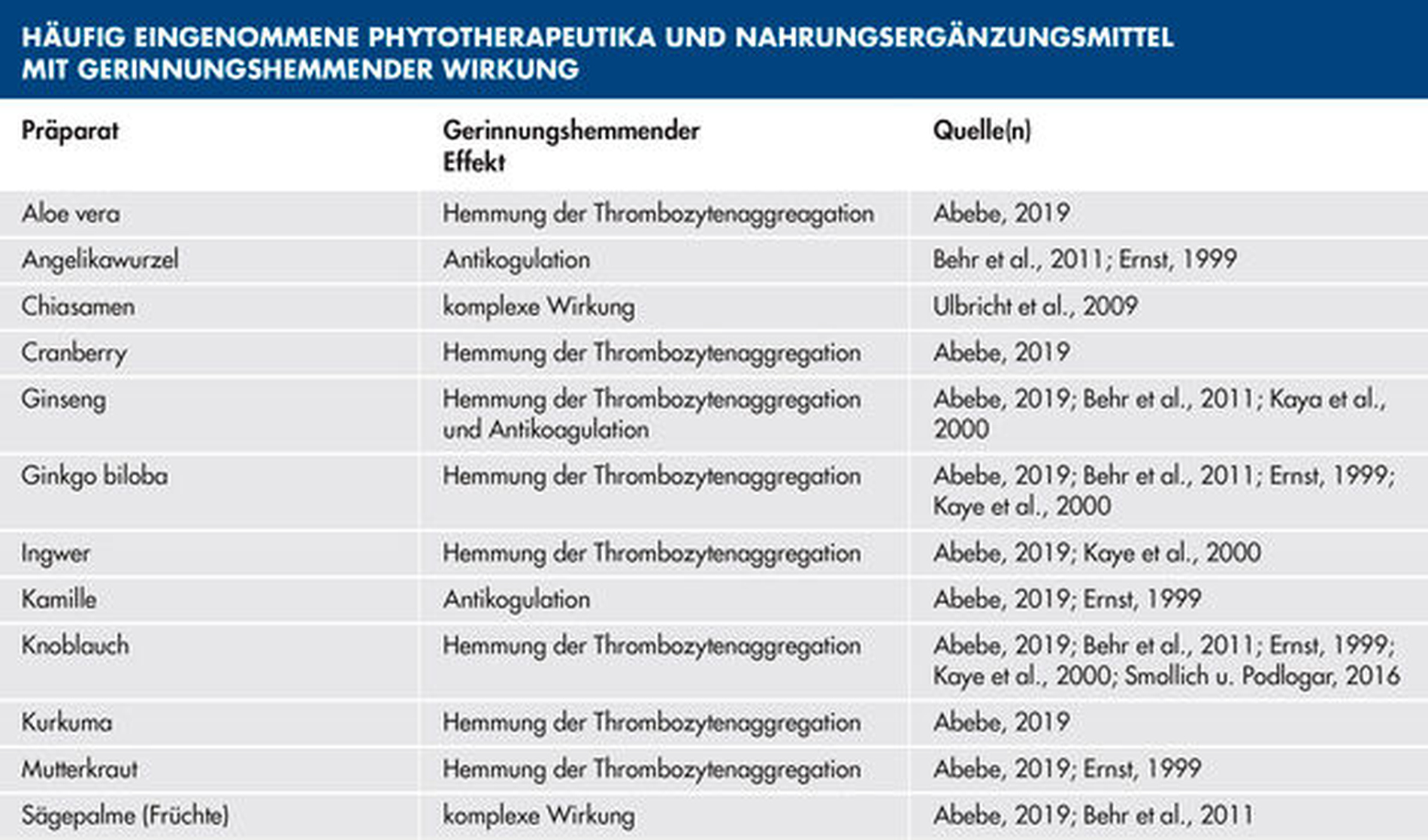 In einem aktuellen Review zur Bedeutung der pflanzlichen Arzneien für die Zahnmedizin wurden die Phytotherapeutika entsprechend ihrer Hauptwirkung auf die Blutgerinnung in vier Gruppen eingeteilt [Abebe, 2019] (Tabelle 3):