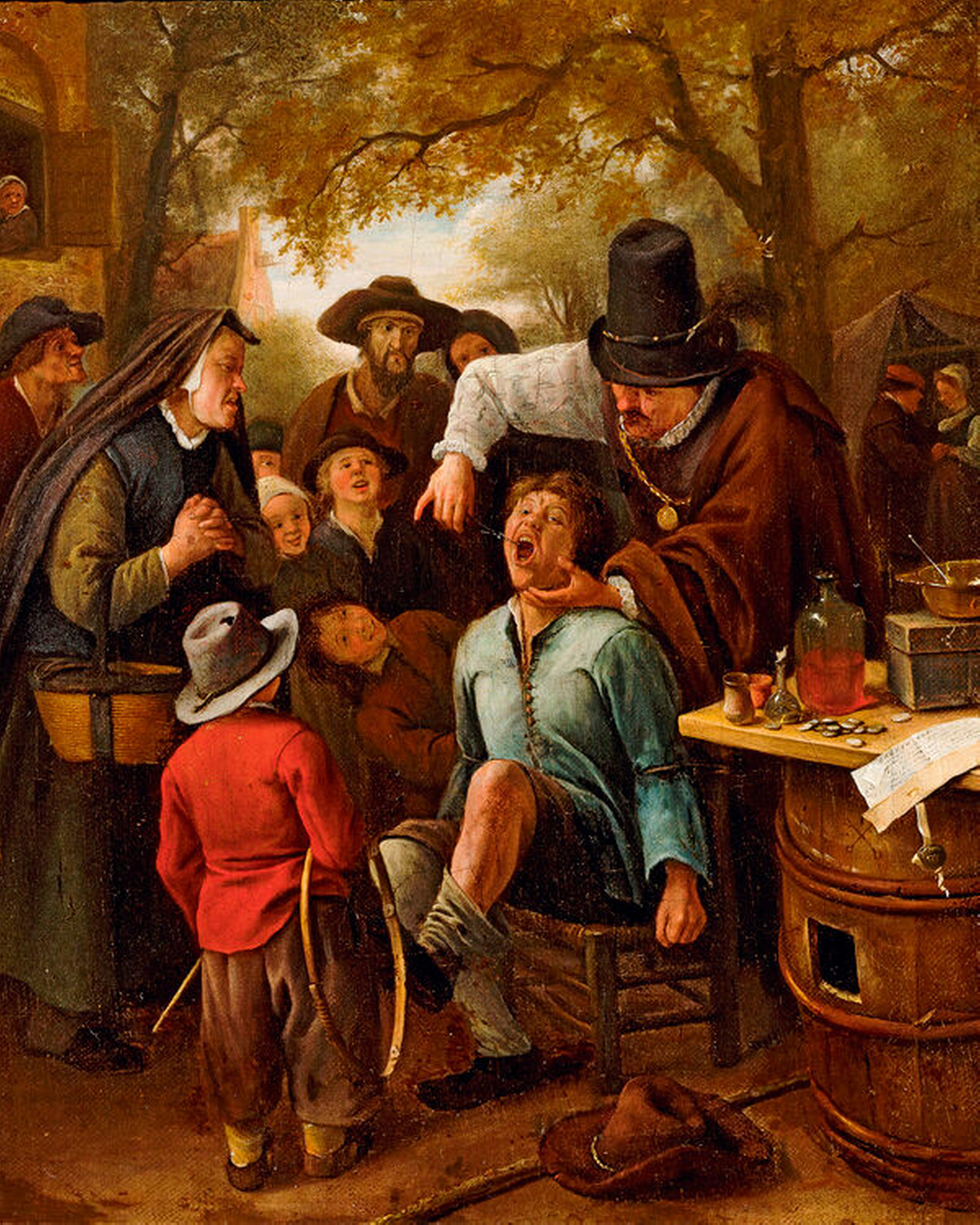 Der Reigen der ausgestellten Künstler erfasst die Meister der frühen Neuzeit und Renaissance wie Hieronymus Bosch und Pieter Bruegel d. Ä. über Pablo Picasso und Andy Warhol bis zu Cindy Sherman. Rund um die Zähne wird ein Genrebild aus dem Goldenen Zeitalter des niederländischen Malers Jan Havickszoon Steen gezeigt, wo einem jungen Mann vor Publikum ein Zahn gezogen wird. Eine moderne Variante zeigt Zahnprothesen und Brücken aus Kunststoff und Metall in einem Kasten, die der französisch-amerikanische Objektkünstler Arman (Armand Pierre Fernandez) 1960 angeordnet hat. Zu sehen ist auch Andy Warhols „Saint Apollonia“, die er 1984 als Farbserigrafie auf Karton geschaffen hat und die in ihrem Stil den Malereien aus Pompeji gleicht.