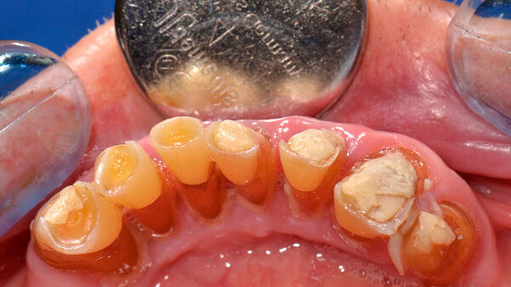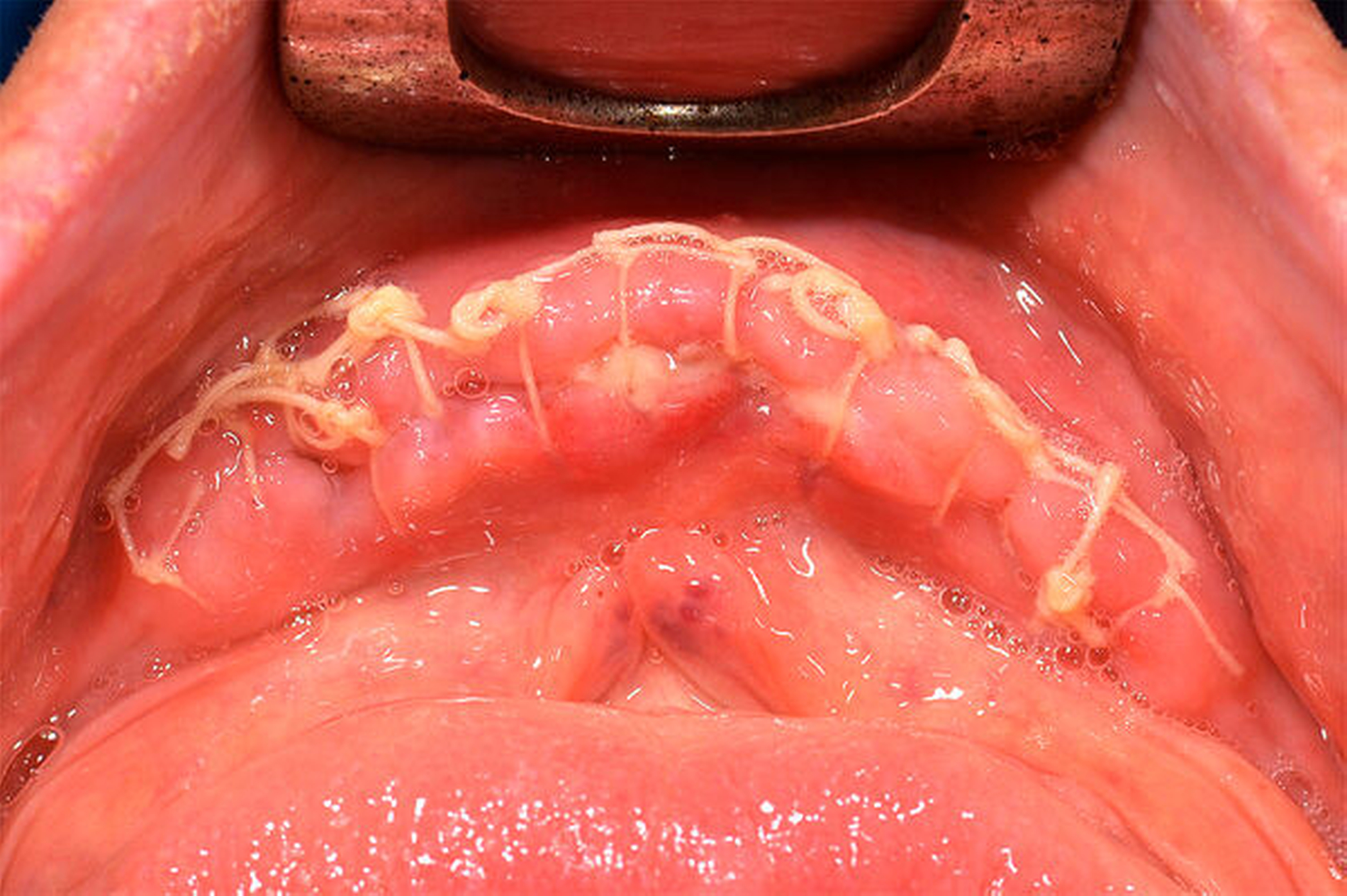Im ersten Schritt erfolgte die intraligamentäre Anästhesie der zu entfernenden Zähne mit 4-prozentigem Articain mit einem Adrenalinzusatz von 1:400.000 (Ubistesin®, 3M Espe, Seefeld). Anschließend fand die gewebeschonende Extraktion der Restbezahnung und die vollständige Entfernung des Granulationsgewebes statt. Die marginale Gingiva wurde zur besseren Adaptation der Schleimhaut dezent mobilisiert und nach Einlage von Tranexamsäure-getränkten Kollagenschwämmen (Hemocollagene®, Septodont, Niederkassel) erfolgte der Wundverschluss mittels resorbierbarem Nahtmaterial (Vicryl® 3.0, Ethicon, Hallbergmoos). Zur Kompression wurden zwei Aufbisstupfer für 30 Minuten eingelegt. Aufgrund der Zahnlosigkeit und der damit verbundenen erschwerten suffizienten Fixierung einer Verbandsplatte wurde auf diese verzichtet.