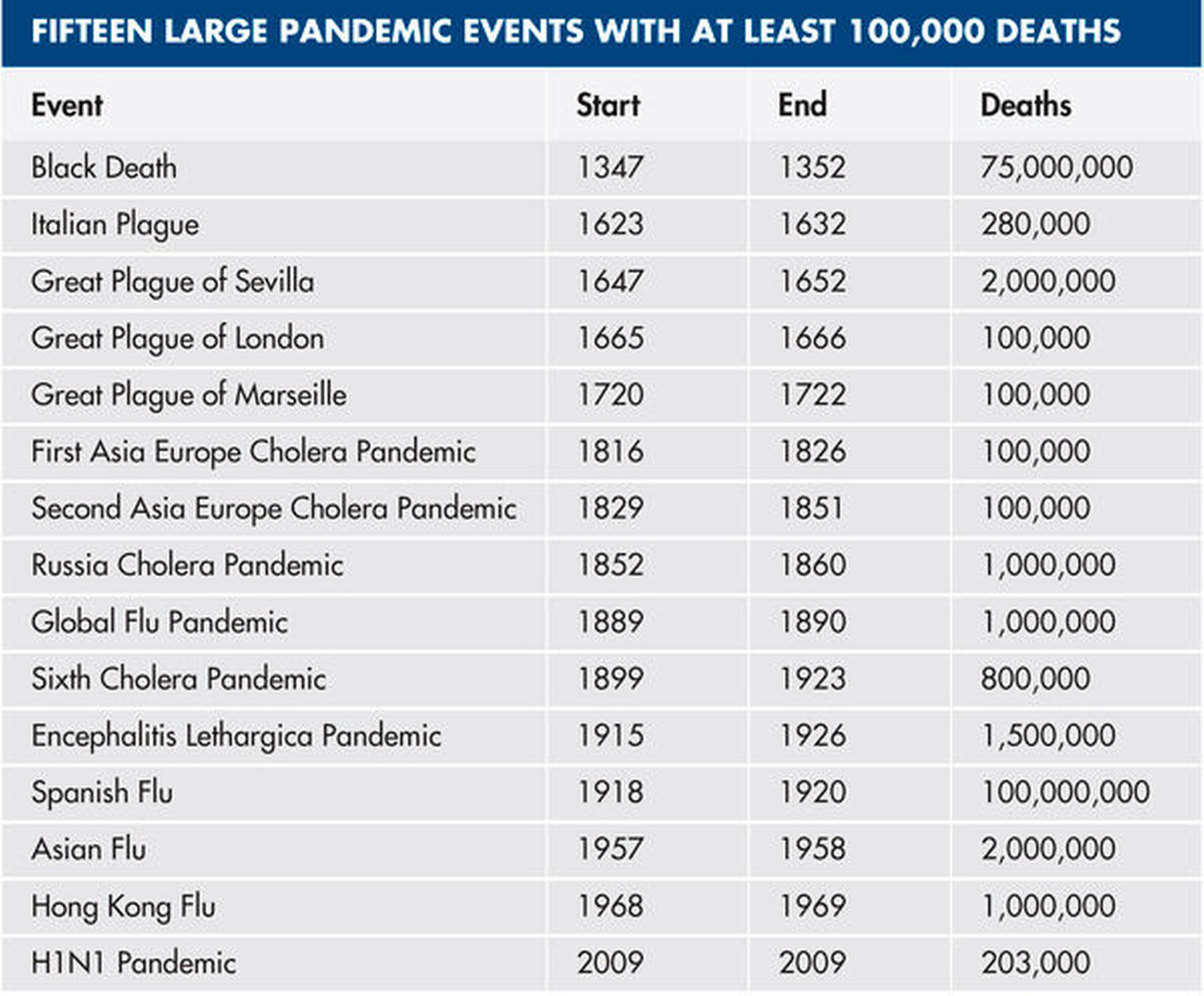 Die größte untersuchte Seuche ist die Spanische Grippe, die in den Jahren 1918 bis 1920 rund 100 Millionen Menschen das Leben kostete. Auf Platz zwei folgt die Pest, der „Schwarze Tod“, der in den Jahren 1347 bis 1352 in Europa wütete und 75 Millionen Menschen tötete. Platz drei belegen die „Great Plague of Sevilla“, die Pestwelle, der 1647 bis 1652 rund zwei Millionen Menschen zum Opfer fielen, und die Asiatische Grippe, die in den Jahren 1957 bis 1958 ebenfalls zwei Millionen Menschen tötete.