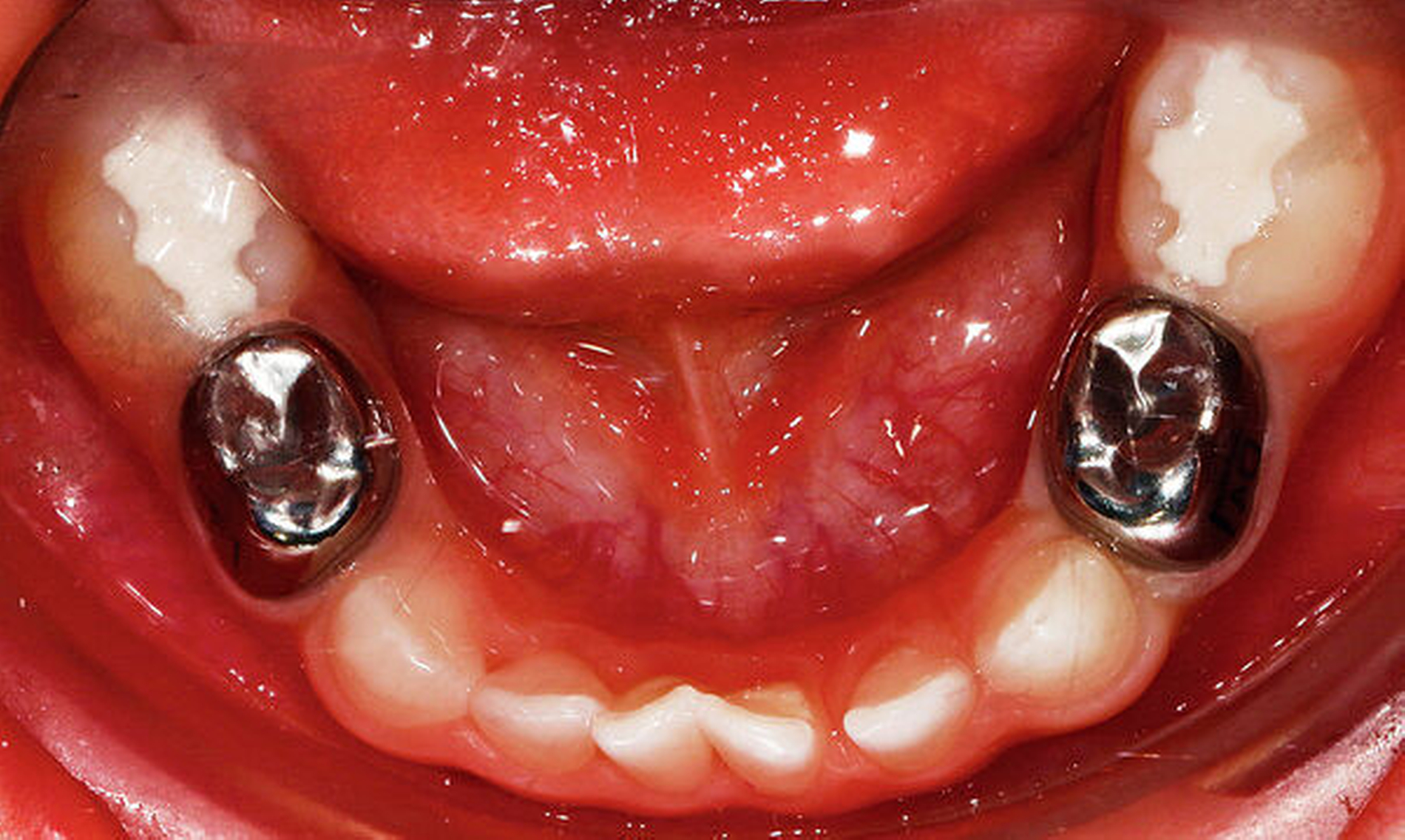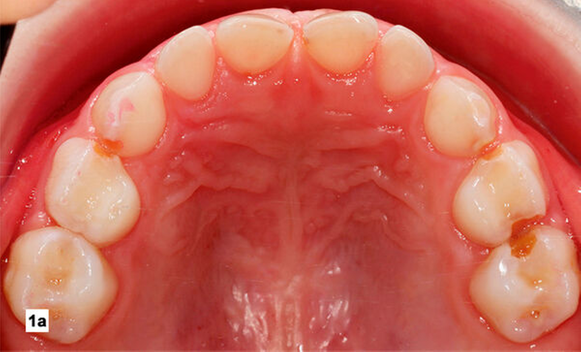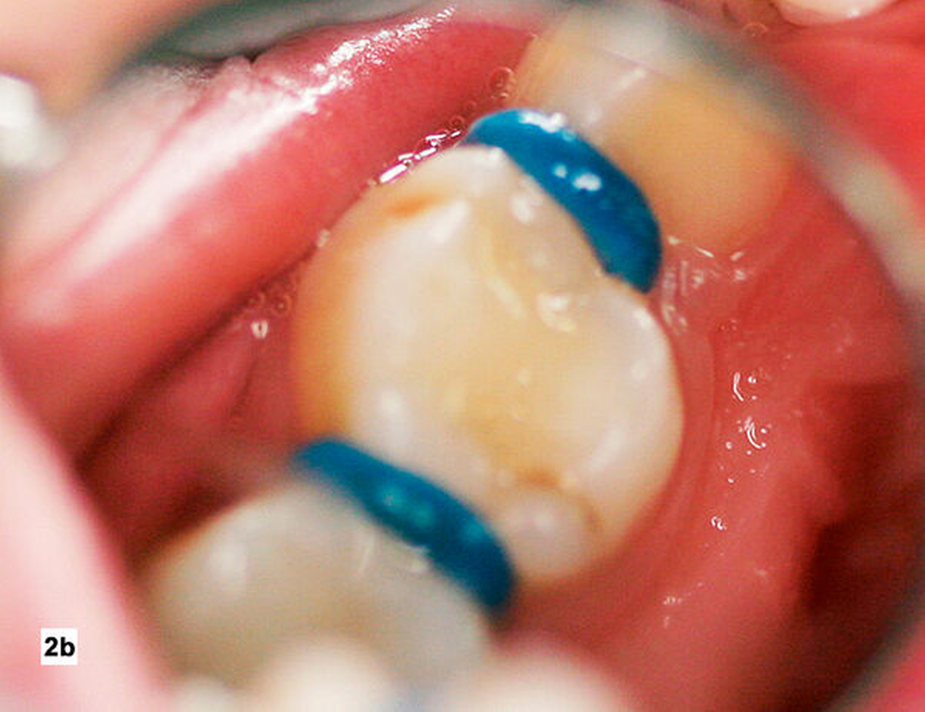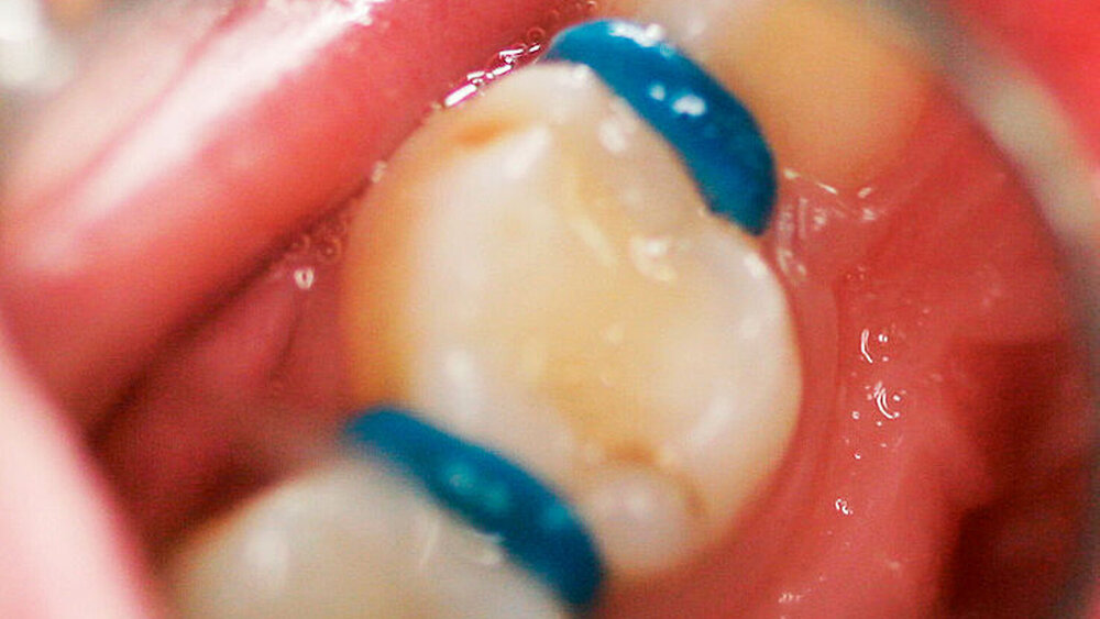 Bei der Hall-Technik (HT) handelt es sich um eine minimal-invasive Behandlung für kariöse Milchmolaren, bei der im Gegensatz zur konventionellen Stahlkronenversorgung keine Lokalanästhesie, keine Präparation und keine Kariesentfernung erfolgt, sondern lediglich eine vorgefertigte Stahlkrone auf einen für diese Technik geeigneten kariösen, pulpal asymptomatischen Milchmolaren zementiert wird [Santamaria et al., 2018; Innes et al., 2007). Bei sehr engen Approximalkontakten kann nach einer Zahnseparation mittels orthodontischer Separiergummis in der Regel eine Stahlkronenversorgung in der Hall-Technik sehr leicht durchgeführt werden. Die der Standardfüllung überlegenen Erfolgsraten der Hall-Technik (2-Jahres-Erfolgsraten 90-100 Prozent versus circa 50-80 Prozent bei Füllungen) sind mit einem hohen Evidenzgrad in der vorliegenden wissenschaftlichen Literatur belegt [Innes et al., 2007; Santamaria et al., 2020; Innes et al., 2015]. Die Behandlung eines Patienten mittels Hall-Technik ist in den Abbildungen 2a bis 2c dargestellt. Einen Hinweise auf weiterführende Literatur dazu finden Sie am Ende des Beitrags.