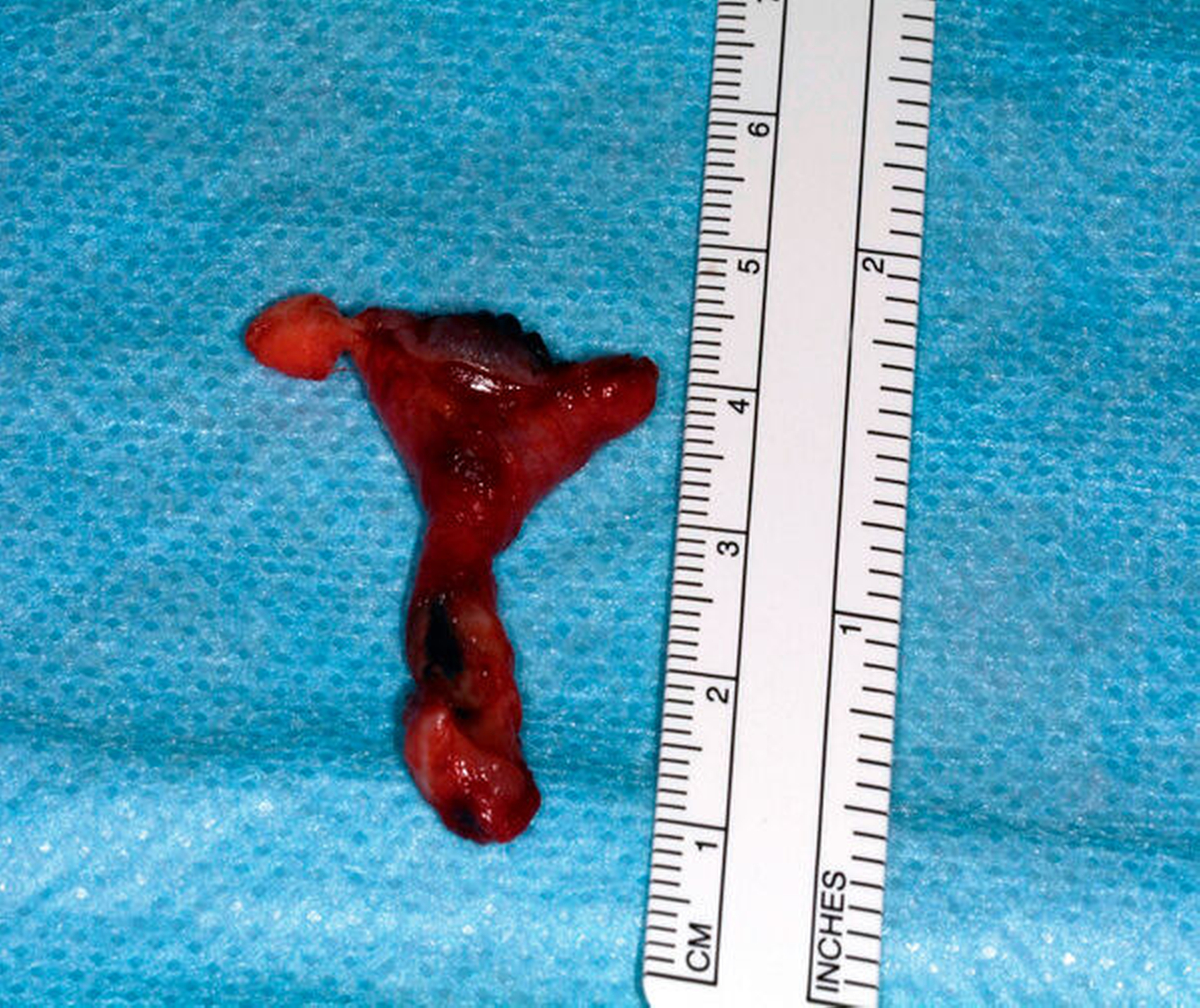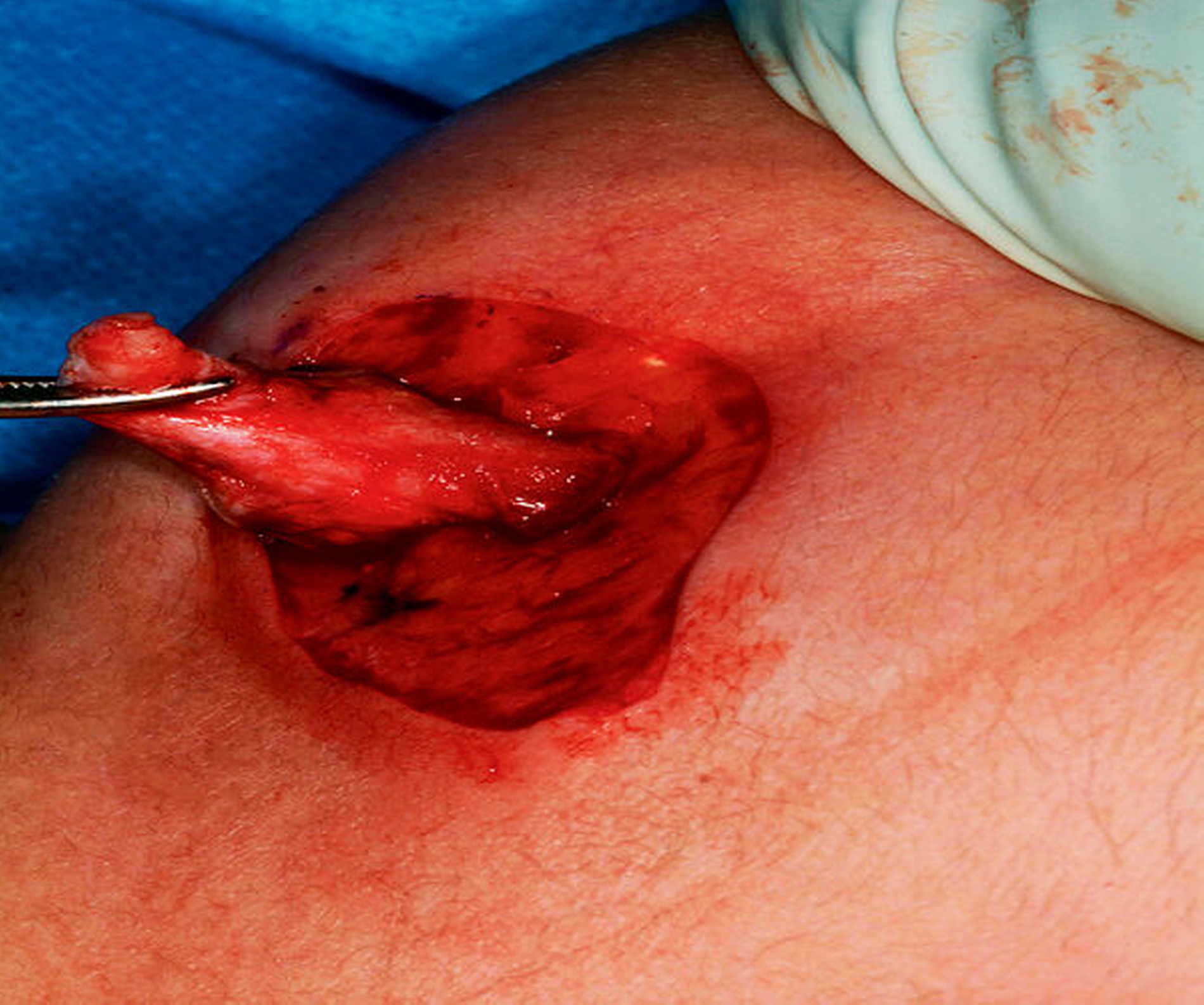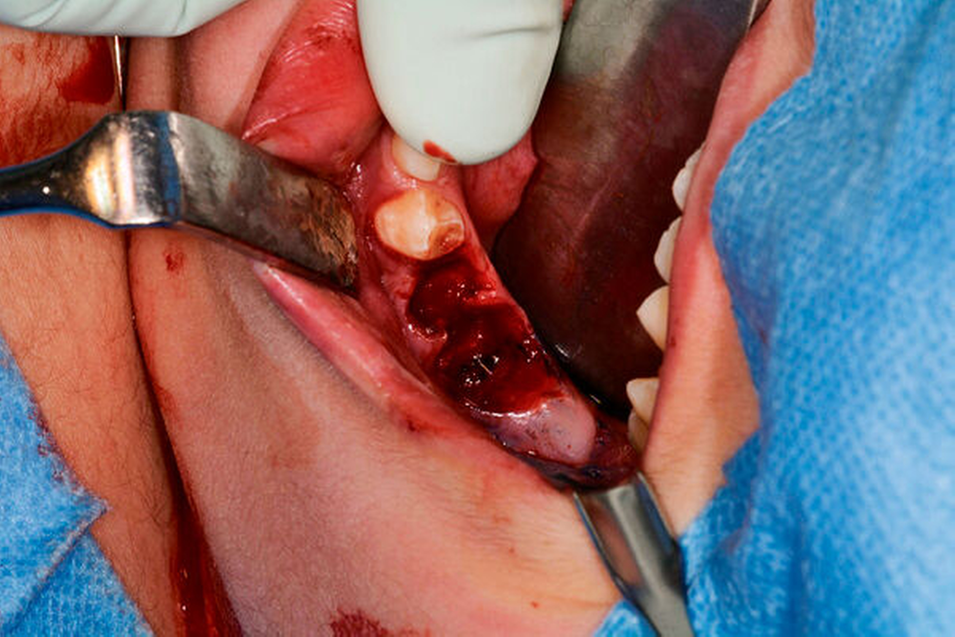 Therapeutisch wurde die Extraktion der Zähne 75 und 36 sowie die Fistelexzision mit Narbenkorrektur von extraoral in Vollnarkose durchgeführt. Hierzu wurde der Fistelgang zunächst sondiert und mit Methylenblau markiert (Abbildungen 3 und 4). Aus der Extraktionsalveole in Regio 36 trat das Färbemittel in die Mundhöhle über (Abbildung 5). Unter Umschneidung des Narbenkeloids wurde die Fistel mit lingualer Anheftung am Periost freipräpariert und in toto reseziert (Abbildungen 6 bis 8). Die histopathologische Aufarbeitung des entnommenen Resektats ergab eine chronisch-floride, granulierende Entzündung mit Fistelgang, passend zum klinischen Befund einer Partsch-Fistel.