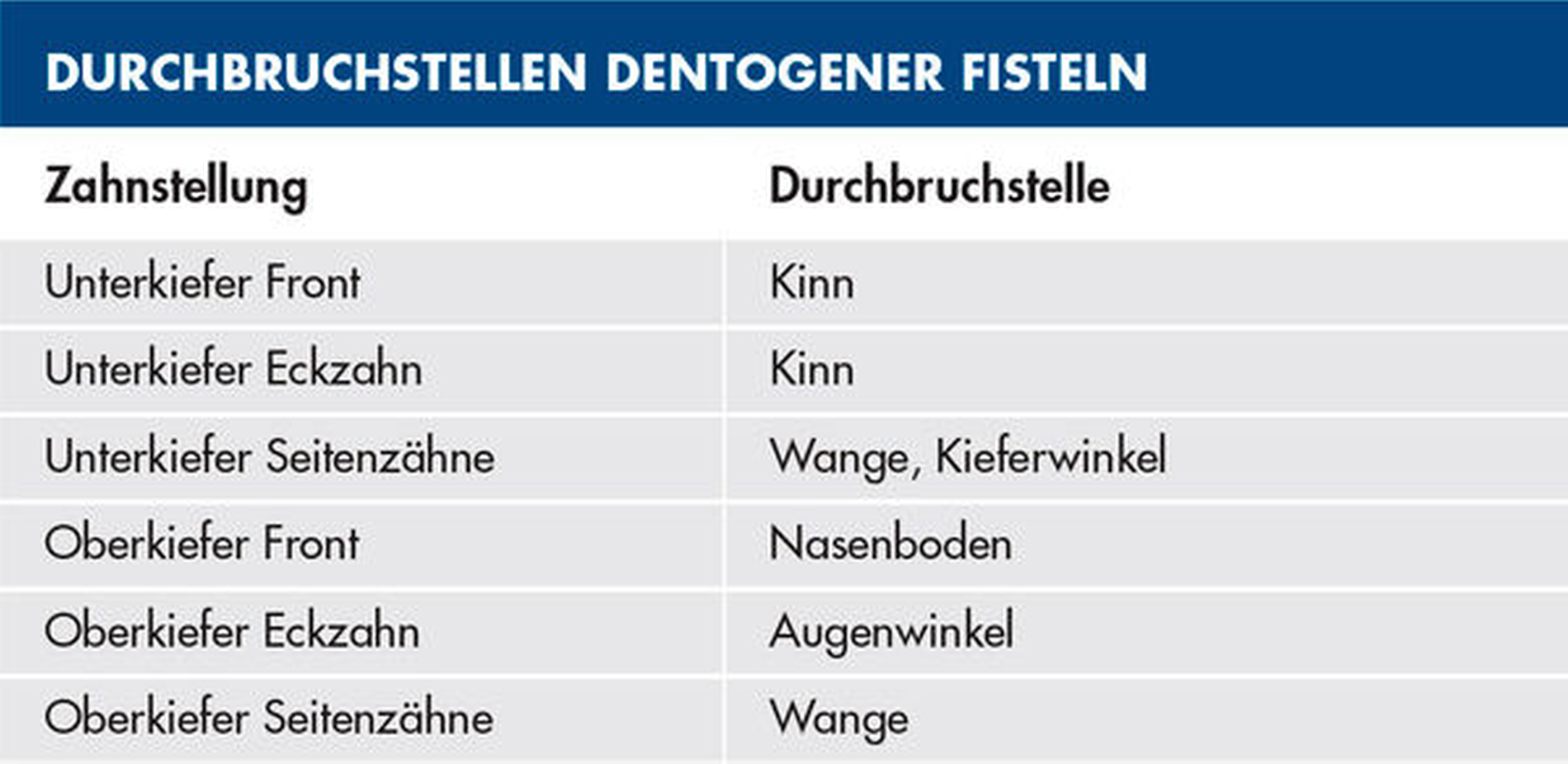 Die Bildung extraoraler Fisteln wird im Unterkiefer häufiger als im Oberkiefer beobachtet [Sammut et al., 2013], wobei regelmäßig der Kieferwinkel betroffen ist [Guevara-Gutierrez et al., 2015]. Die Lage der Durchbruchstelle bei diesem chronischen Entzündungsprozess durch die Weichteile nach extraoral ist abhängig von den ursächlichen Zähnen. Daher kann das klinische Erscheinungsbild für die Suche nach dem dentogenen Fokus hilfreich sein [Partsch et al., 1924]. So können apikale Beherdungen an den Frontzähnen des Oberkiefers zu einer Fistelmündung im Bereich des Nasenbodens führen [Fowler et al., 2000]. Apikale Entzündungen ausgehend von den Eckzähnen im Oberkiefer manifestieren sich beispielsweise häufig als Fisteln im Bereich der Augenwinkel. Fisteln im Bereich der Wange finden hingegen ihren Ursprung regelmäßig in den oberen Seitenzähnen. Apikale Entzündungen der Front- und Eckzähne im Unterkiefer können zur Perforation der Fistel im Bereich des Kinns und im Seitenzahnbereich des Unterkiefers zur Fistelmündung im Bereich der Wange und des Kieferwinkels führen [Buch et al., 2003] (Tabelle 1).