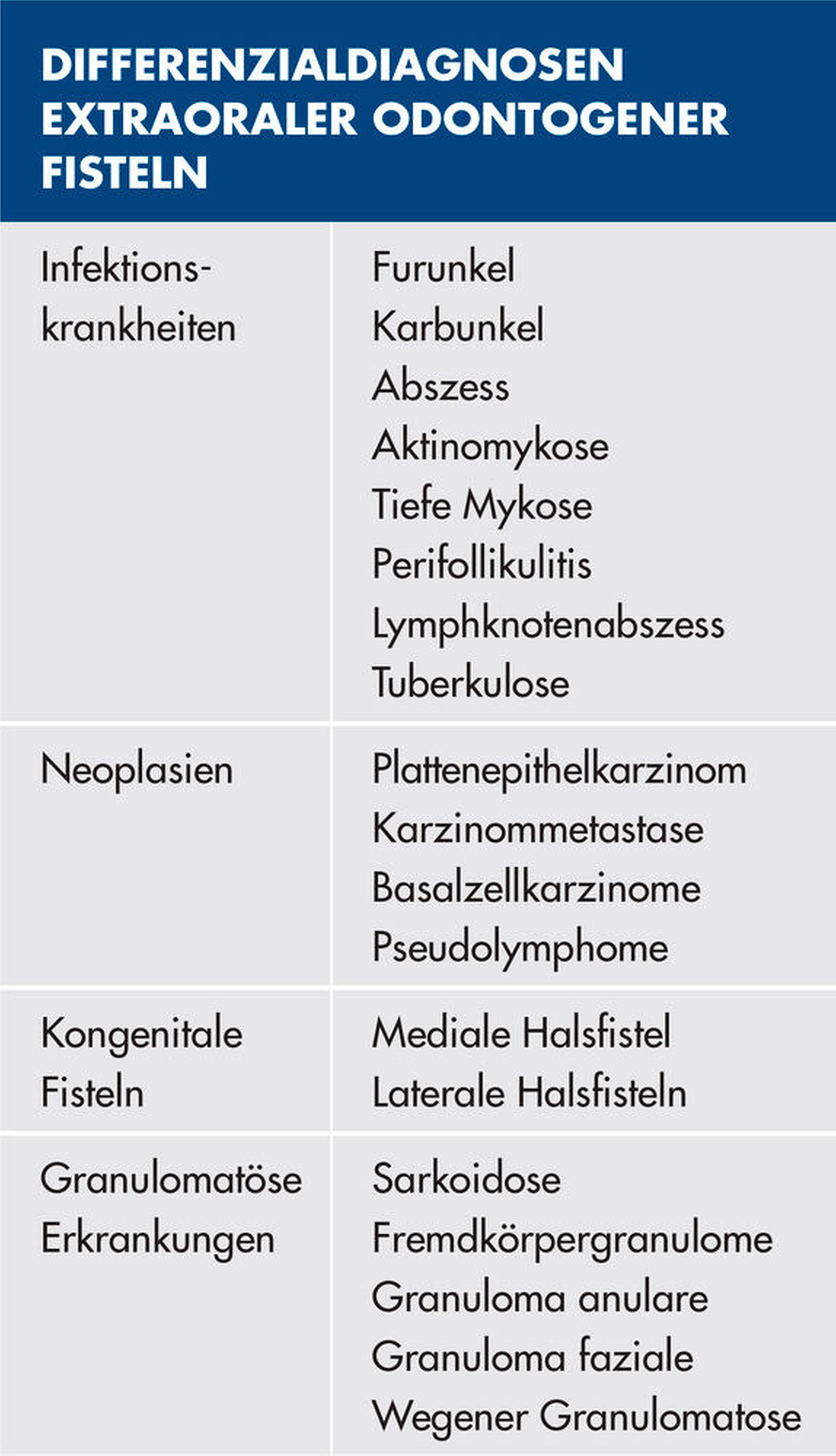 Bei extraoralen odontogenen Fisteln mit Kontakt zur Haut sollten in Abhängigkeit des klinischen Befunds verschiedene Differenzialdiagnosen berücksichtigt werden (Tabelle 2). Bei klinisch unbezahntem Kiefer können Radix relicta ebenfalls zu einem apikalen Entzündungsprozess führen. Insgesamt ist eine interdisziplinäre Betrachtung zwischen Dermatologen, HNO-Ärzten und Mund-, Kiefer- und Gesichtschirurgen oft unabdingbar, um Fehldiagnosen und Fehltherapien zu vermeiden.