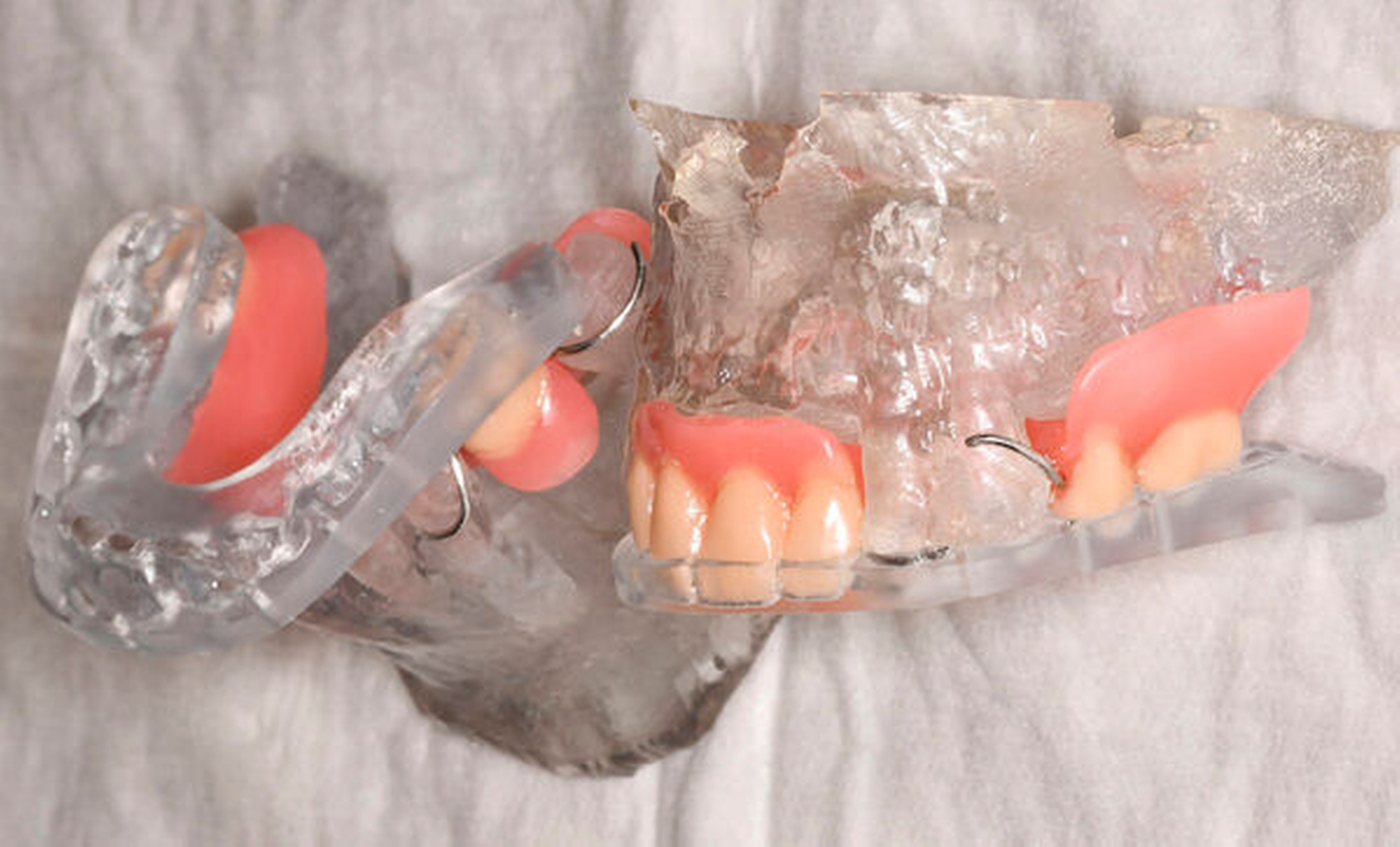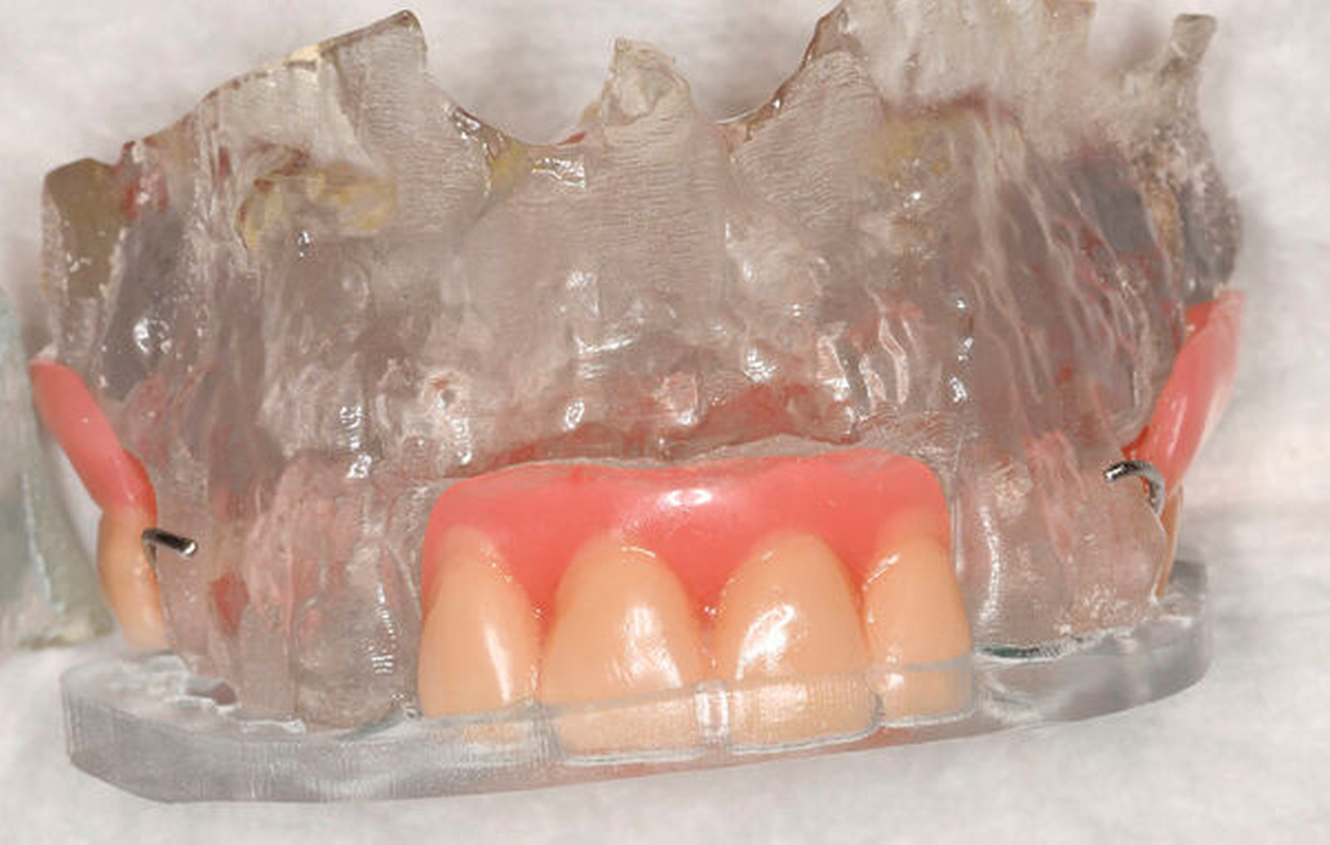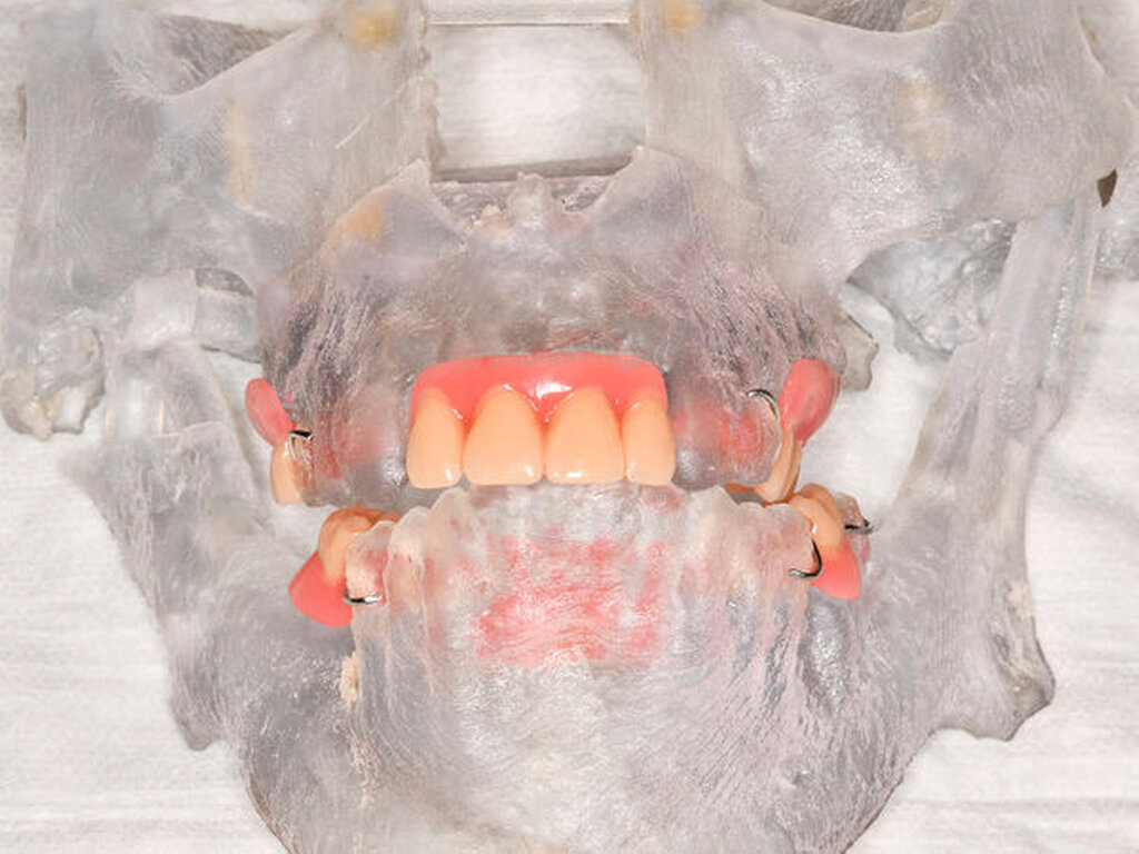 Aufgrund der fehlenden Dringlichkeit zur dentalen Sanierung und der Komplexität des Krankheitsbildes erfolgte die Wiedervorstellung des Patienten zur Planung und Erstellung eines interdisziplinären Behandlungskonzepts, das ohne Möglichkeit einer kieferorthopädischen Vor- oder Nachbehandlung aufgrund des geringen Restzahnbestands aus einem kieferchirurgisch-prothetischen Therapieansatz bestand. Grundpfeiler der Therapieplanung und Durchführung bildeten der beidseitige alloplastische Kiefergelenksersatz mittels Patienten-individueller Implantate mit gleichzeitiger Unter- und Oberkiefervorverlagerung sowie die Anfertigung einer Ober- und einer Unterkieferprothese nach Extraktion der nicht erhaltungswürdigen Zähne nach dem Ampelsystem der DGZMK im Sinne des synoptischen Behandlungskonzepts als 3-D-virtuelles „backward planning“. Dabei diente die prothetische Interimsversorgung sowohl der intraoperativen, Splint-gestützten Verschlüsselung der Zielokklusion als auch der postoperativen Okklusionssicherung. Die Planung und laborseitige Herstellung der Zahnprothese erfolgte ausschließlich auf Basis der 3-D-gedruckten Patientenmodelle, da eine suffiziente intraorale Abformung aufgrund der stark eingeschränkten Mundöffnung nicht möglich war (Abbildung 3).