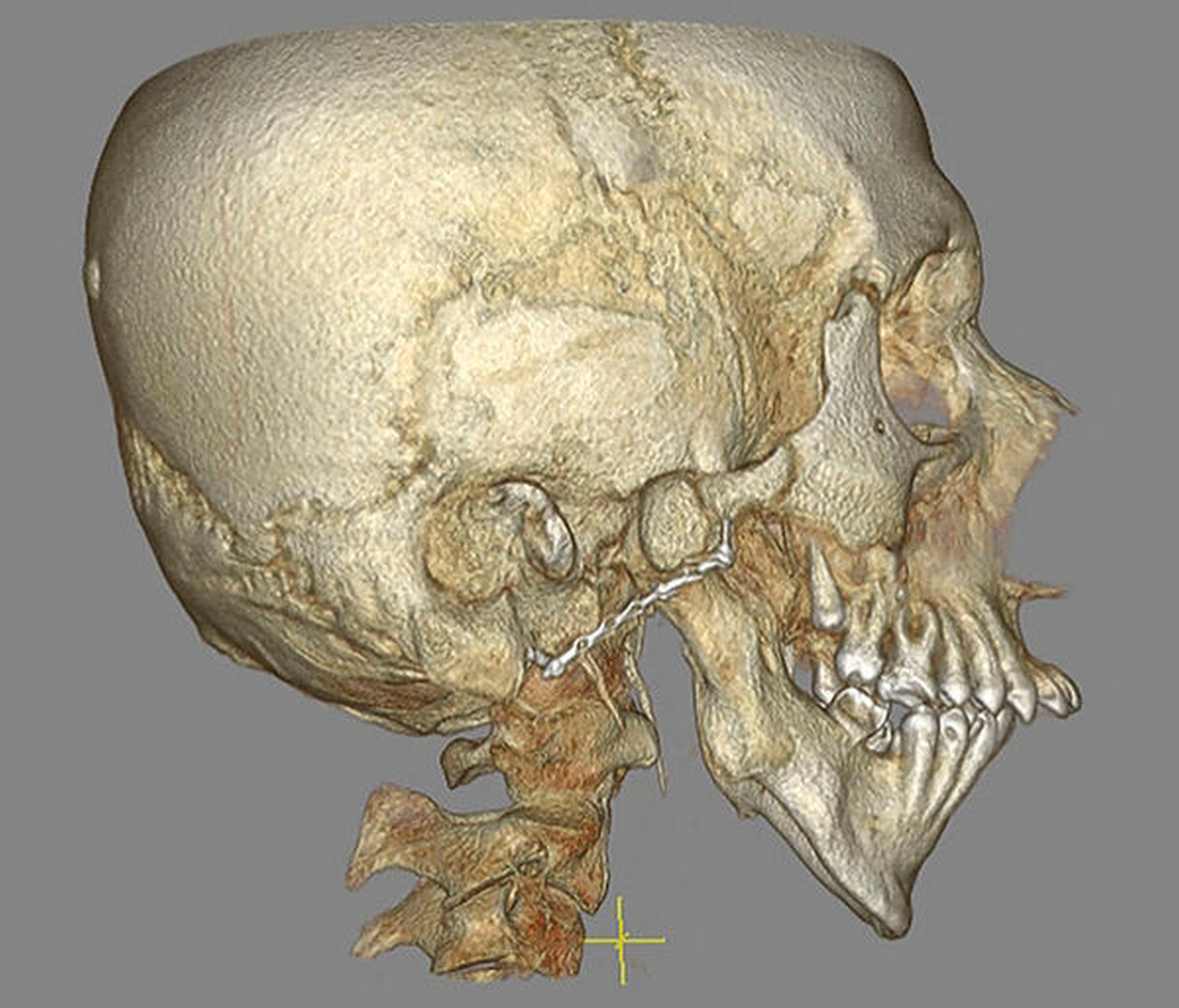 Aus der Krankengeschichte des Patienten ergab sich eine im Jahr 2009 durchgeführte Operation mit costochondralem Kiefergelenksersatz rechts aufgrund einer fortgeschrittenen Kiefergelenksarthrose infolge eines Sturzereignisses mit beidseitig unbehandelter Collumfraktur im Kindesalter. Eine noch am Tag der Erstvorstellung durchgeführte DVT-Untersuchung zur Beurteilung der Kiefergelenke bei ausgeprägter Unterkieferhypomobilität bestätigte die Verdachtsdiagnose einer Kiefergelenksankylose Typ IV rechts und Typ III links nach Sawhney [Sawhney, 1986] beziehungsweise Wilkes Typ V [Wilkes, 1989] beidseits (Abbildung 2).