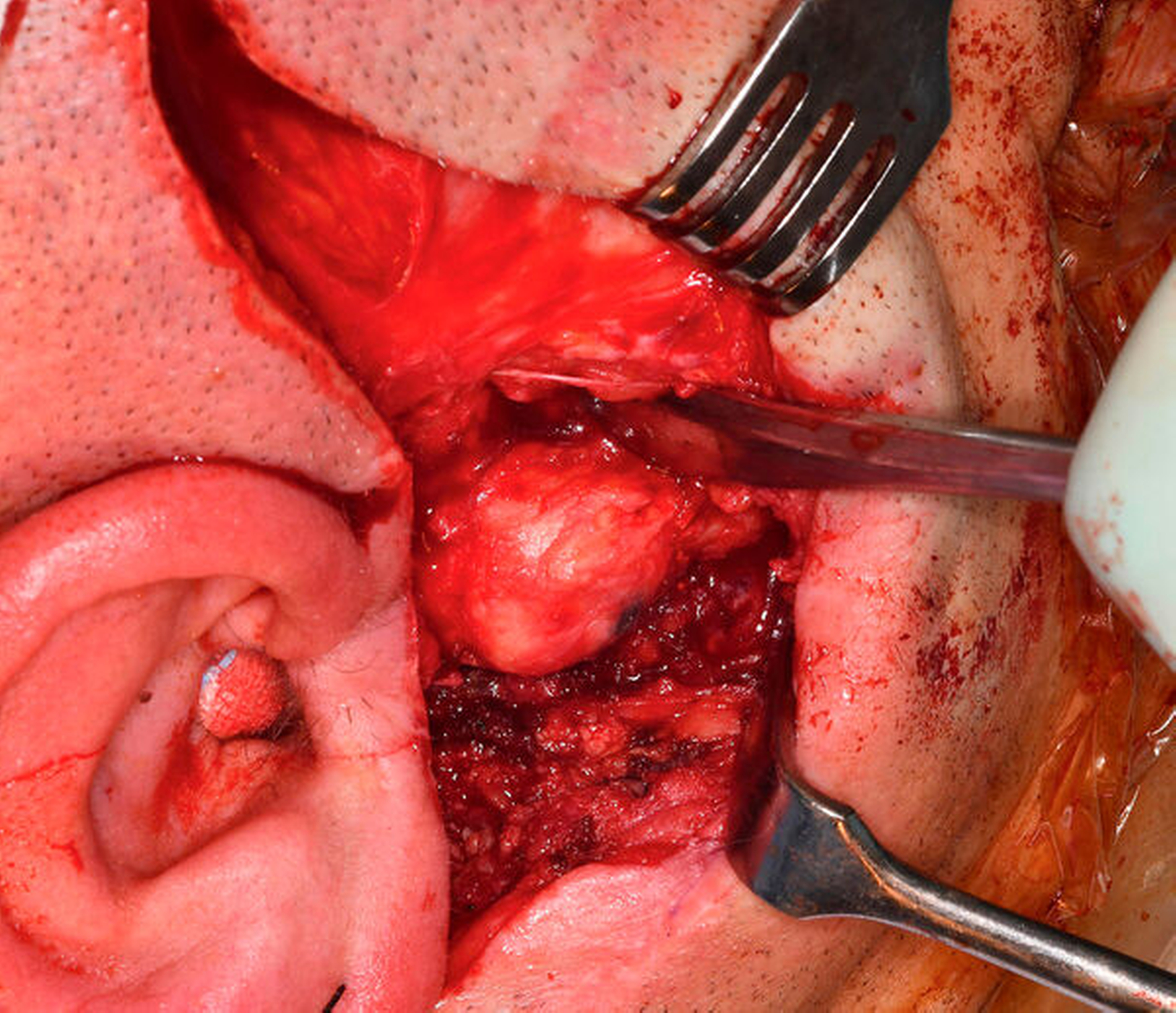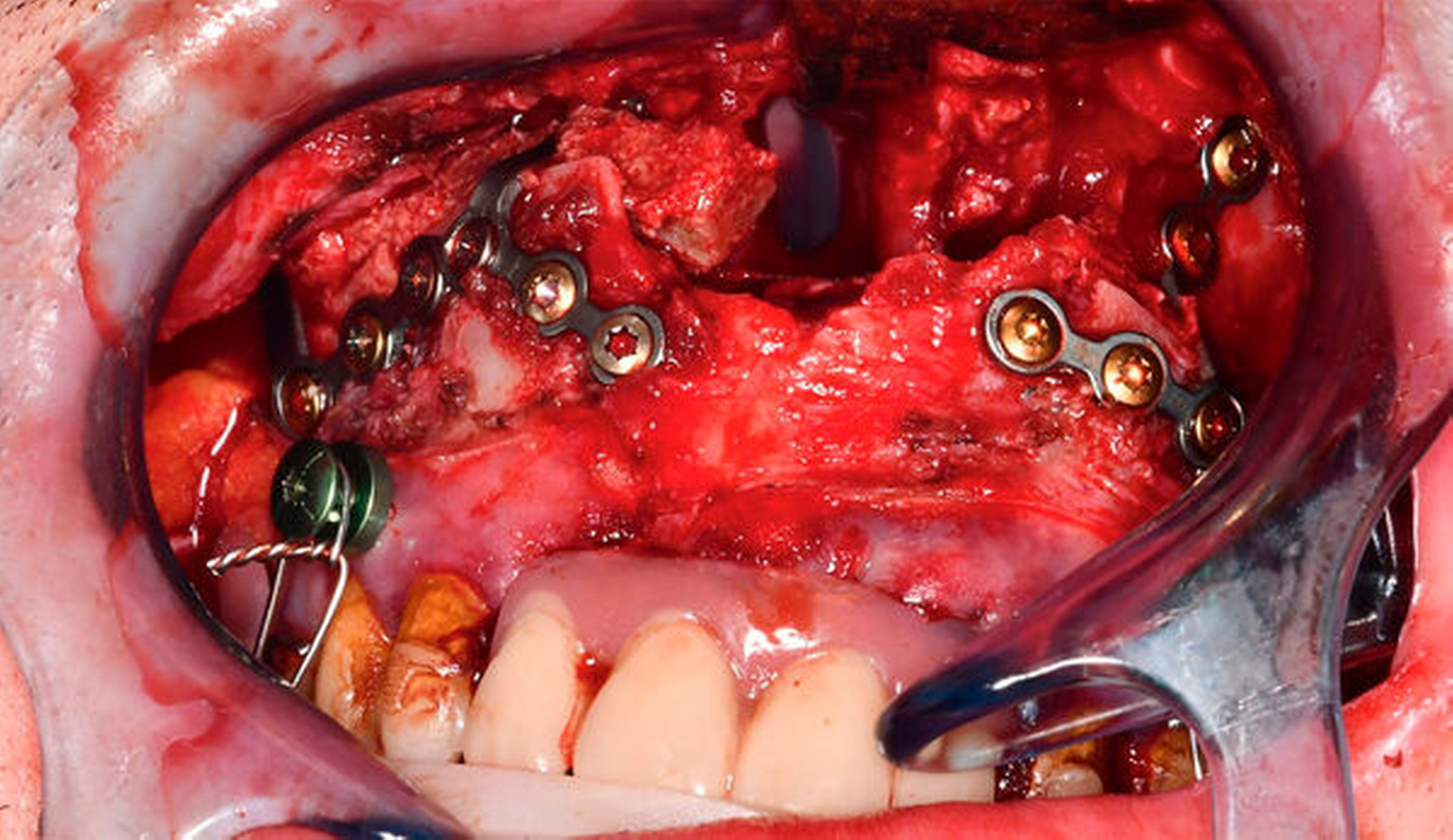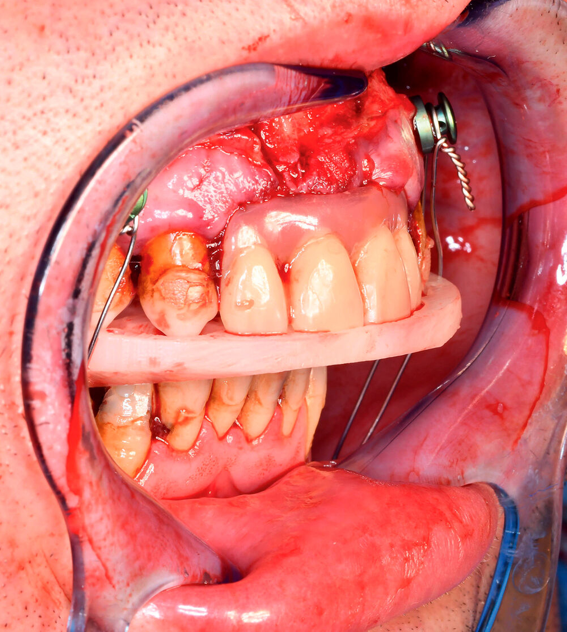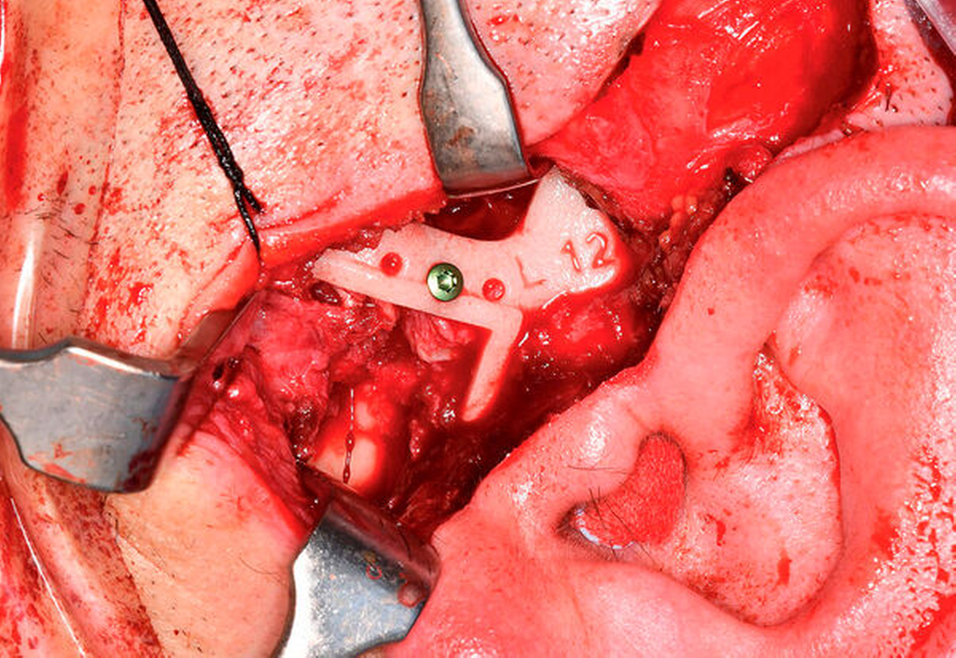 Nach Extraktion der nicht erhaltungswürdigen Zähne 17, 16, 12–27, 36, 46 und 47 und Eingliederung der präformierten Ober- und Unterkiefer-Intermediatprothese folgte die Oberkieferosteotomie in der Le-Fort-I-Ebene mit Neuausrichtung und Osteosynthese unter Verwendung eines CAD/CAM-gefertigten Okklusions-Zwischensplints. Ein zeitgleich gehobener und als Interpositionsosteoplastik eingebrachter kortikospongiöser Knochenspan vom Beckenkamm diente zur Vergrößerung der knöchernen Anlagerungsfläche nach Oberkiefervorverlagerung (Abbildung 4). Die anschließende Darstellung des rechten Kiefergelenks erfolgte über die Extension des präaurikulären Zugangs entlang der vorbestehenden Narbe nach retromandibulär, die Darstellung des linken Kiefergelenks über einen nach parietal extendierten präaurikulären und zusätzlich retromandibulären Zugang.
