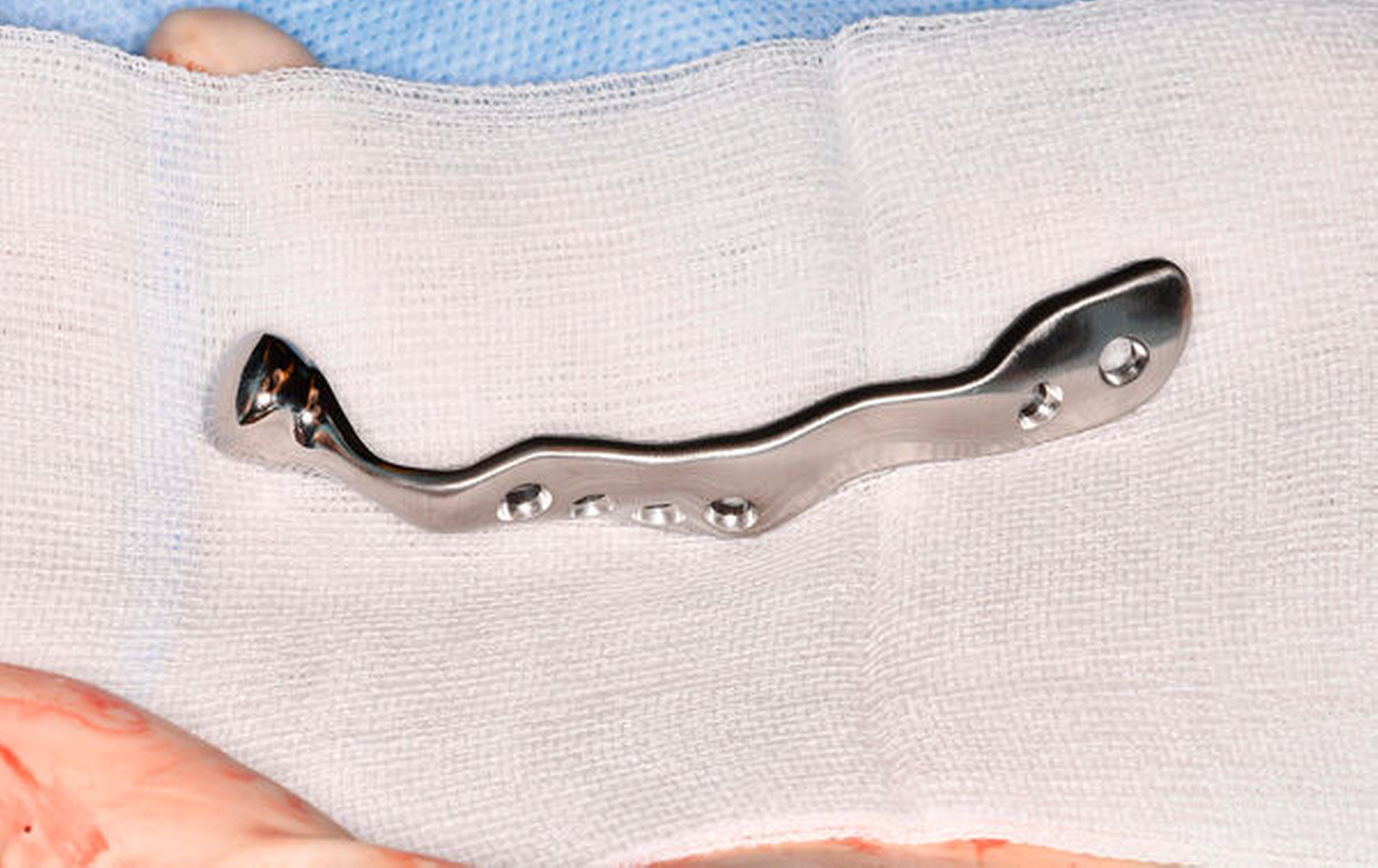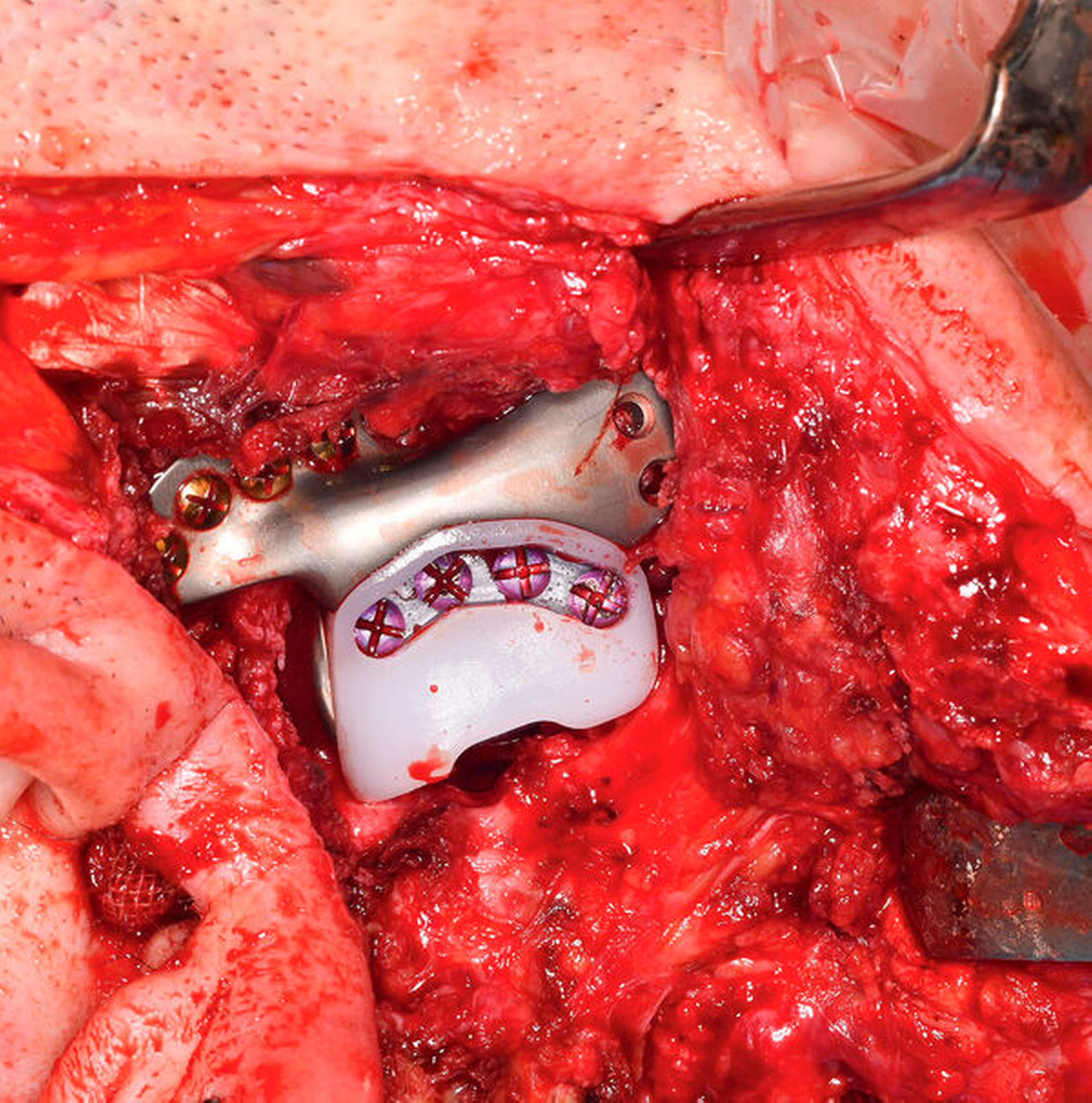 Danach erfolgte die beidseitige Abtragung der Ankylosemasse und die Resektion der deformierten Kiefergelenke mit modellierender Glättung der Jochbogenunterseite zur Schaffung einer Anlagefläche für die anschließend eingebrachten Fossakomponenten (Zimmer Biomet Holdings, Warsaw, Indiana, USA) (Abbildung 5). Nach Eingliederung der Unterkiefer-Intermediatprothese sowie des Zielokklusionssplints konnten die patientenspezifischen Kiefergelenk-Endoprothesen (Zimmer Biomet Holdings, Warsaw, Indiana, USA) (Abbildung 6) problemlos eingebracht und mit Osteosyntheseschrauben am ortsständigen Unterkiefer fixiert werden.