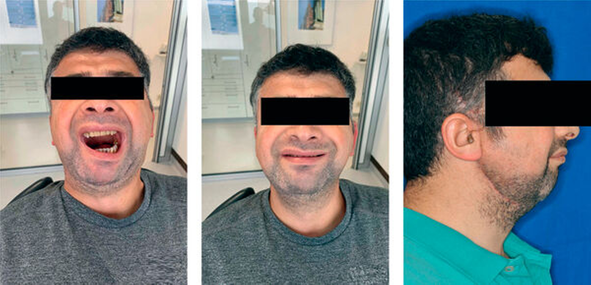 Im August 2019 stellte sich ein 37-jähriger Patient in der ambulanten Sprechstunde der Mund-, Kiefer- und Gesichtschirurgie der Universitätsmedizin Mainz nach Überweisung durch seinen Hauszahnarzt und der Bitte um Therapieübernahme bei notwendiger Zahnsanierung vor. Bei der klinischen Untersuchung zeigte sich eine ausgedehnte Sanierungsbedürftigkeit der Zähne bei skelettaler Klasse II mit 7 mm Distalbisslage und einer mit 1 cm maximalen Schneidekantendistanz (SKD-max.) stark eingeschränkten Mundöffnung (Abbildung 1). Nebenbefundlich litt der auf Unterarmgehstützen angewiesene Patient bei einem Körpergewicht von 120 kg und einer Körpergröße von 170 cm an einer Adipositas per magna (BMI > 40), belastungsabhängiger Dyspnoe und einem obstruktiven Schlafapnoesyndrom bei verkleinertem posteriorem „airway space“, was den Patienten zum Schlafen in aufrechter Position zwang.