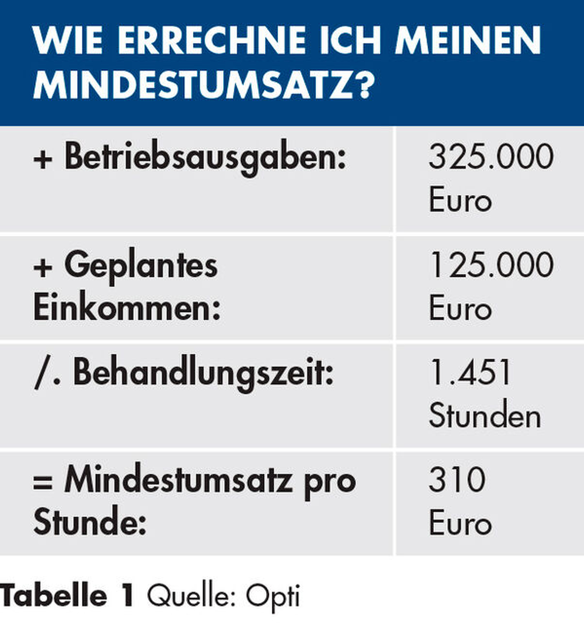 Das Minimalziel Ihrer Praxis sollte sein, kostendeckend zu arbeiten und Ihr geplantes Einkommen zu erwirtschaften. Addieren Sie dazu die geplanten Betriebsausgaben aus Ihrem Businessplan und Ihr kalkuliertes Gehalt. Diese Summe teilen Sie (Tabelle 1) durch Ihre von Ihnen individuell geplante Behandlungszeit oder durch die durchschnittliche Behandlungszeit eines Praxisinhabers pro Jahr (1.451 Stunden laut KZBV-Jahrbuch 17/18).