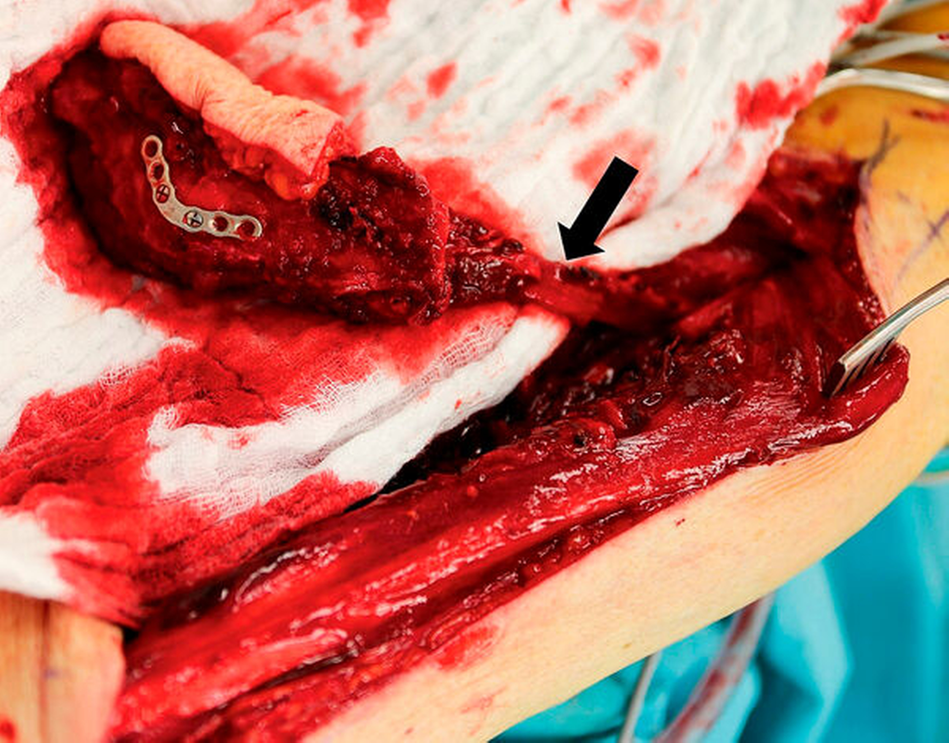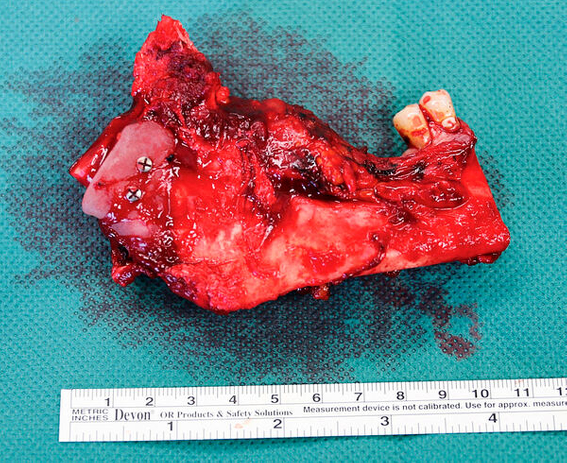 In Intubationsnarkose erfolgte nach temporärer Tracheotomie, zur Sicherung der Atemwege, die ipsilaterale selektive Neck-Dissection der Level I bis III mit anschließender schnellschnittkontrollierter radikaler Tumorresektion im Sinne einer Unterkieferkontinuitätsresektion. Die Osteotomien erfolgten dabei entsprechend der Cutting Guides. Abbildung 3 dokumentiert das resezierte Tumorhauptpräparat. Intraoperativ ergab sich kein Hinweis auf pathologisch verändertes Lymphgewebe, so dass auf eine Erweiterung der Neck-Dissection verzichtet wurde. Parallel zur Tumorresektion erfolgte unter temporärer Einbringung der entsprechenden Cutting Guides die Hebung eines zweisegmentalen Fibulatransplantats mit Hautinsel von rechts (Abbildung 4). Beide Segmente wurden vor der Transplantatabsetzung bereits osteosynthetisch verbunden. Das Transplantat wurde anschließend unter dem Operationsmikroskop mikrovaskulär an die rechte A. und V. facialis End-zu-End reanastomosiert.